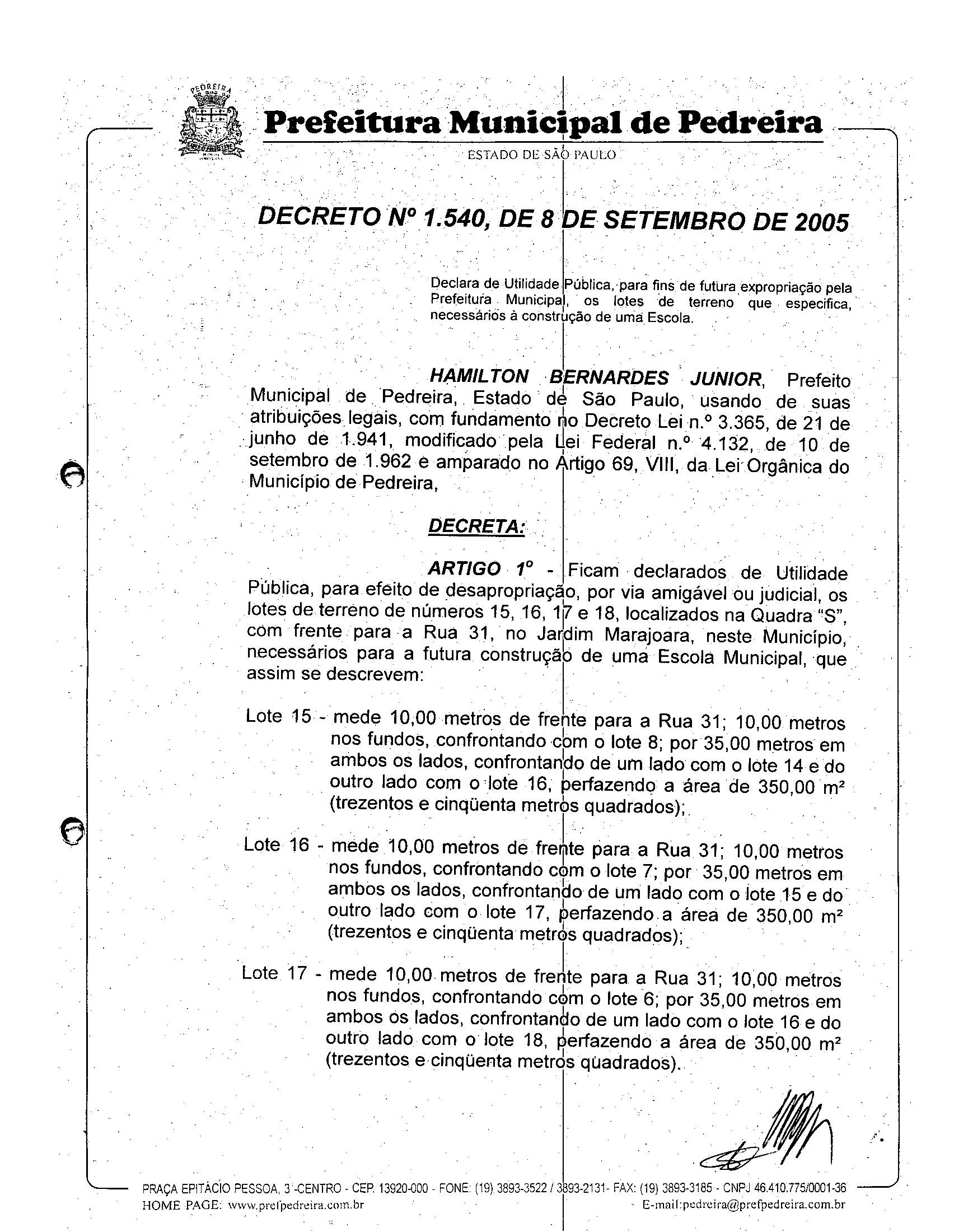 Ementa: Declara de Utilidade Pública, para fins de futura expropriação pela Prefeitura Municipal os lotes de terreno que especifica necessários a construção de uma Escola.