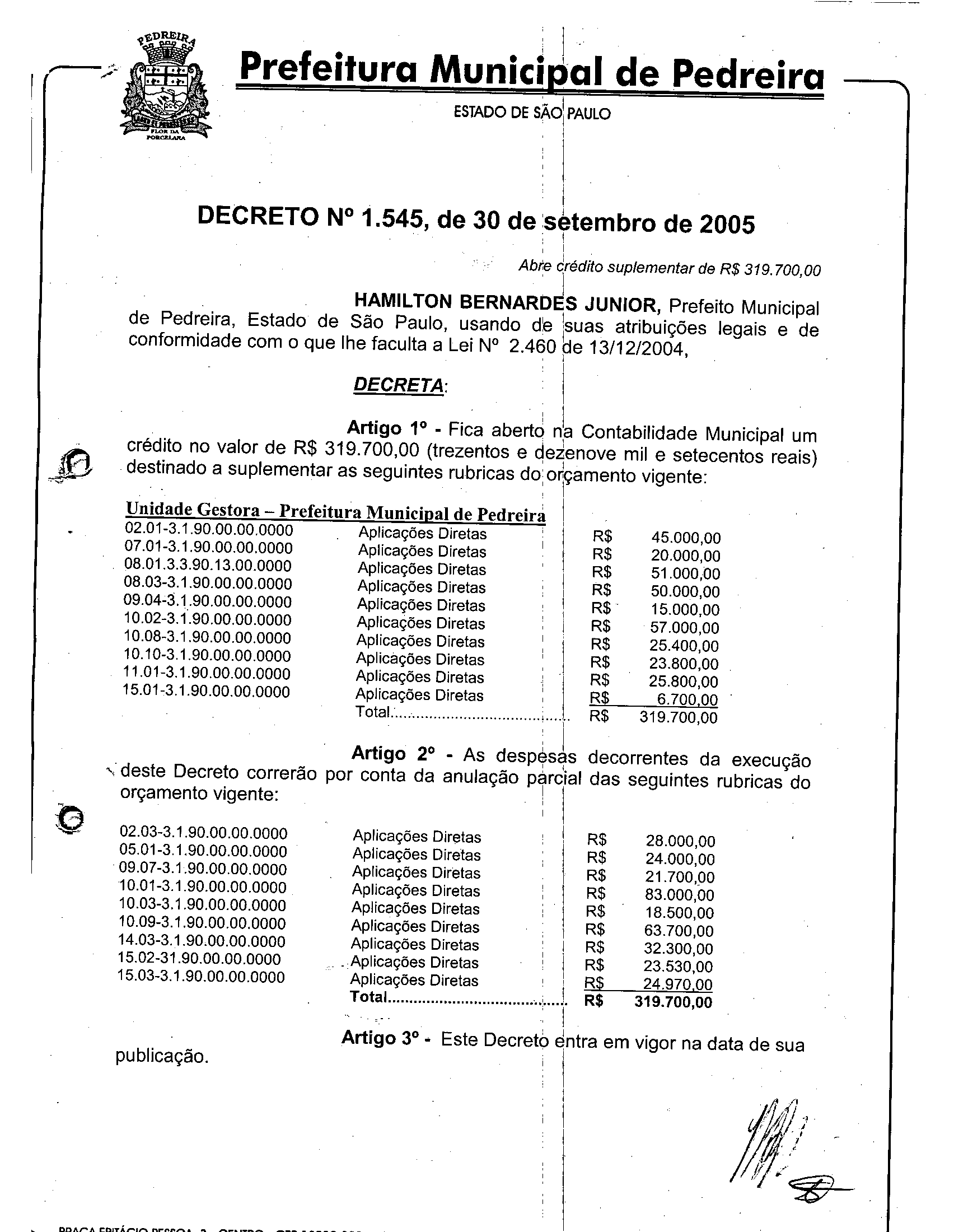 Ementa: Abre crédito suplementar de R$319.700,00.
