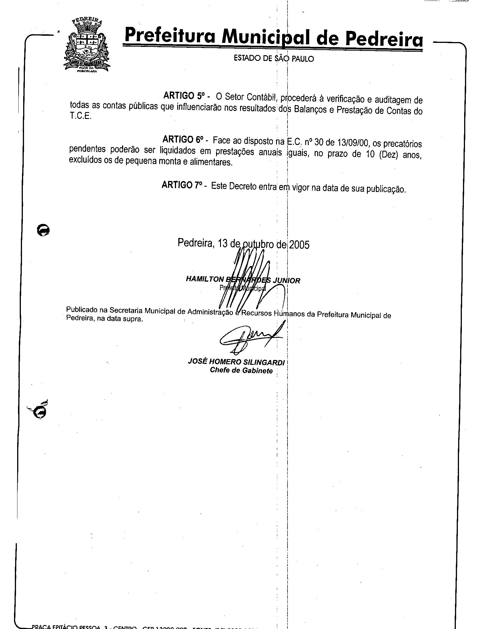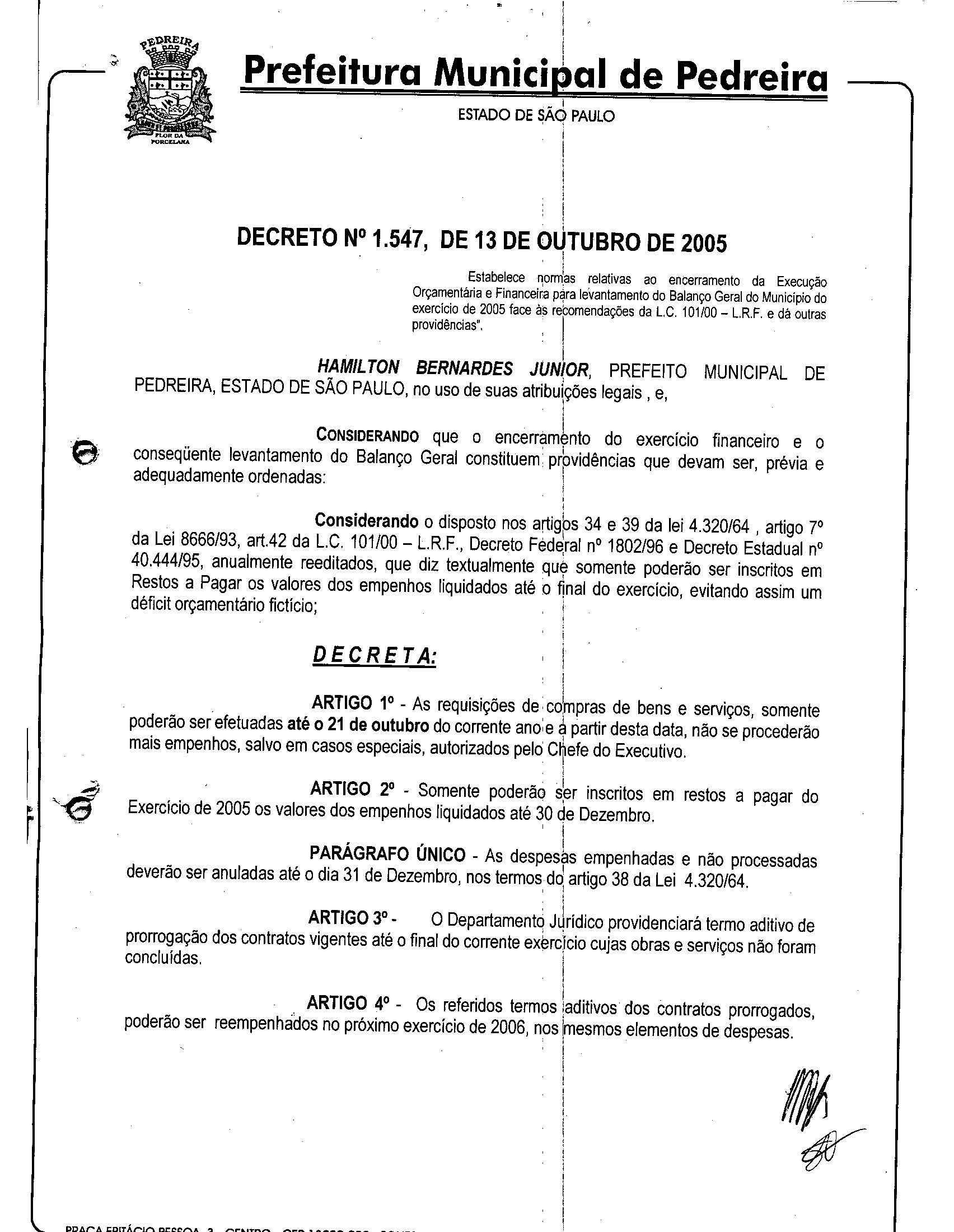 Ementa: Estabelece normas relativas ao encerramento da Execução Orçamentária e Financeira pára levantamento do Balanço Geral do Município do exercício de 2005 face às recomendações da L.C. 101/00 - L.R.F. e dá outras providências".