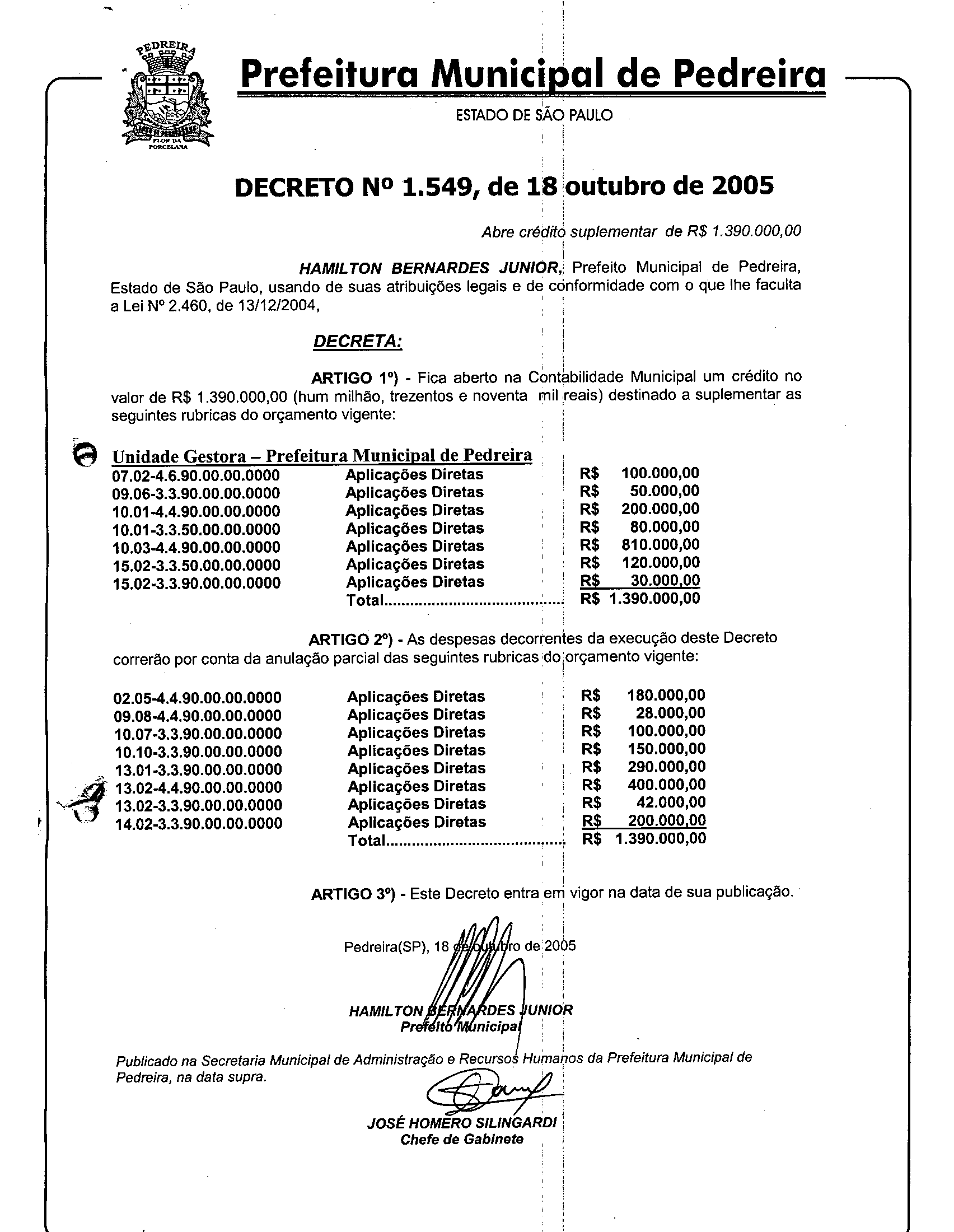 Ementa: Abre crédito suplementar de R$ 1.390.000,00.