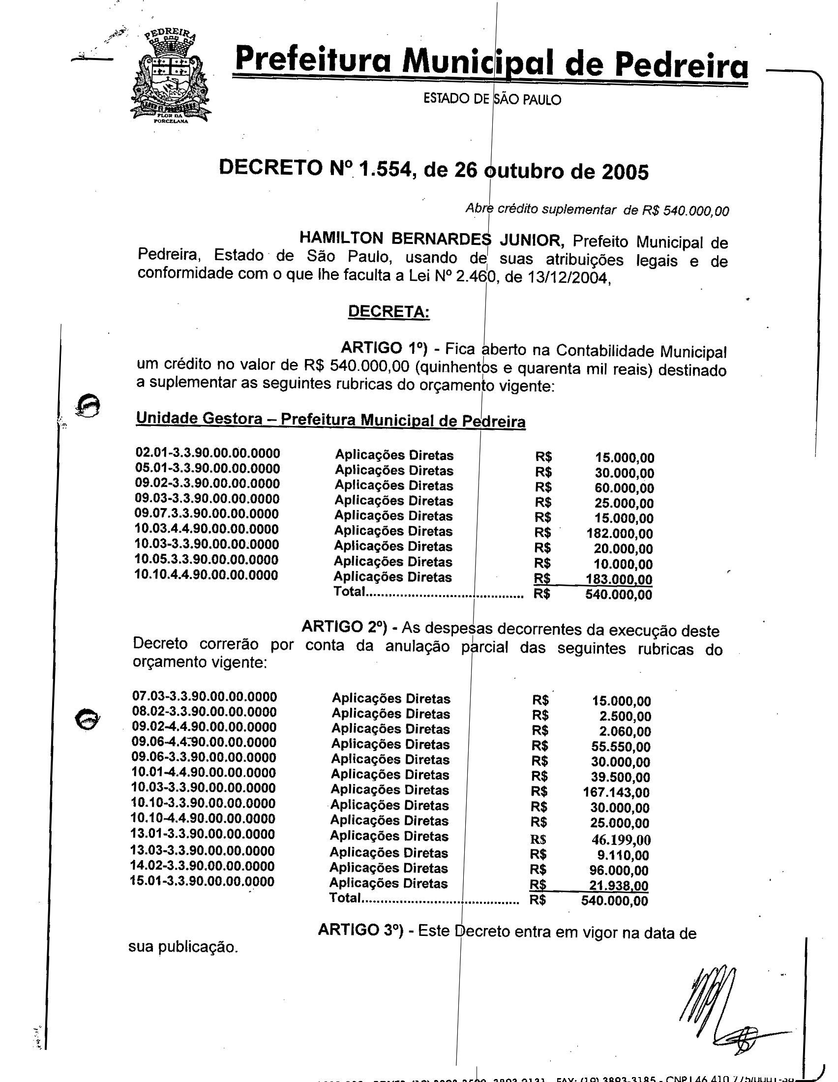 Ementa: Abre crédito suplementar de R$ 540.000,00.