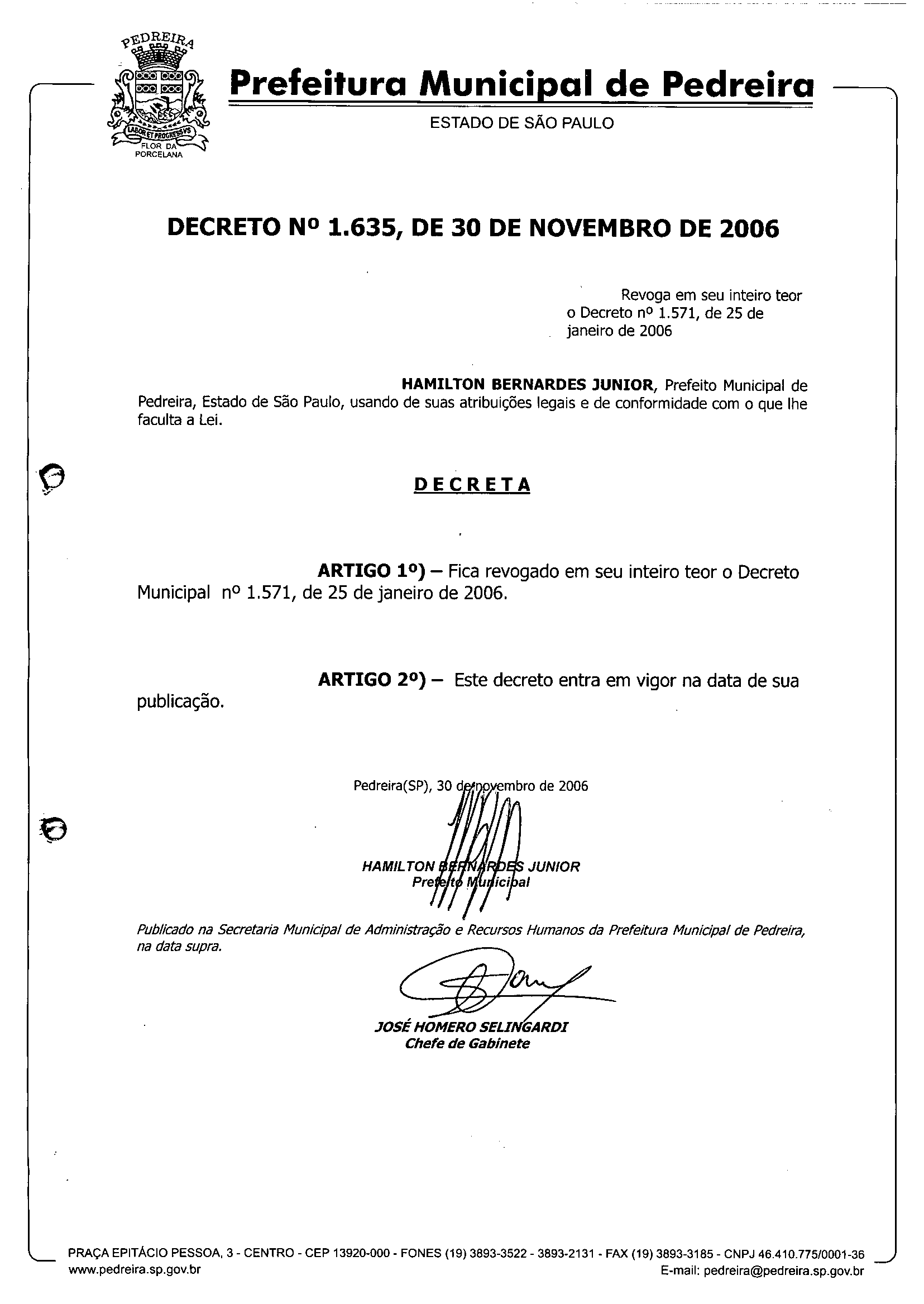 Ementa: Revoga em seu inteiro teor o Decreto n° 1.571, de 25 de janeiro de 2006.