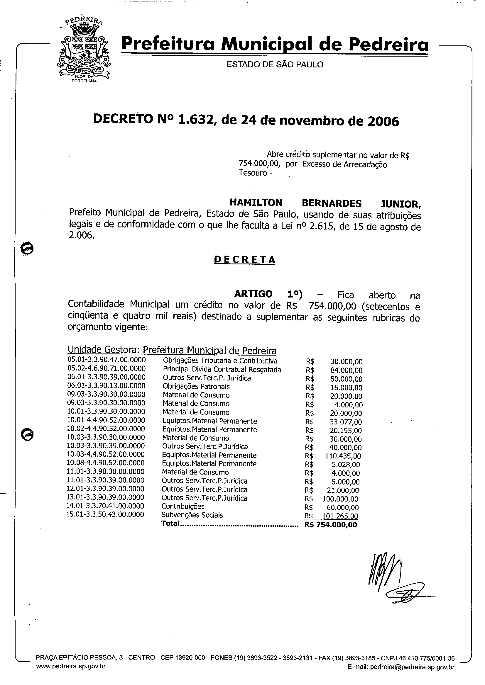 Ementa: Abre crédito suplementar no valor de R$ 754.000,00, por Excesso de Arrecadação -Tesouro.