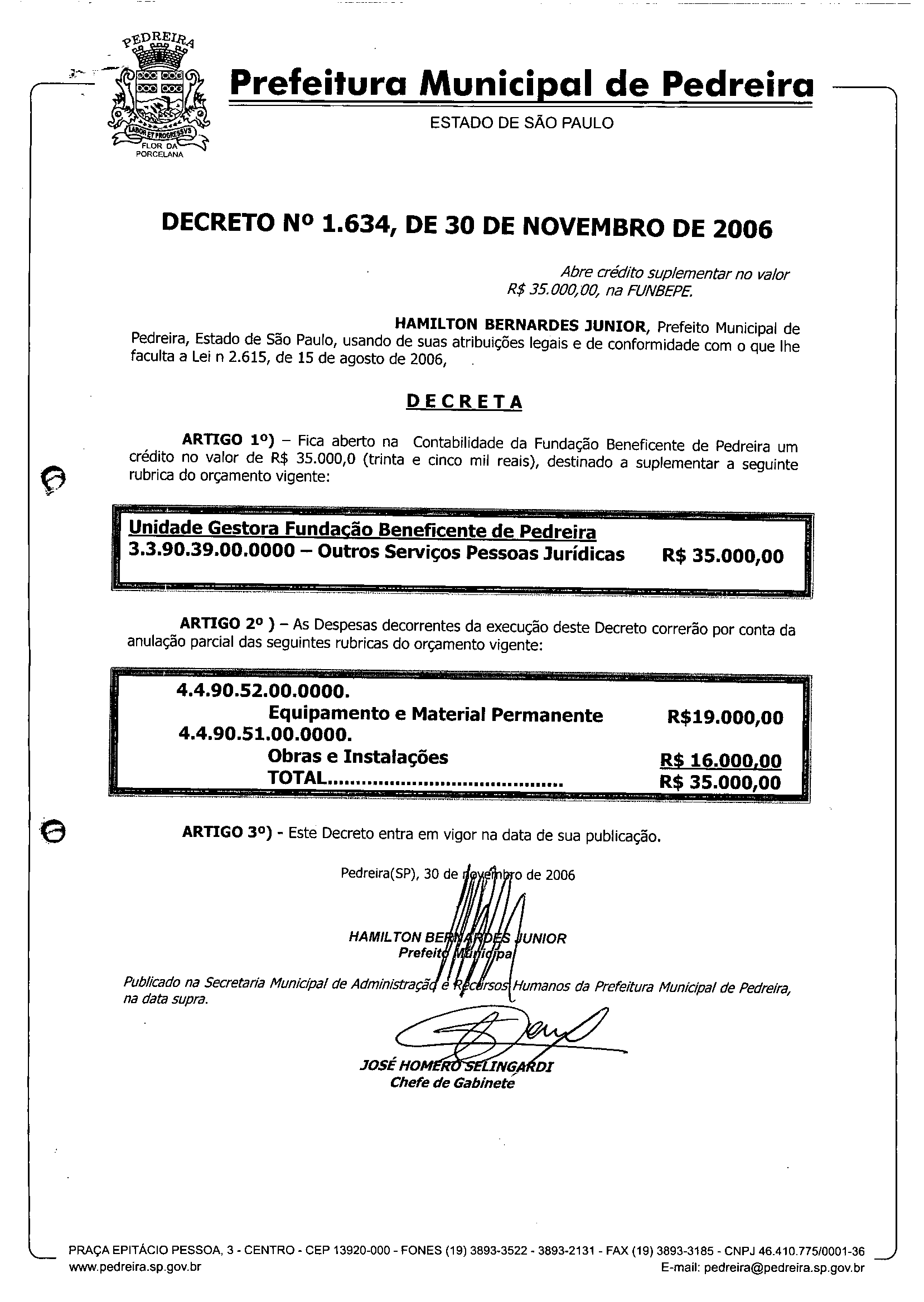 Ementa: Abre crédito suplementar no valor R$ 35.000,00, na FUNBEPE.