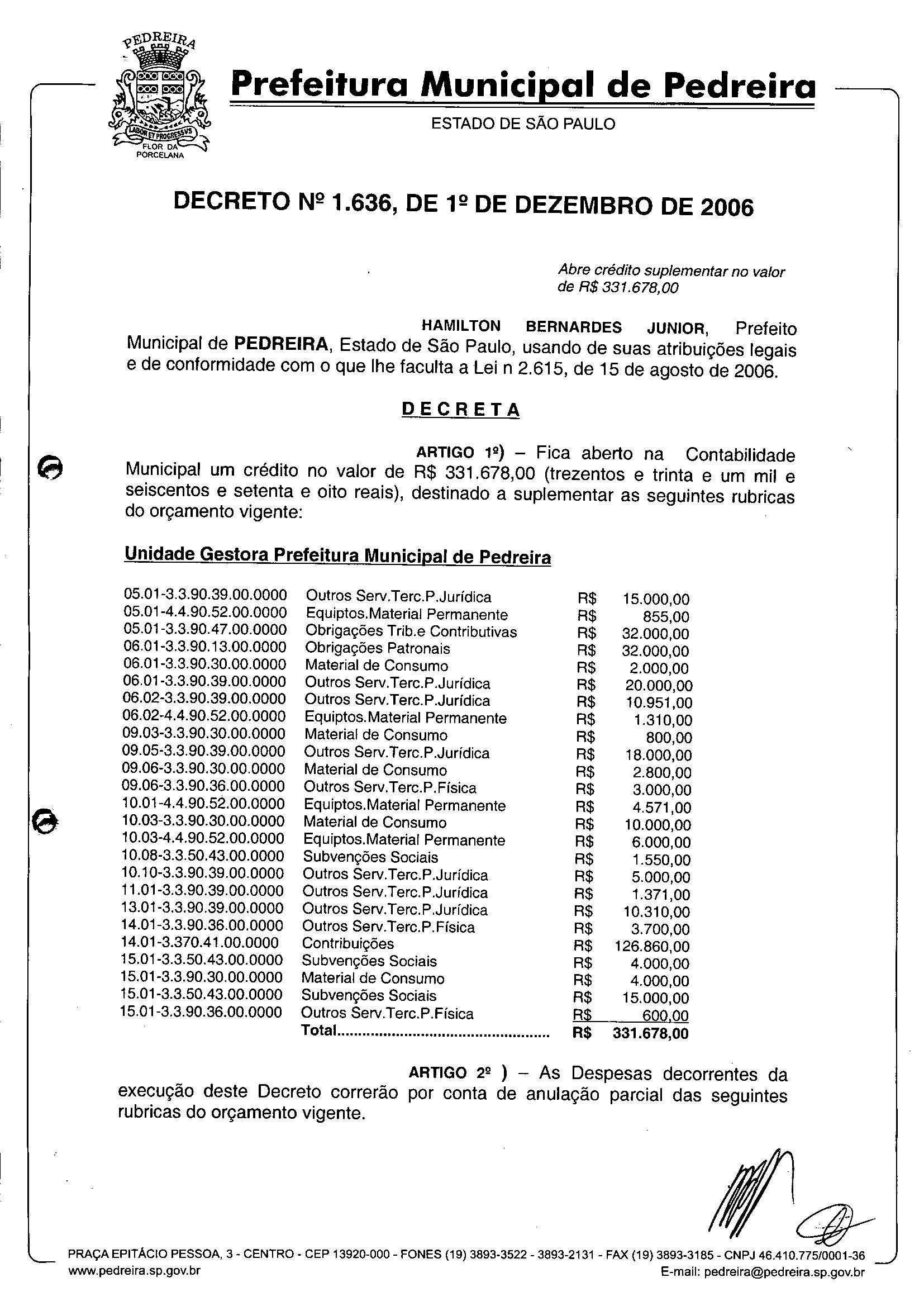 Ementa: Abre crédito suplementar no valor de R$ 331.678,00.