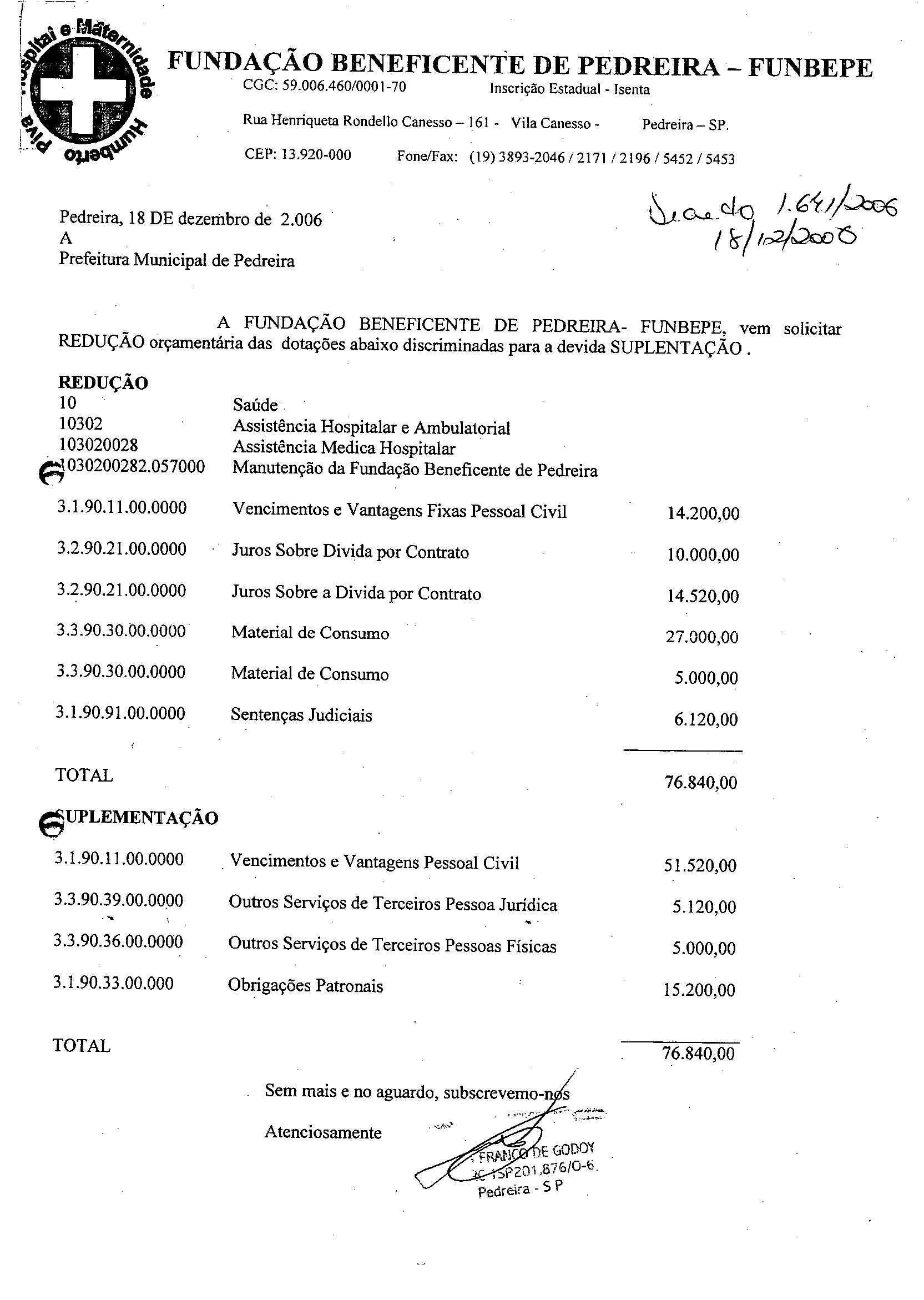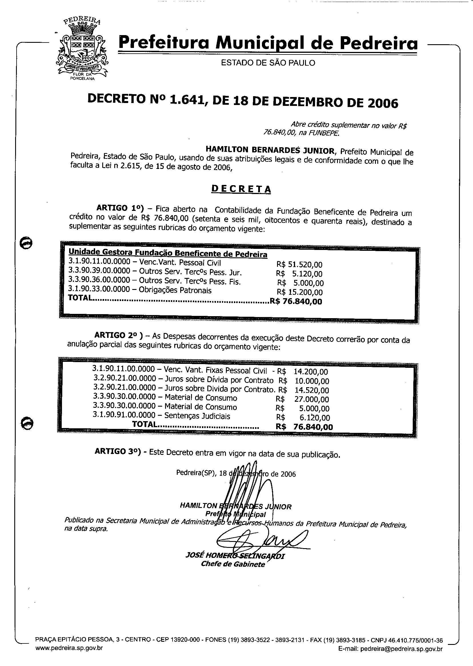 Ementa: Abre crédito suplementar no valor R$ 76.840,00, na FUNBEPE.