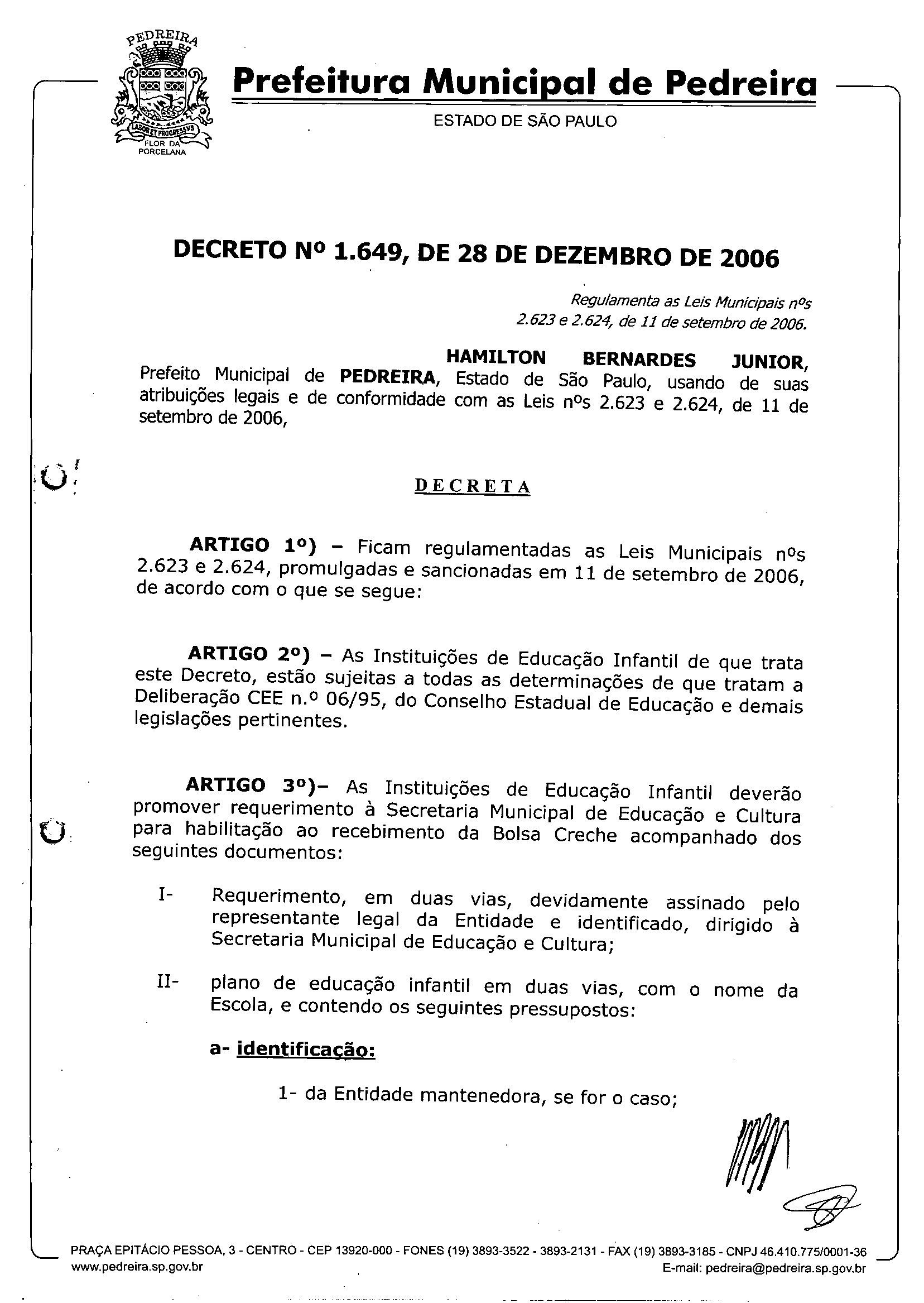 Ementa: Regulamenta as Leis Municipais n°s 2.623 e 2.624, de 11 de setembro de 2006.