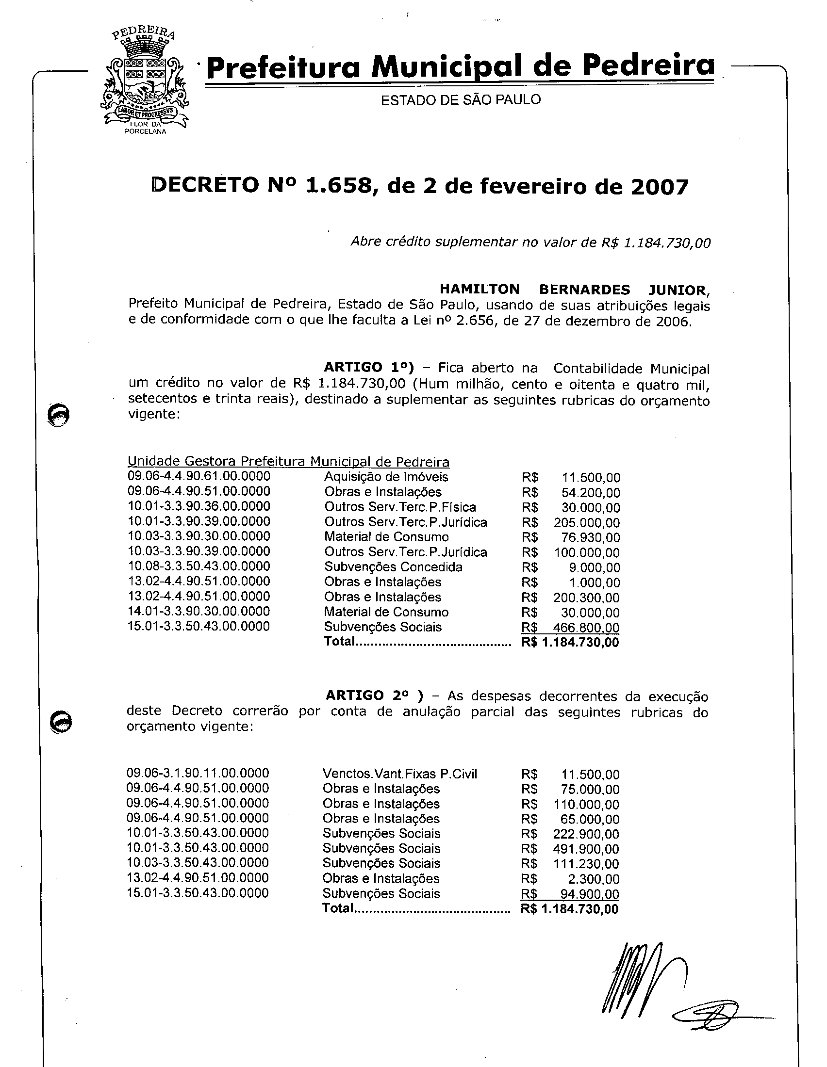 Ementa: Abre crédito suplementar no valor de R$ 1.184.730,00.