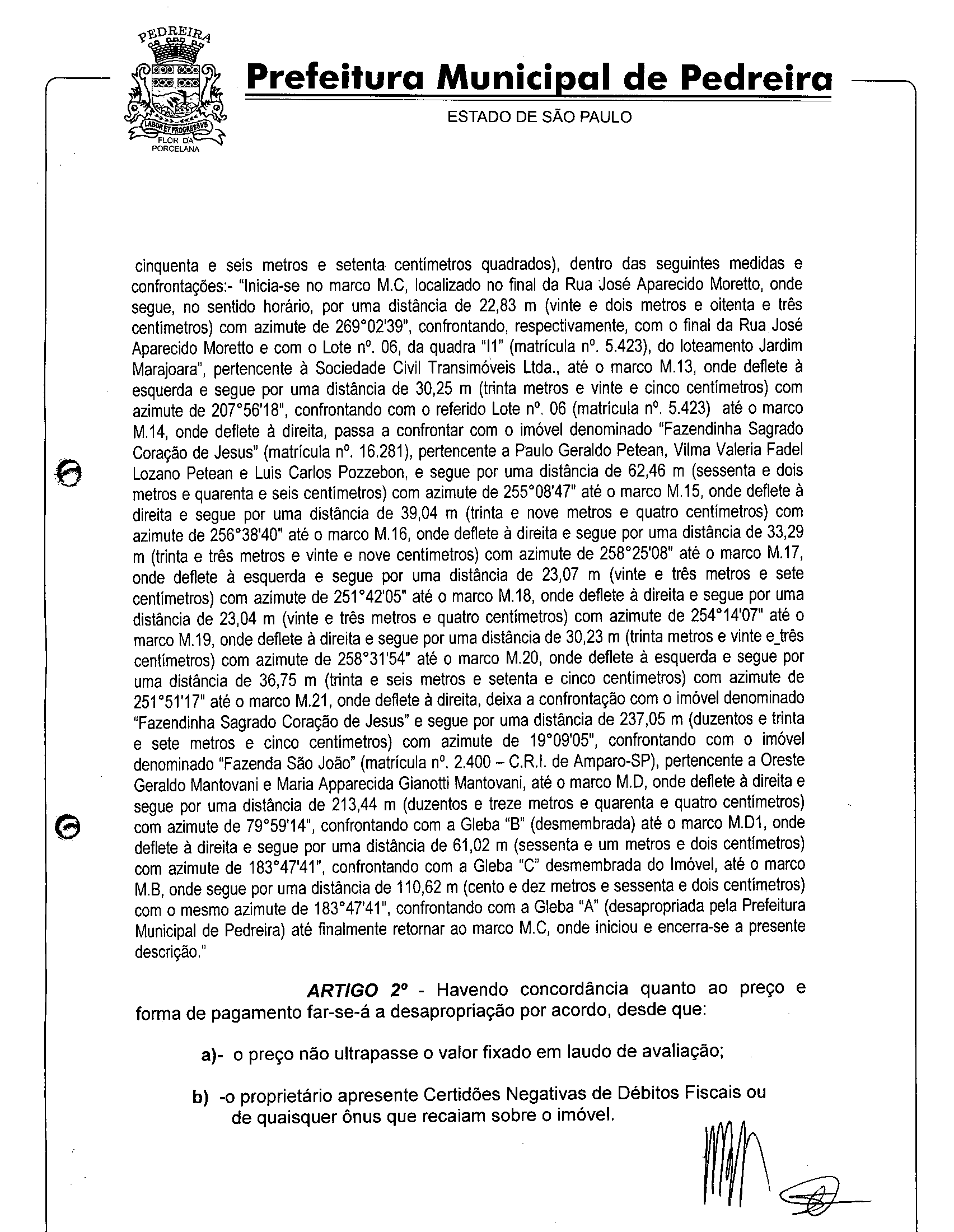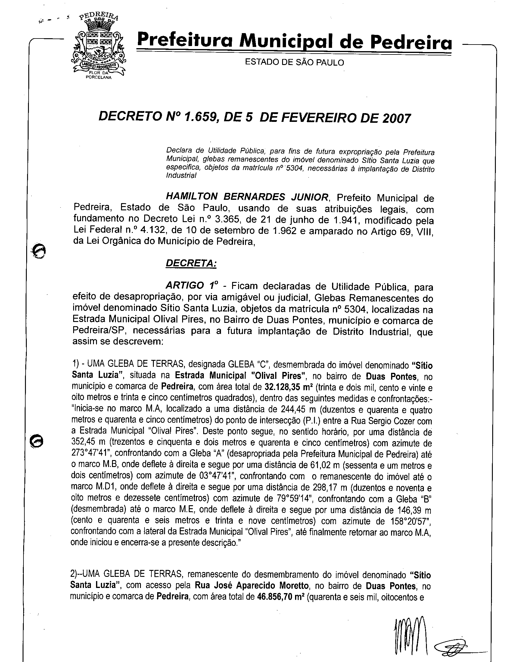 Ementa: Declara de Utilidade Pública, para fins de futura expropriação pela Prefeitura Municipal, glebas remanescentes do imóvel denominado Sítio Santa Luzia que especifica, objetos da matricula n° 5304, necessárias à implantação de Distrito Industrial.