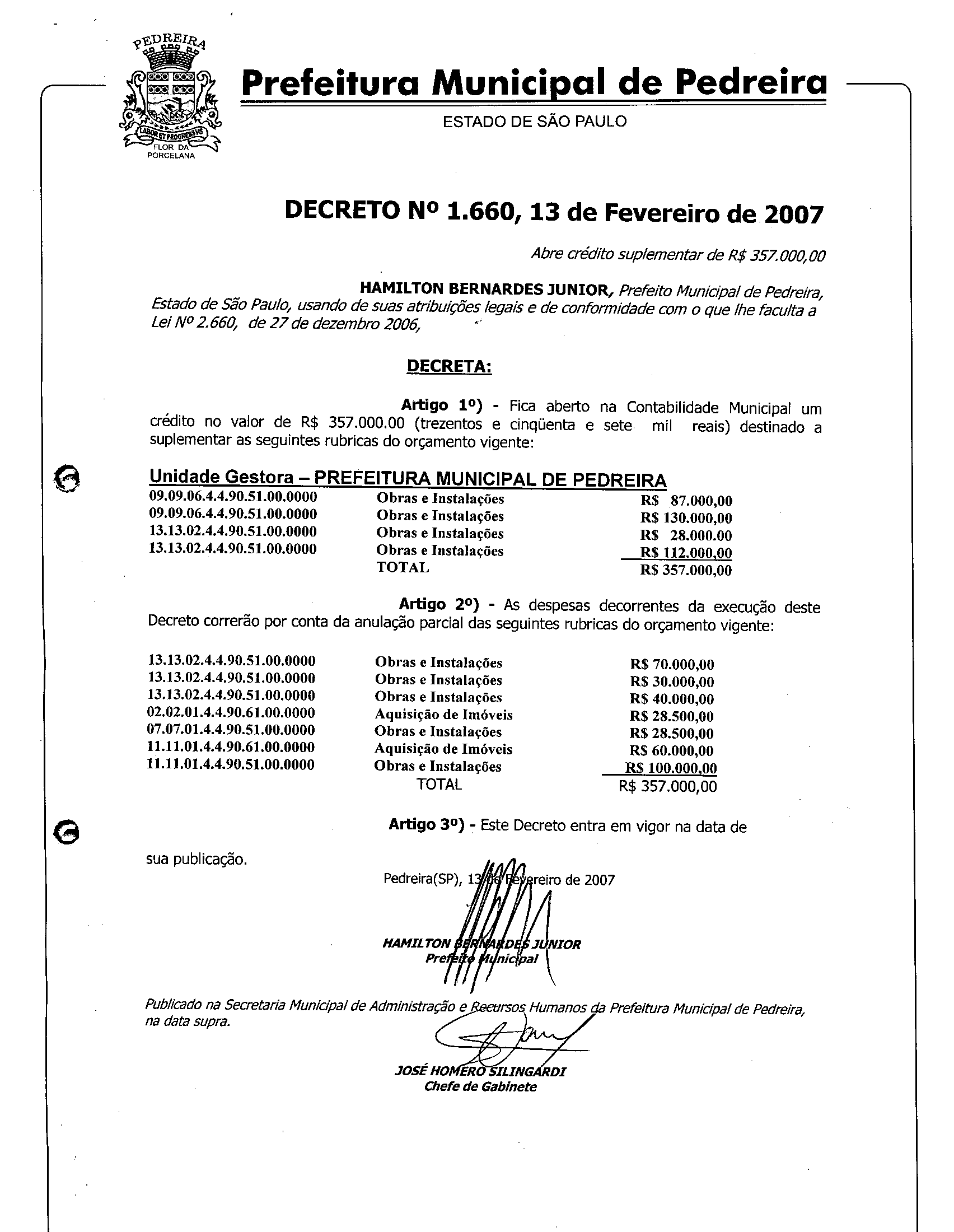 Ementa: Abre crédito suplementar de R$ 357.000,00.