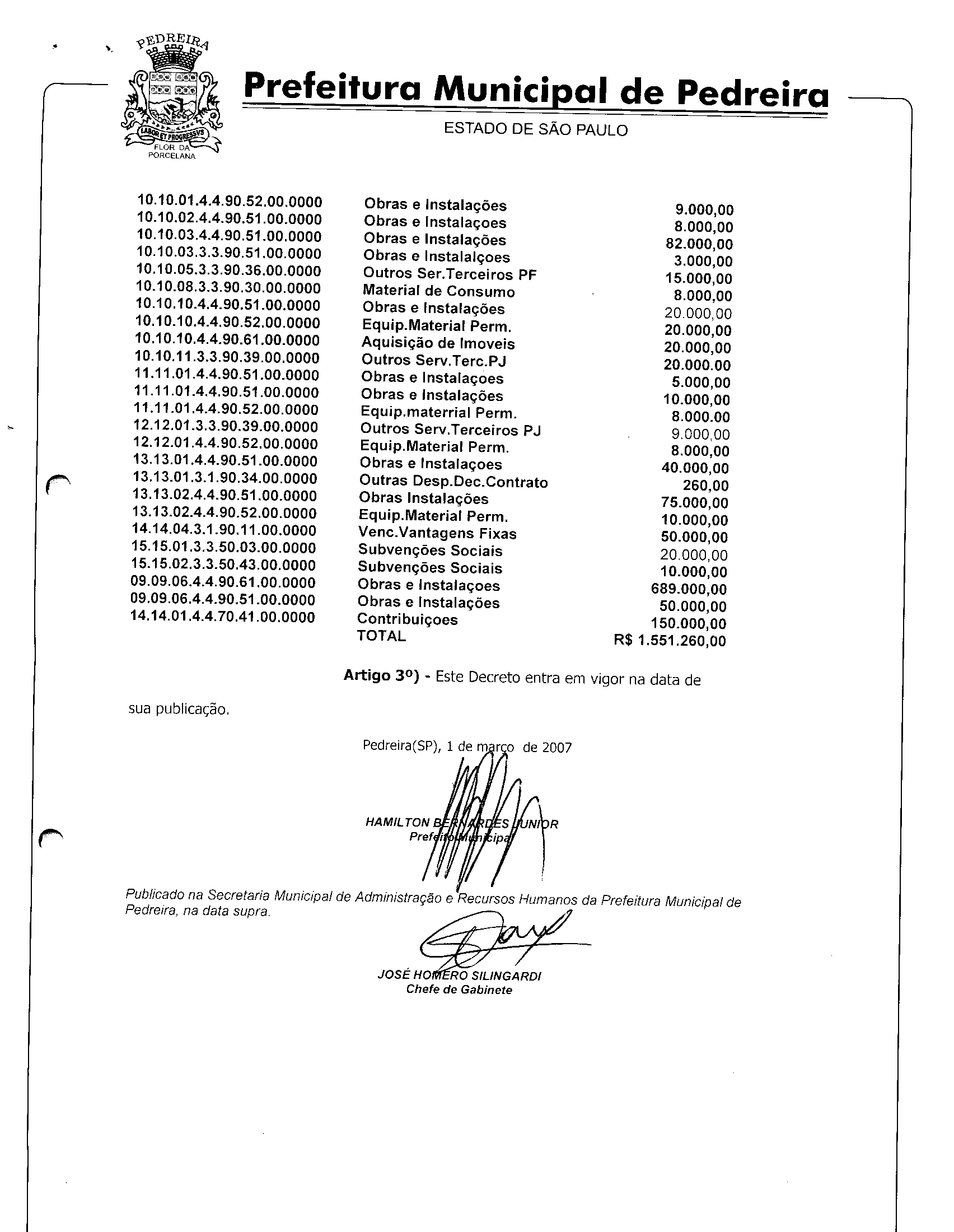 Ementa: Abre crédito suplementar de R$ 1.551.260,00.