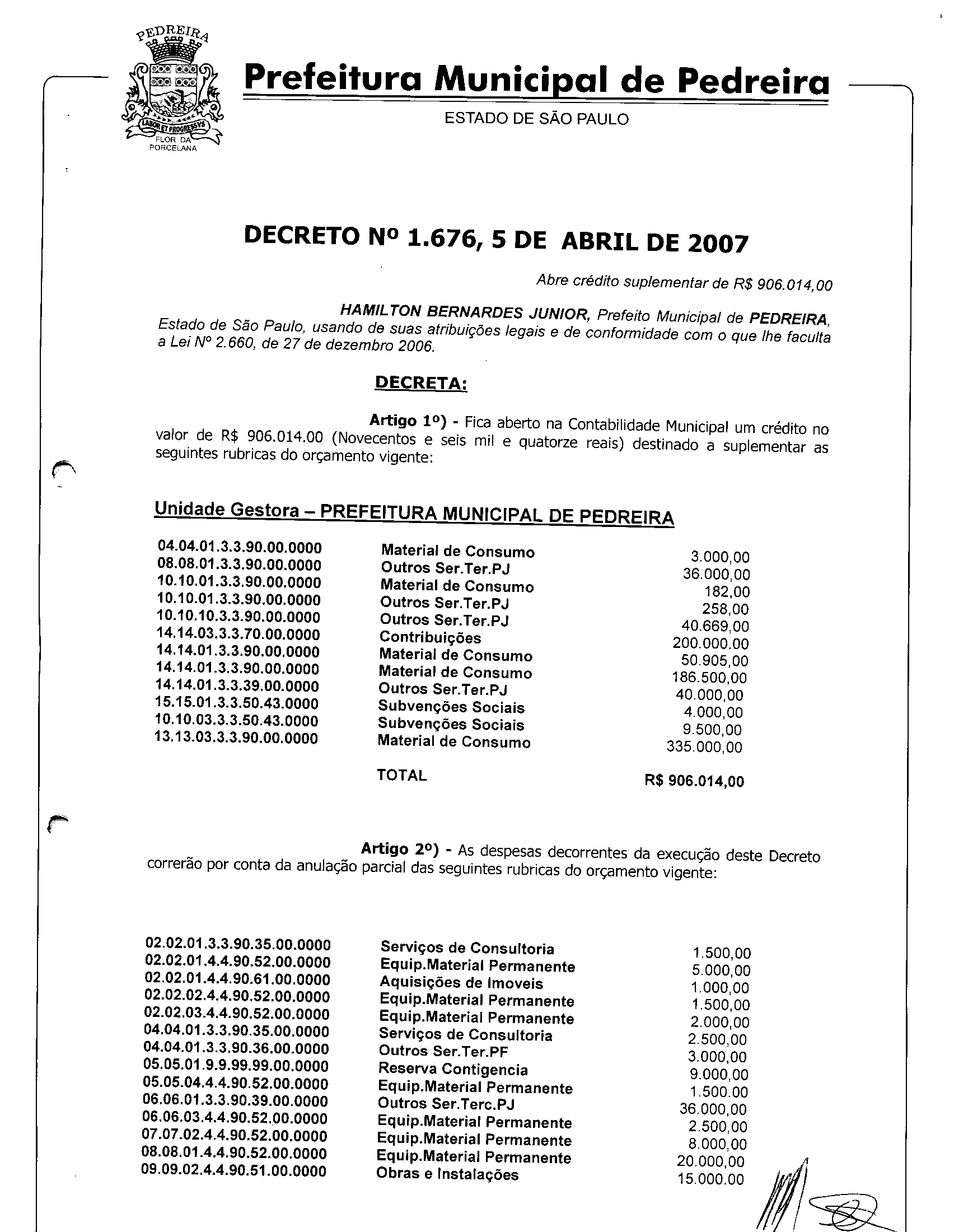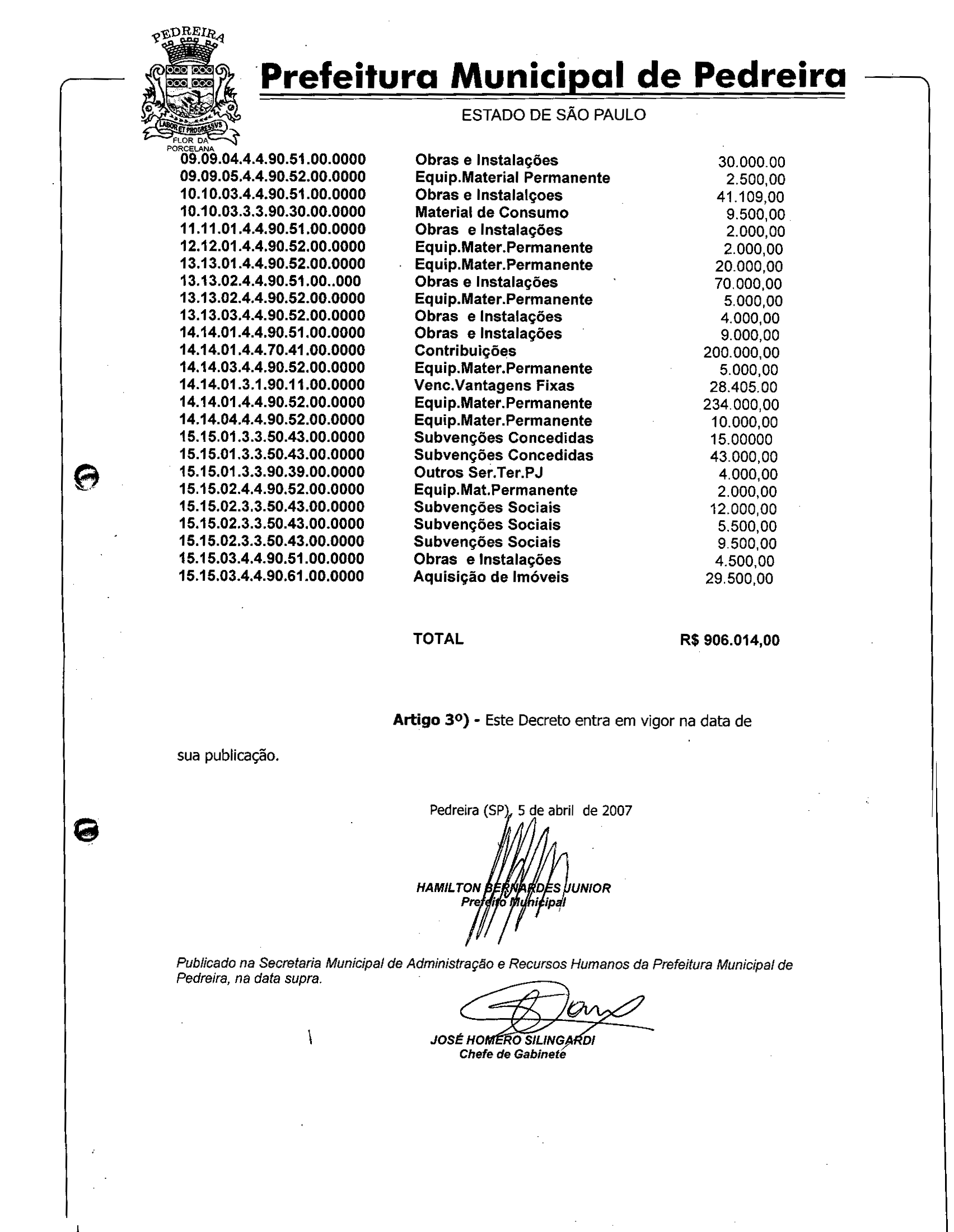 Ementa: Abre crédito suplementar de R$ 906.014,00.