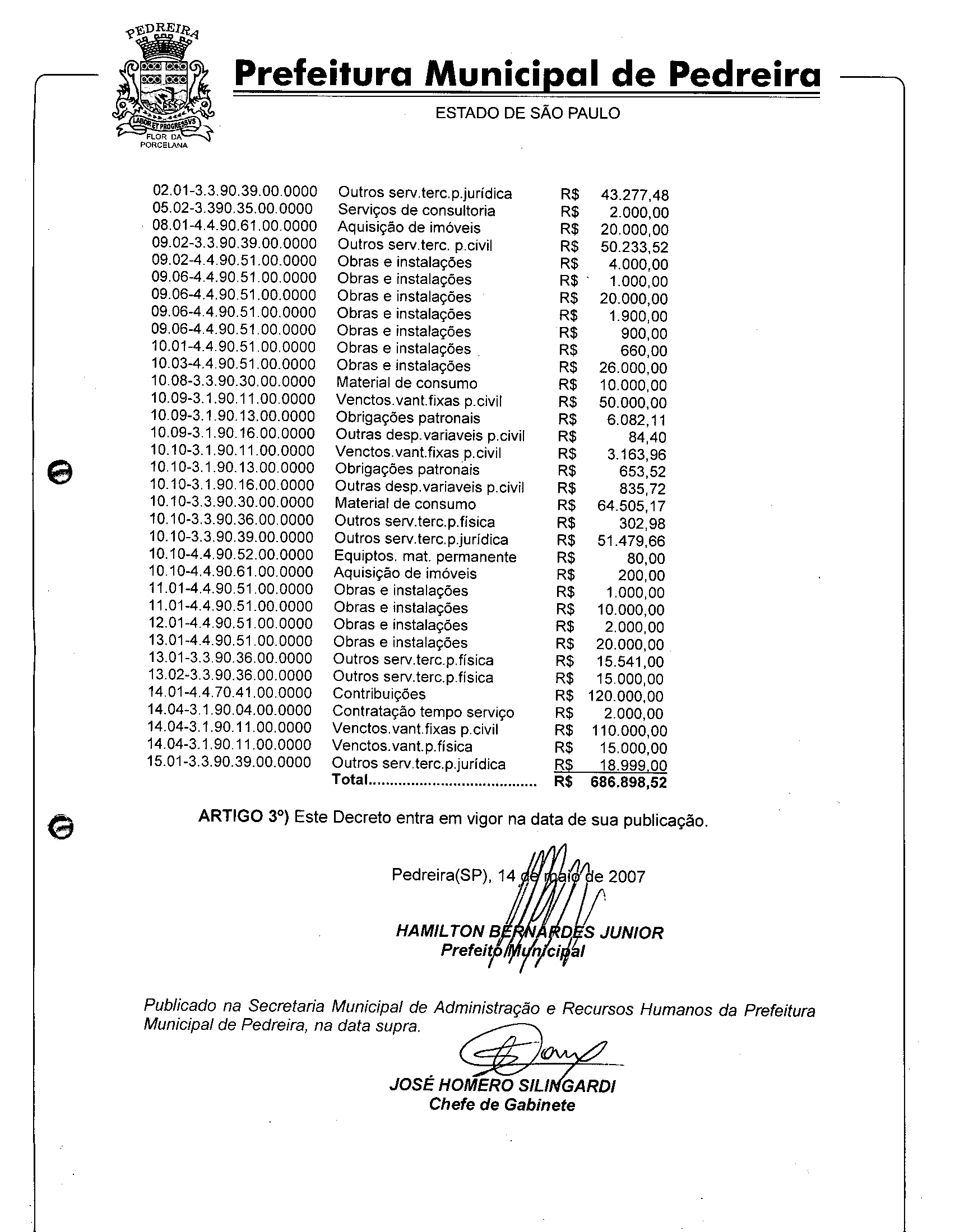 Ementa: Abre crédito suplementar no valor de R$ 686.898,52.