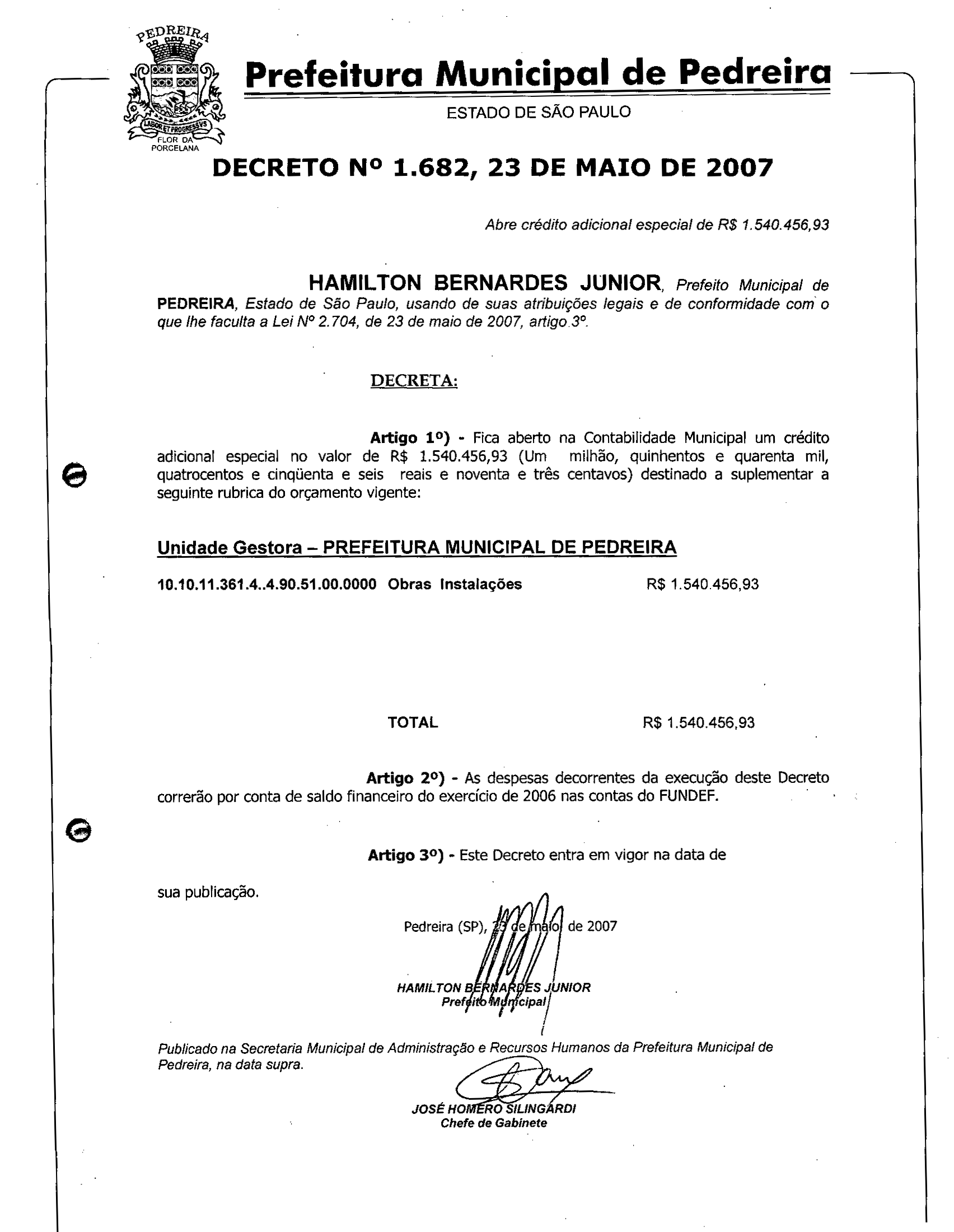 Ementa: Abre crédito adicional especial de R$ 1.540.456,93.