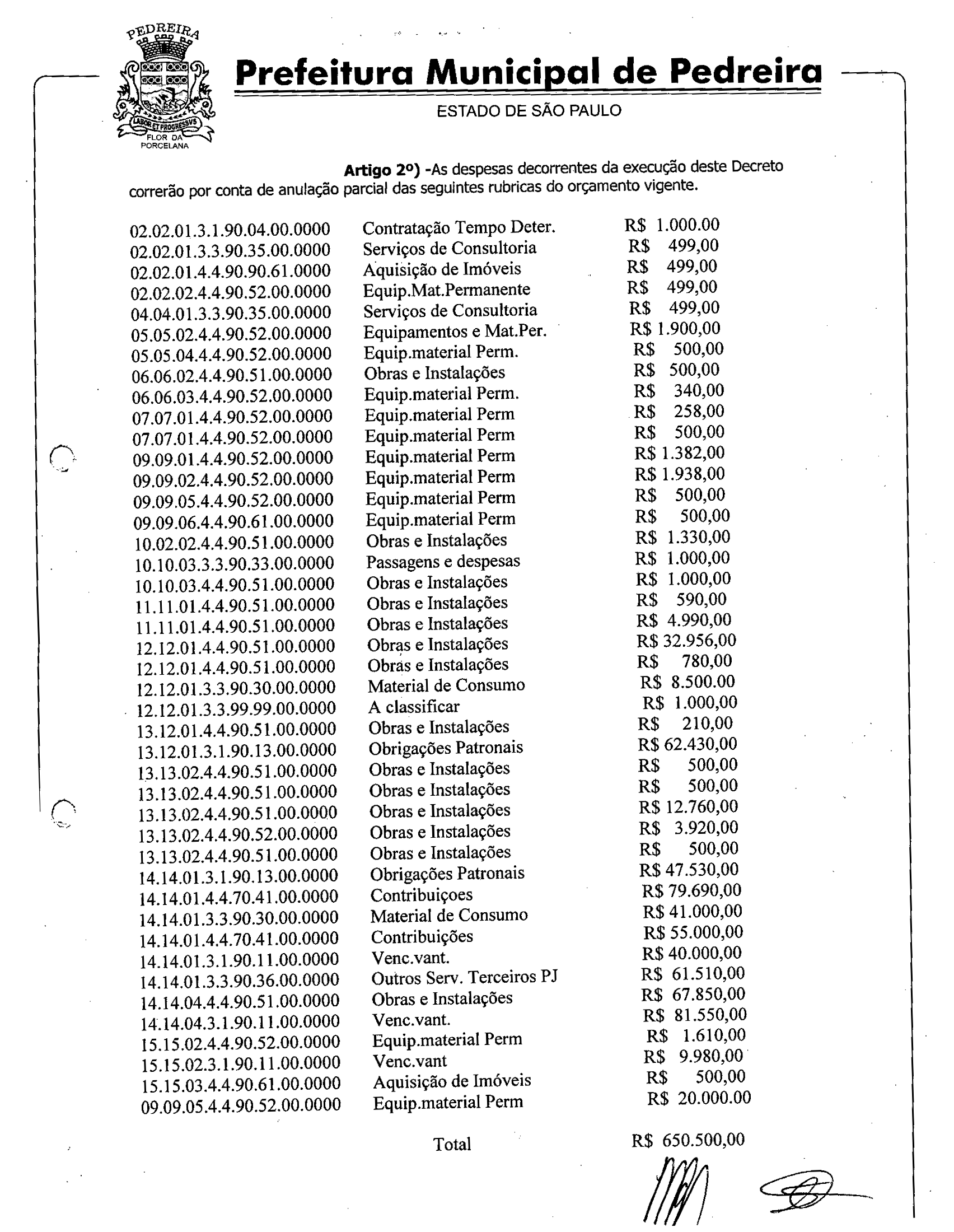 Ementa: Abre crédito adicional suplementar de R$ 650.500,00.