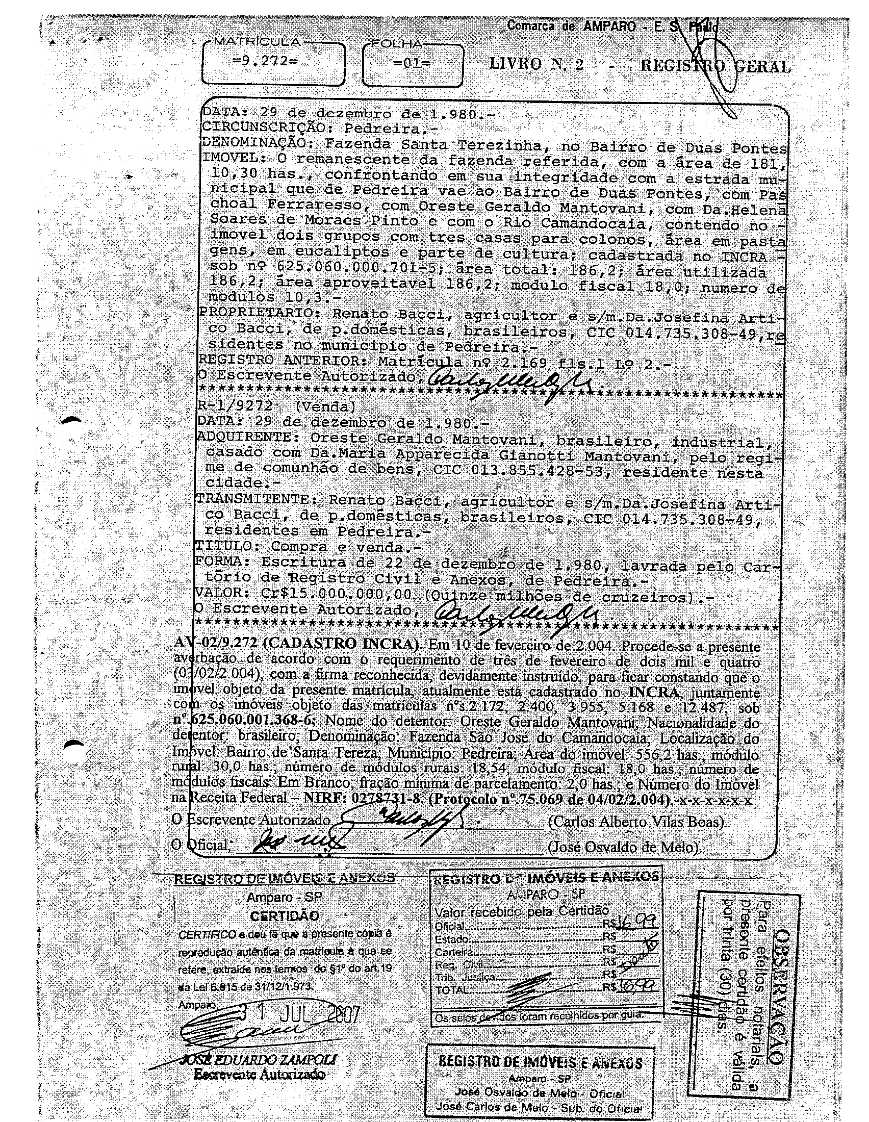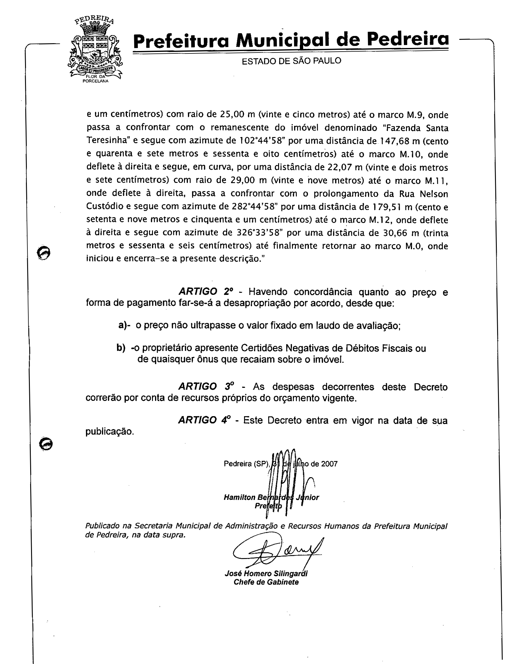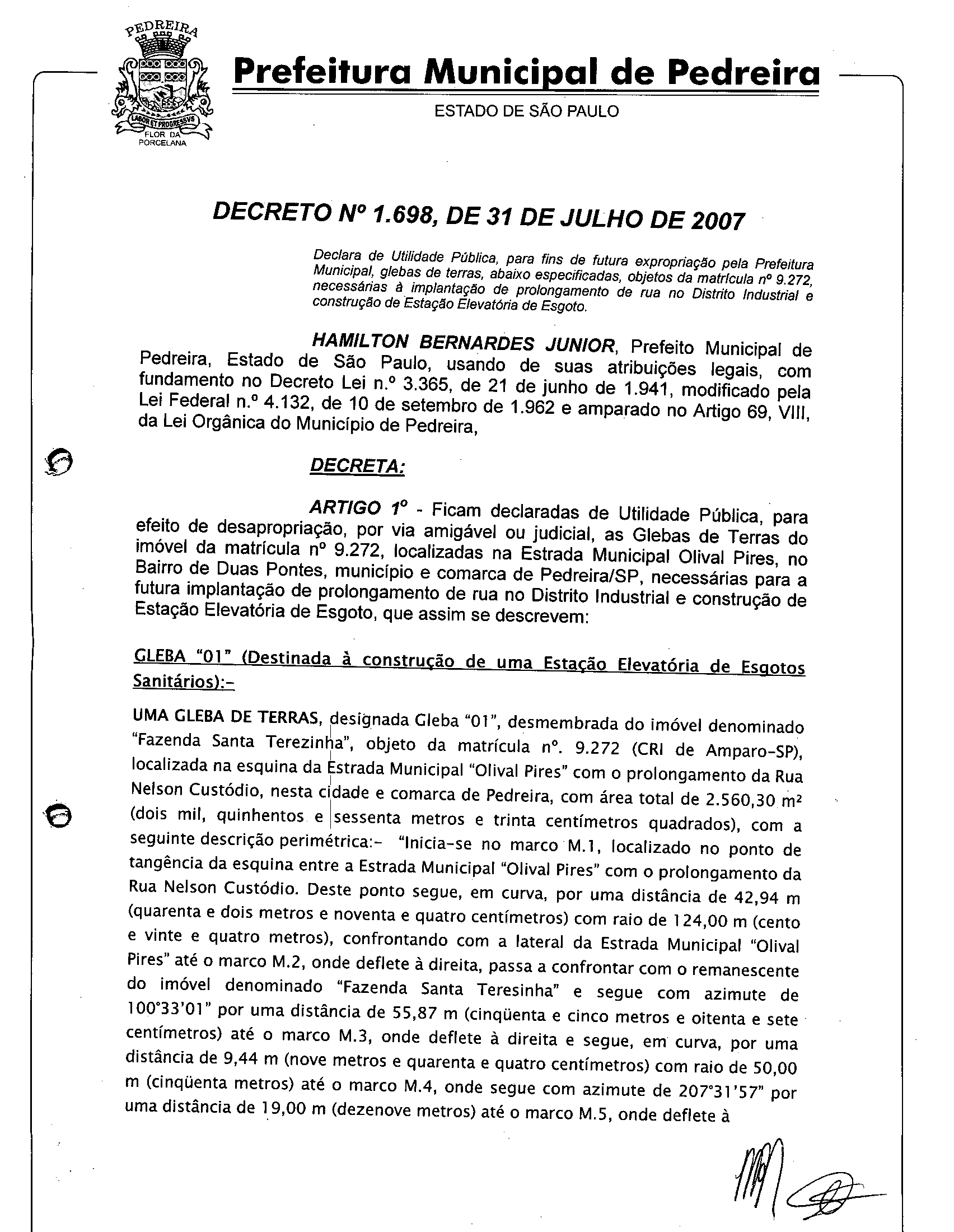 Ementa: Declara de Utilidade Pública, para fins de futura expropriação pela Prefeitura Municipal, glebas de terras, abaixo especificadas, objetos da matricula n° 9.272, necessárias à implantação de prolongamento de rua no Distrito Industrial e construção de Estação Elevatória de Esgoto.