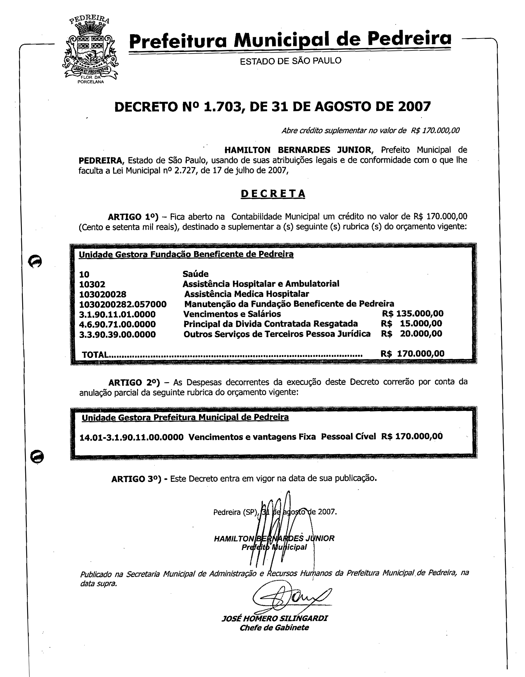 Ementa: Abre crédito suplementar no valorde R$ 170.000,00.