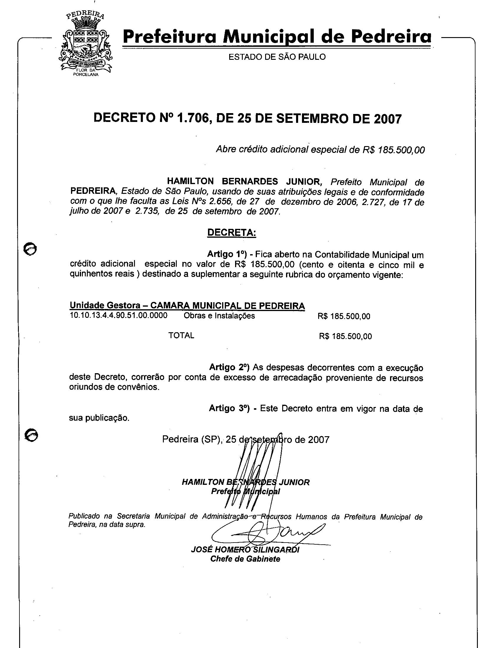 Ementa: Abre crédito adicional especial de R$ 185.500,00.