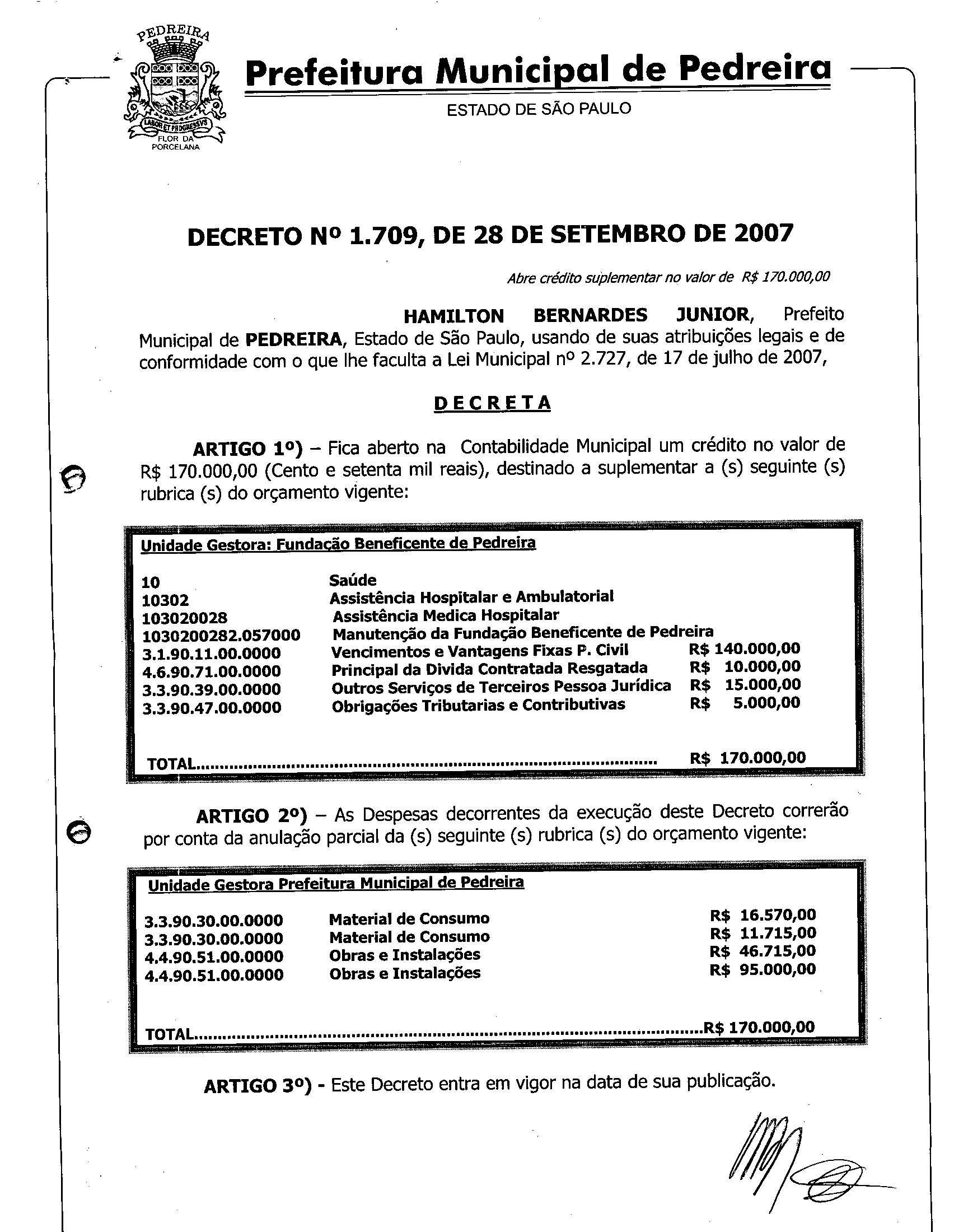 Ementa: Abre crédito suplementar no valor de R$ 170.000,00.