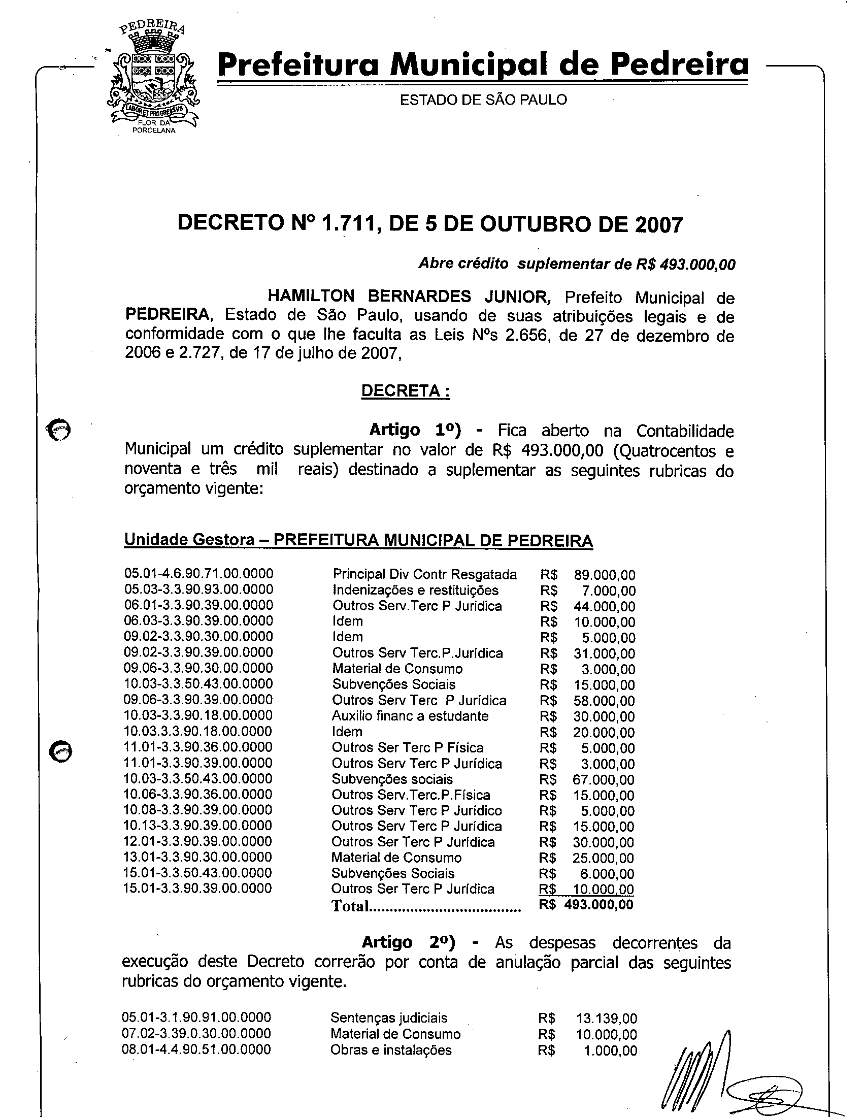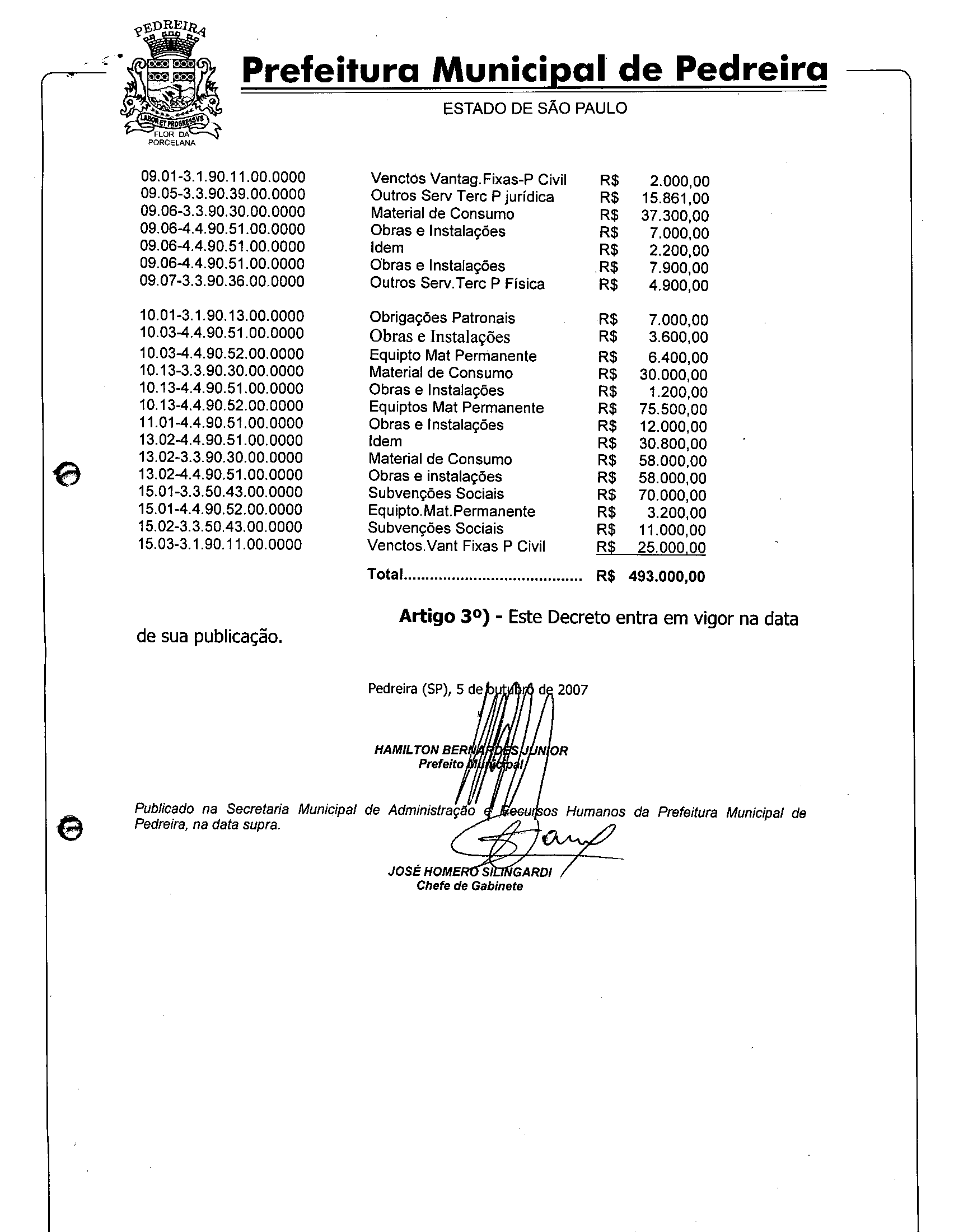 Ementa: Abre crédito suplementar de R$ 493.000,00.