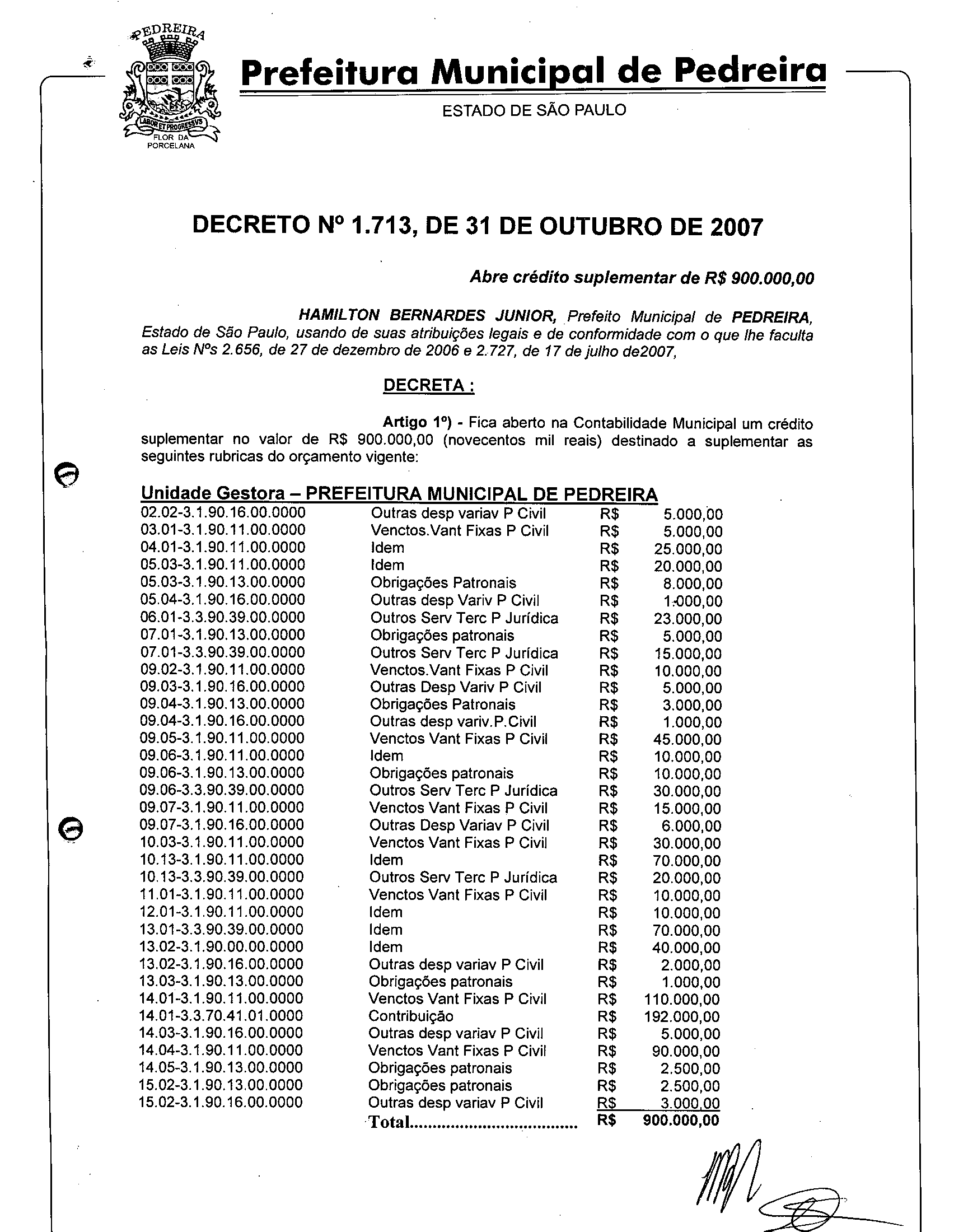 Ementa: Abre crédito suplementar de R$ 900.000,00.