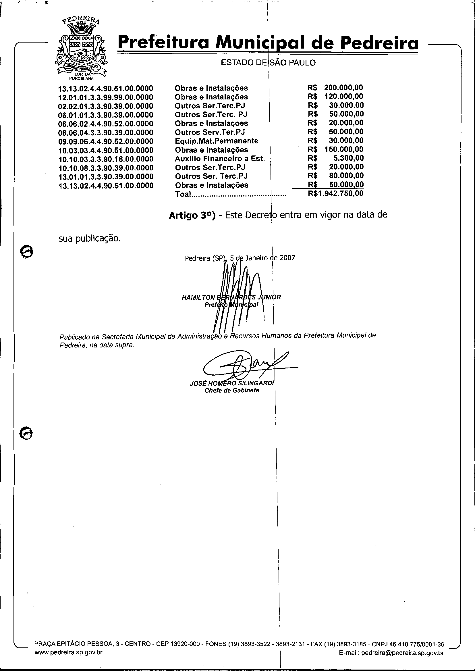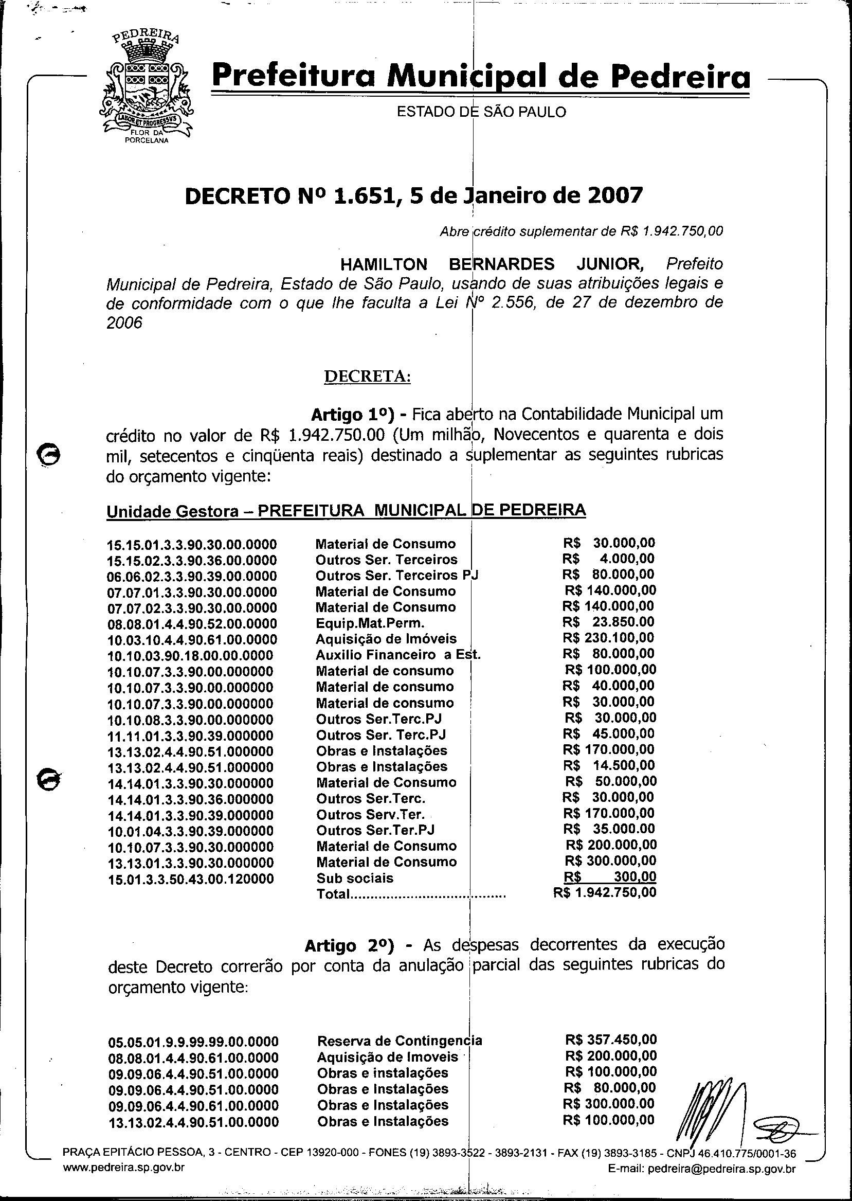 Ementa: Abre crédito suplementar de R$ 1.942.750,00.