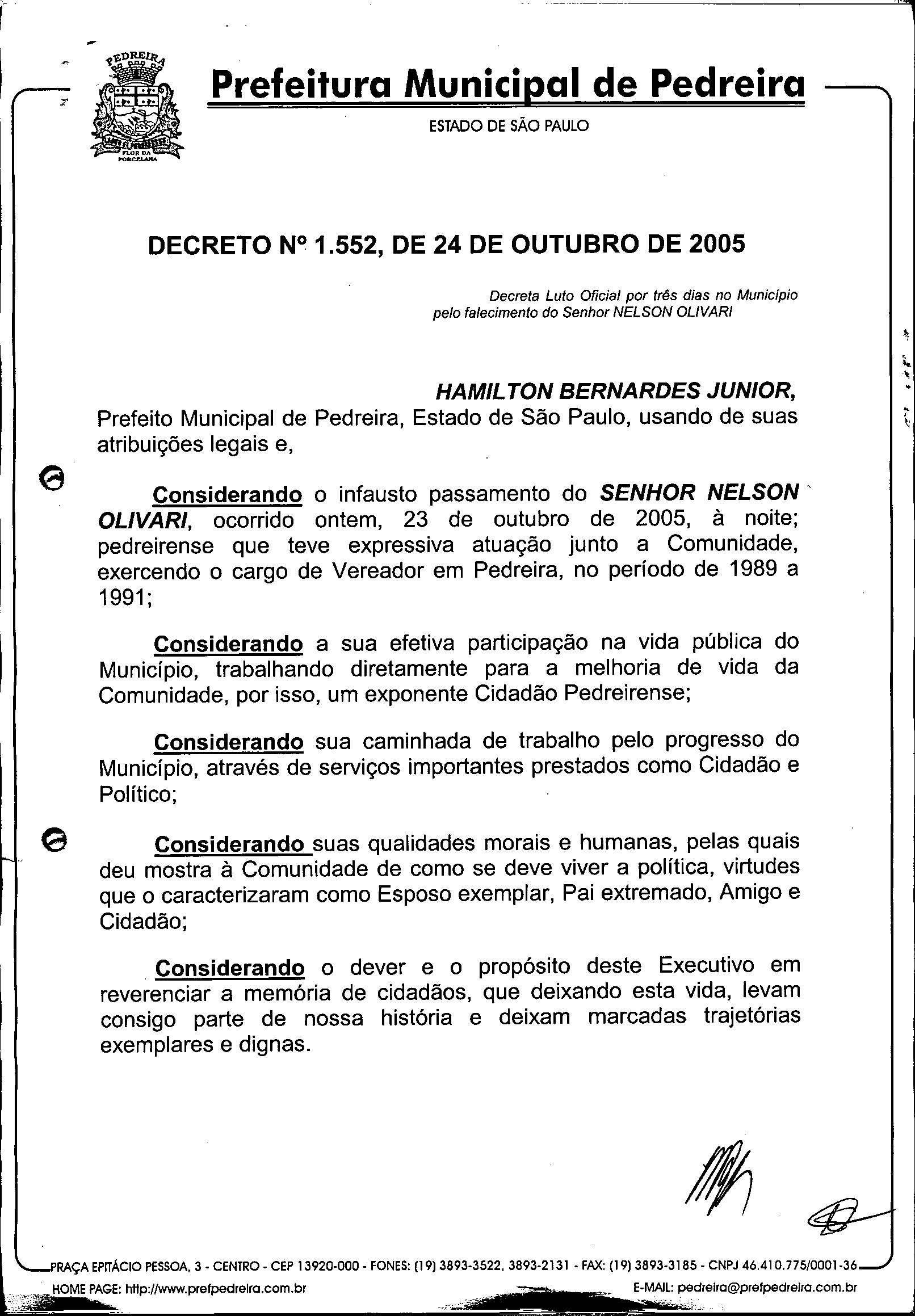 Ementa: Decreta Luto Oficial por três dias no Município pelo falecimento do Senhor NELSON OLIVARI.
