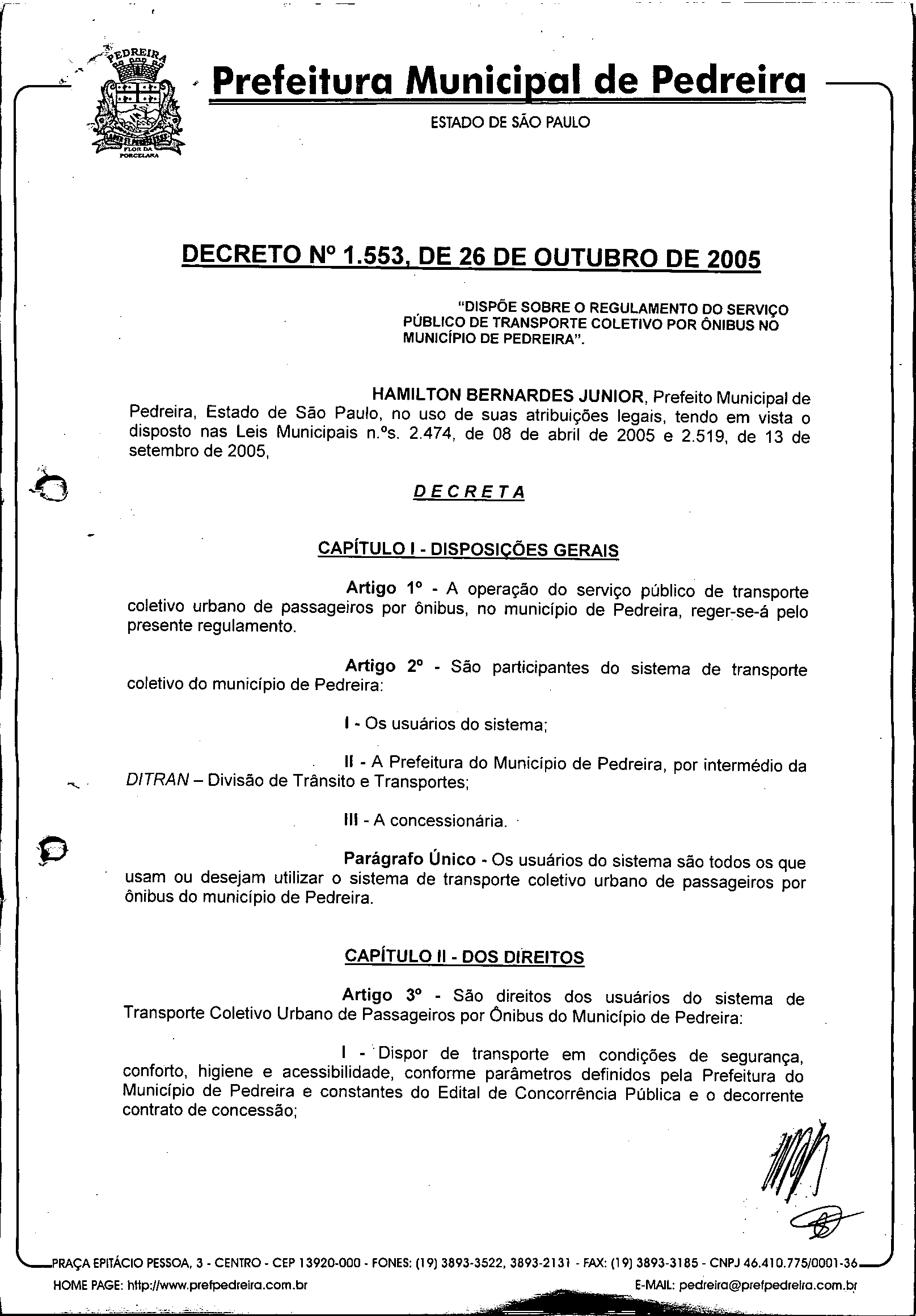Ementa: "DISPÕE SOBRE O REGULAMENTO DO SERVIÇO PÚBLICO DE TRANSPORTE COLETIVO POR ÔNIBUS NO MUNICÍPIO DE PEDREIRA".