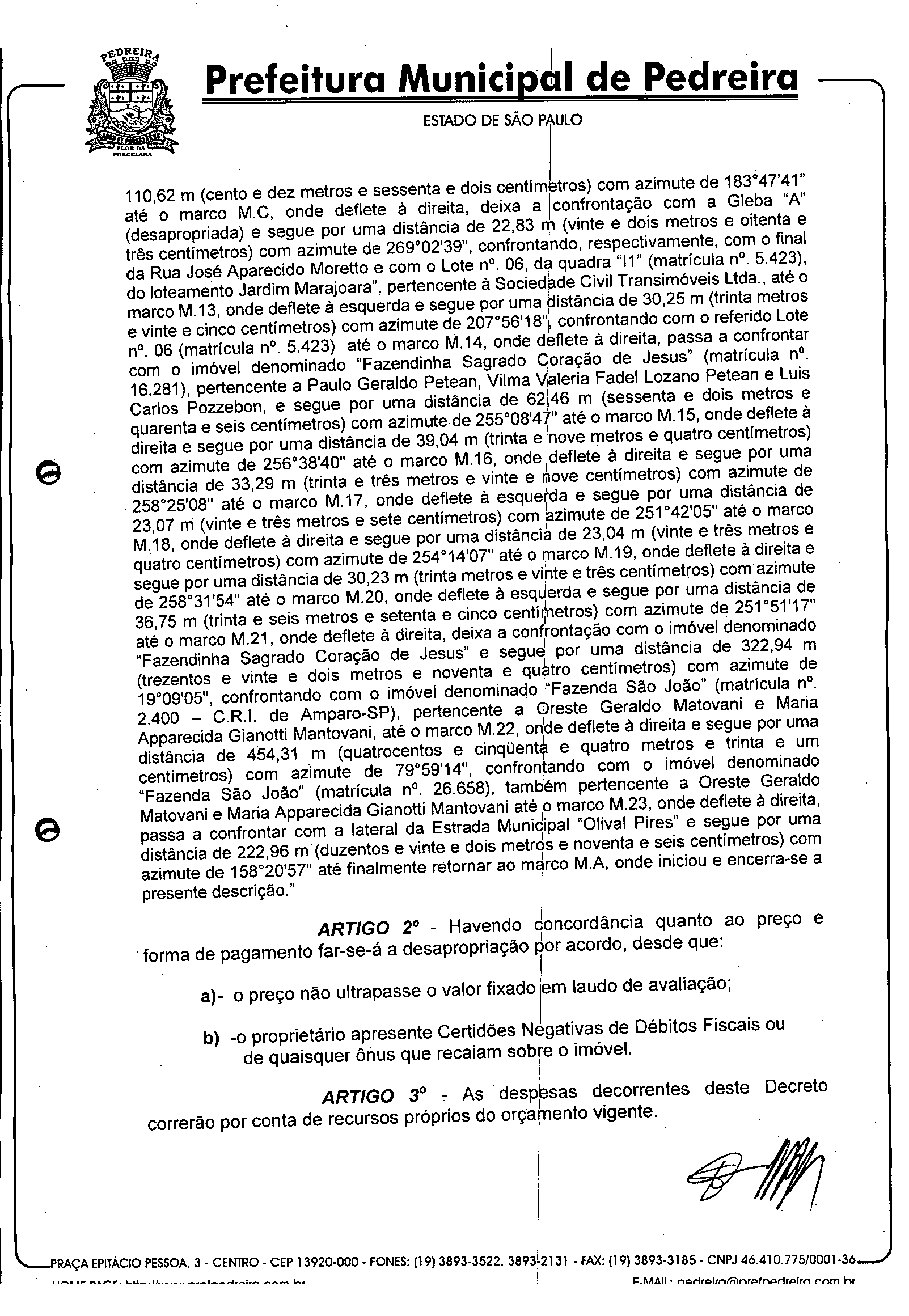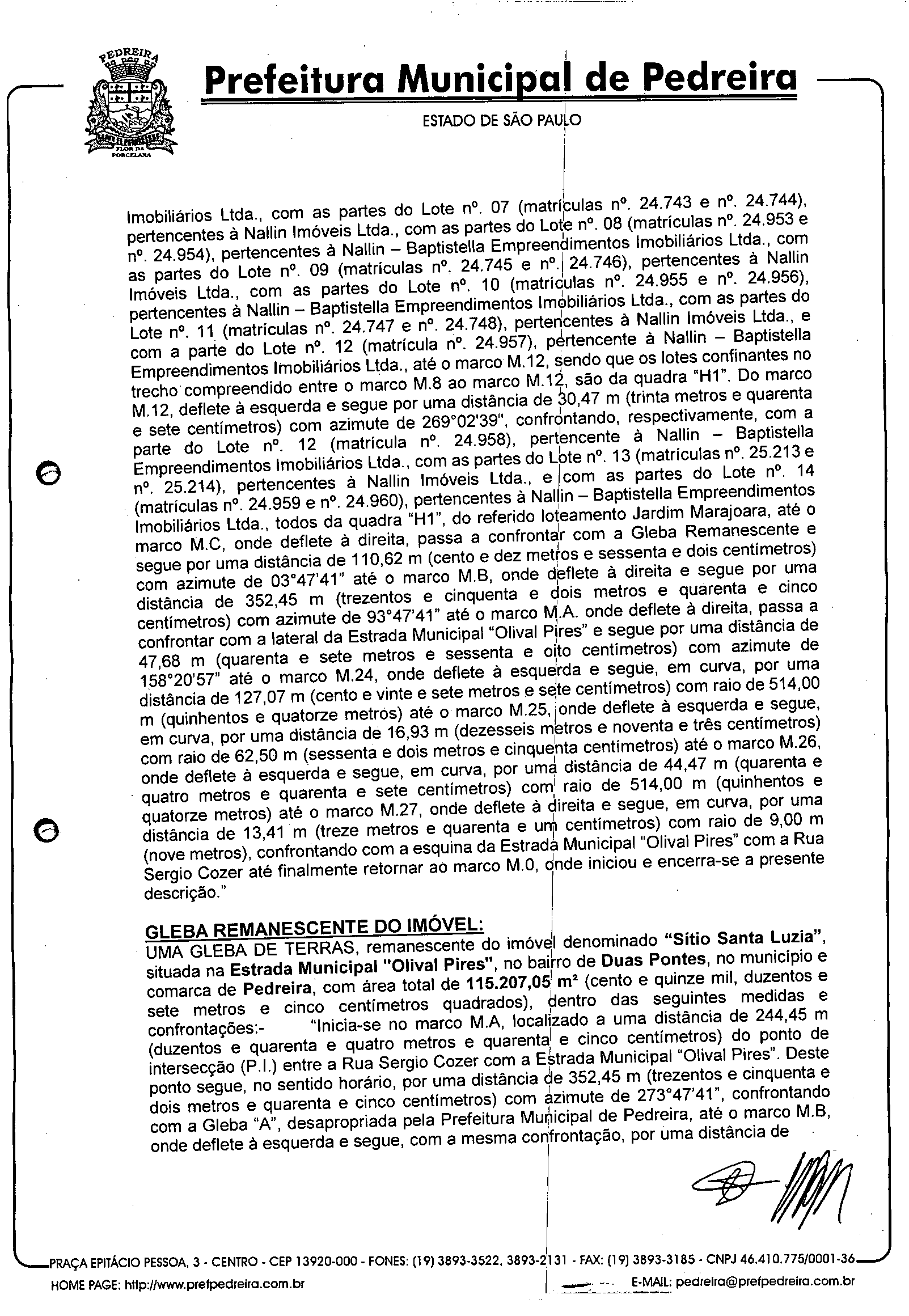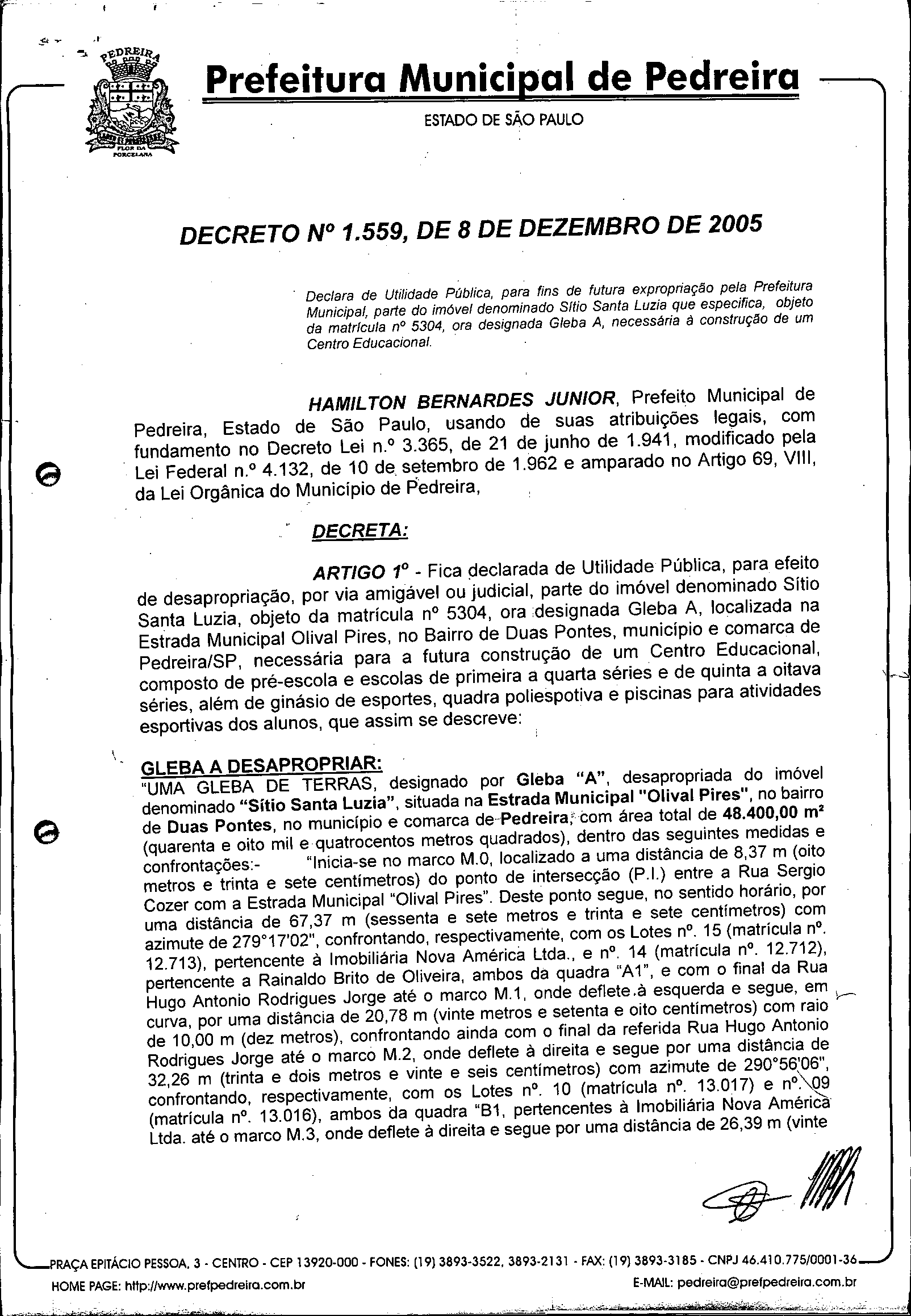 Ementa: Declara de Utilidade Pública, para fins de futura expropriação pela Prefeitura Municipal parte do imóvel denominado Sitio Santa Luzia que especifica, objeto da matricula n° 5304, ora designada Gleba A, necessária è construção de um Centro Educacional.
