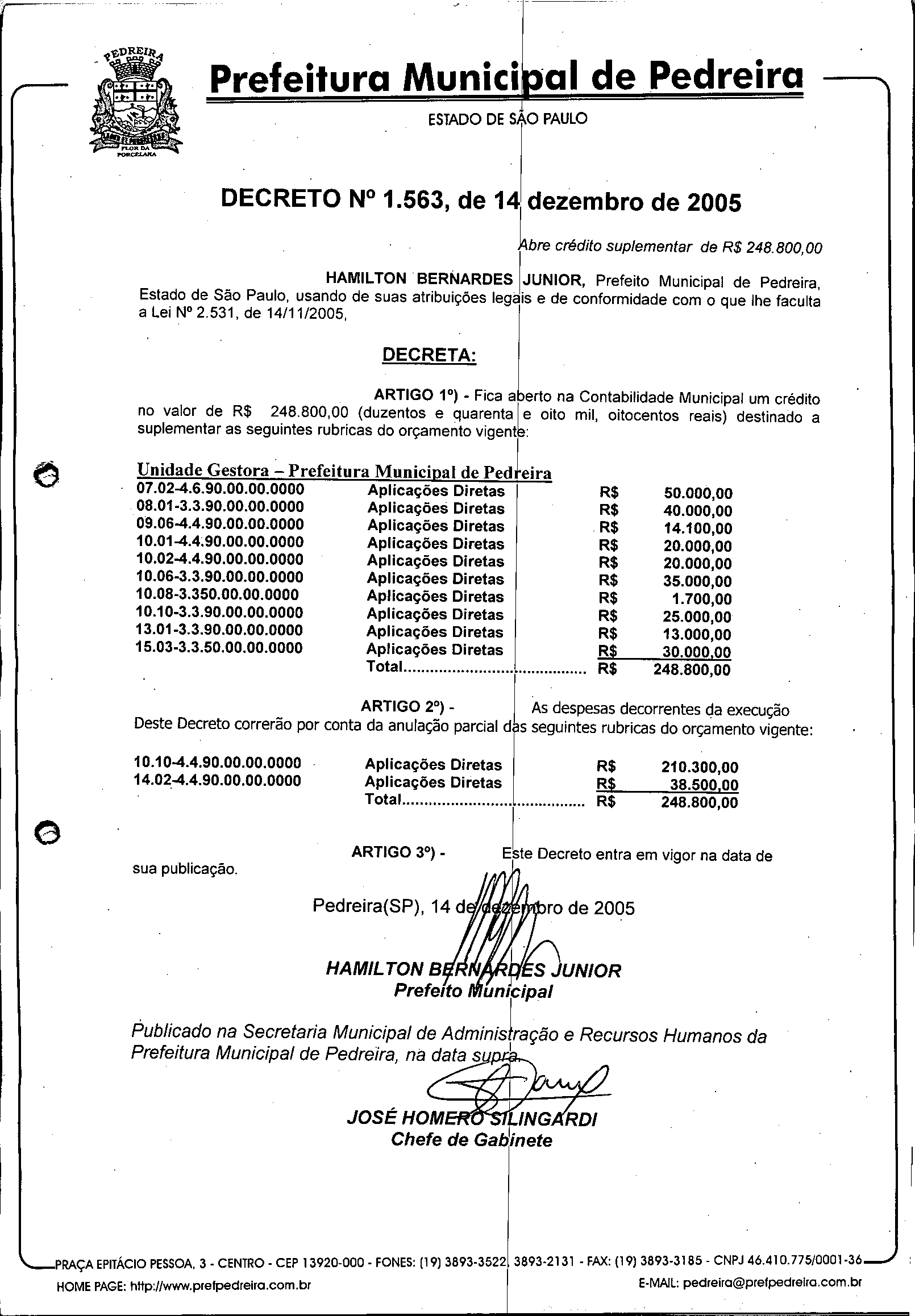 Ementa: Abre crédito suplementar de R$ 248.800,00.