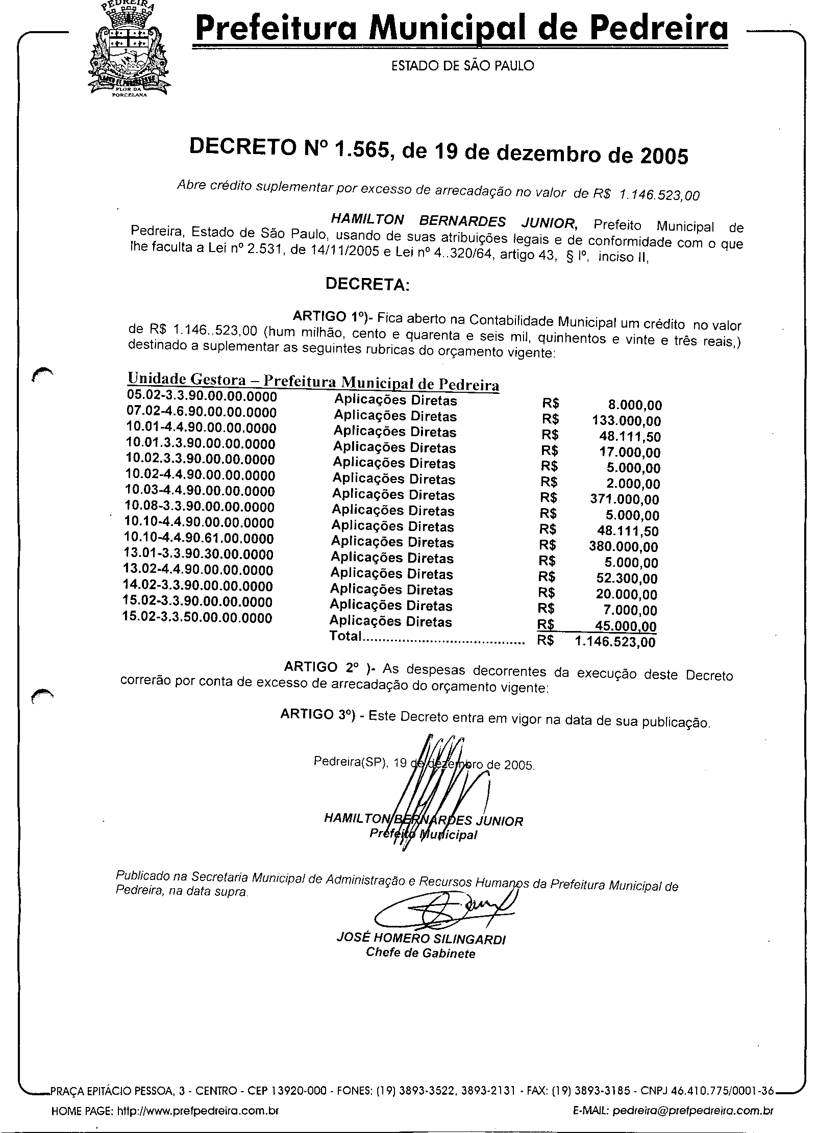 Ementa: Abre crédito suplementar por excesso de arrecadação no valor de RS 1.146.523,00.