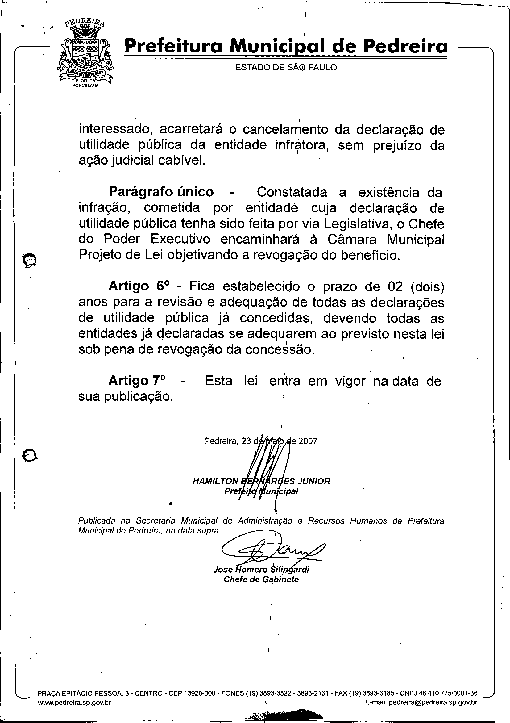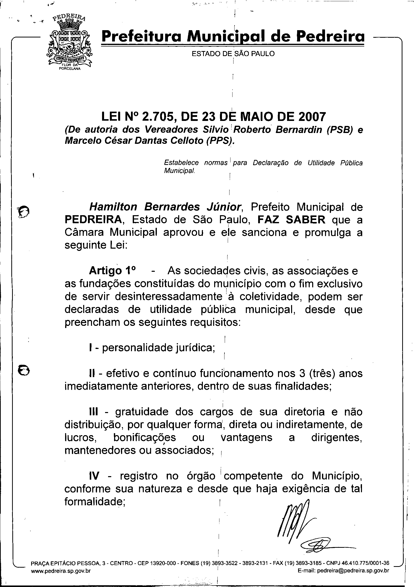 Lei Municipal - N° 2705 de 23/05/2007