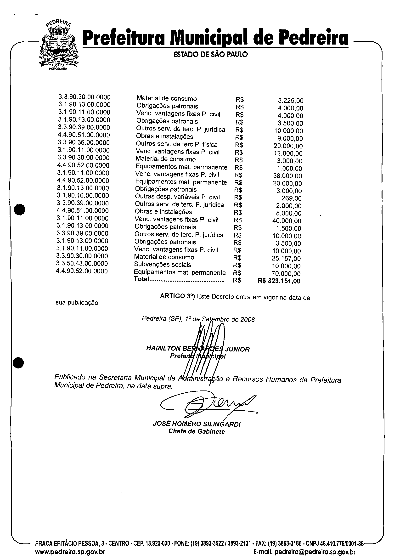 Ementa: Abre crédito suplementar no valor de R$ 323.151,00