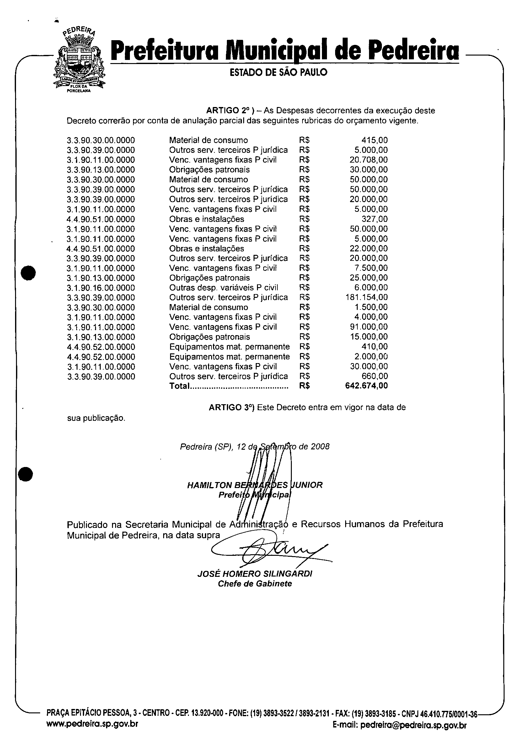 Ementa: Abre crédito suplementar no valor de R$ 642.674,00