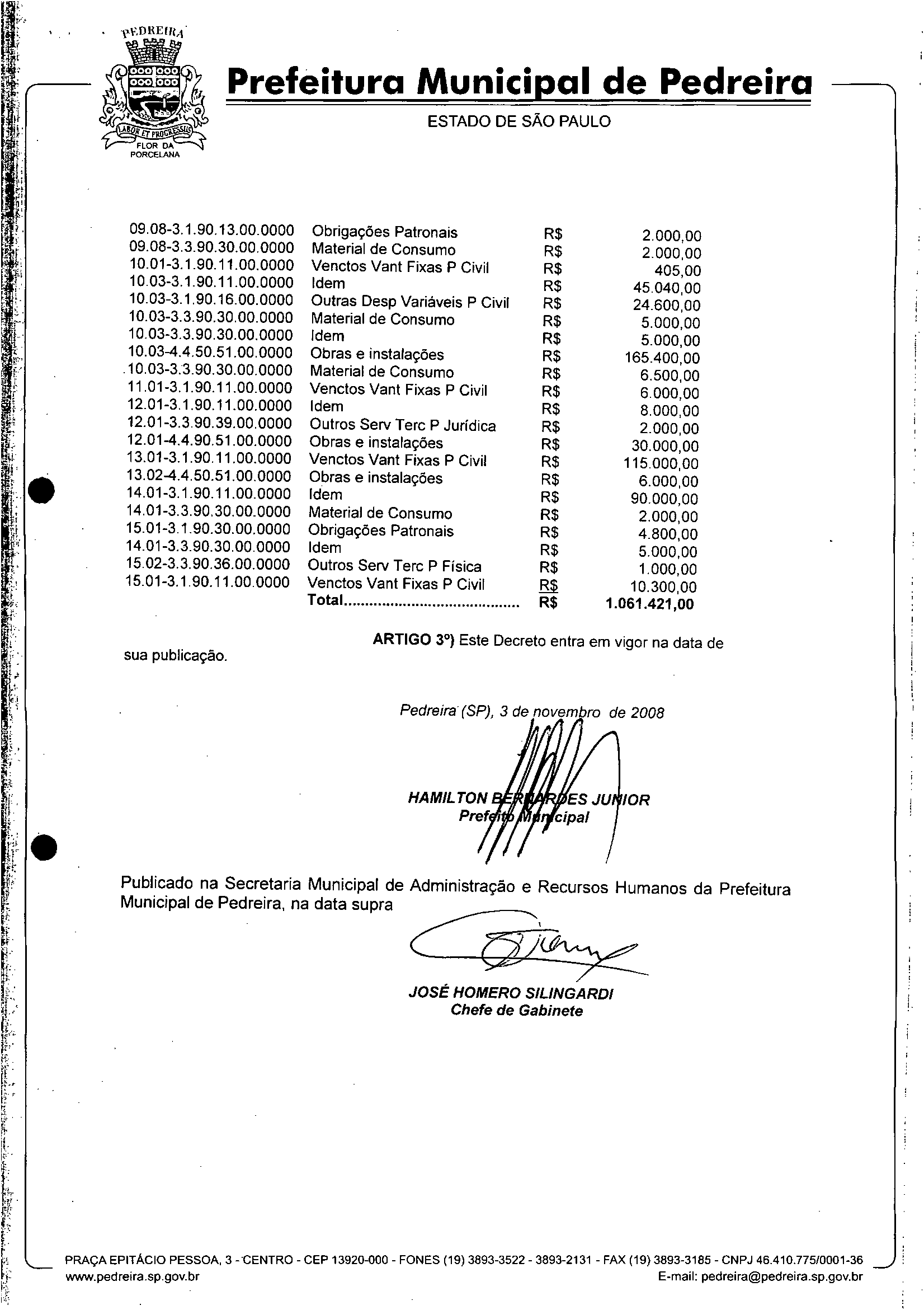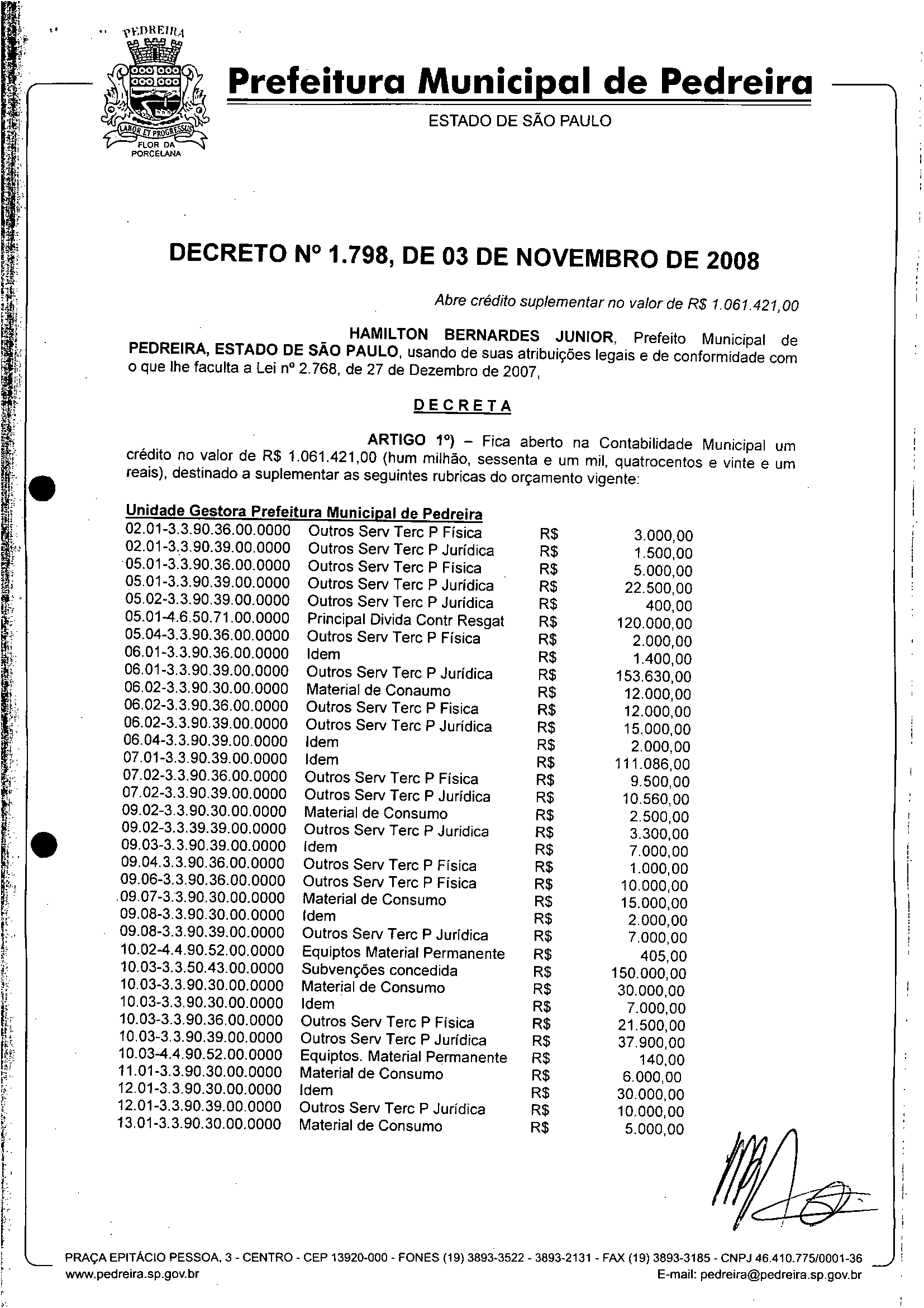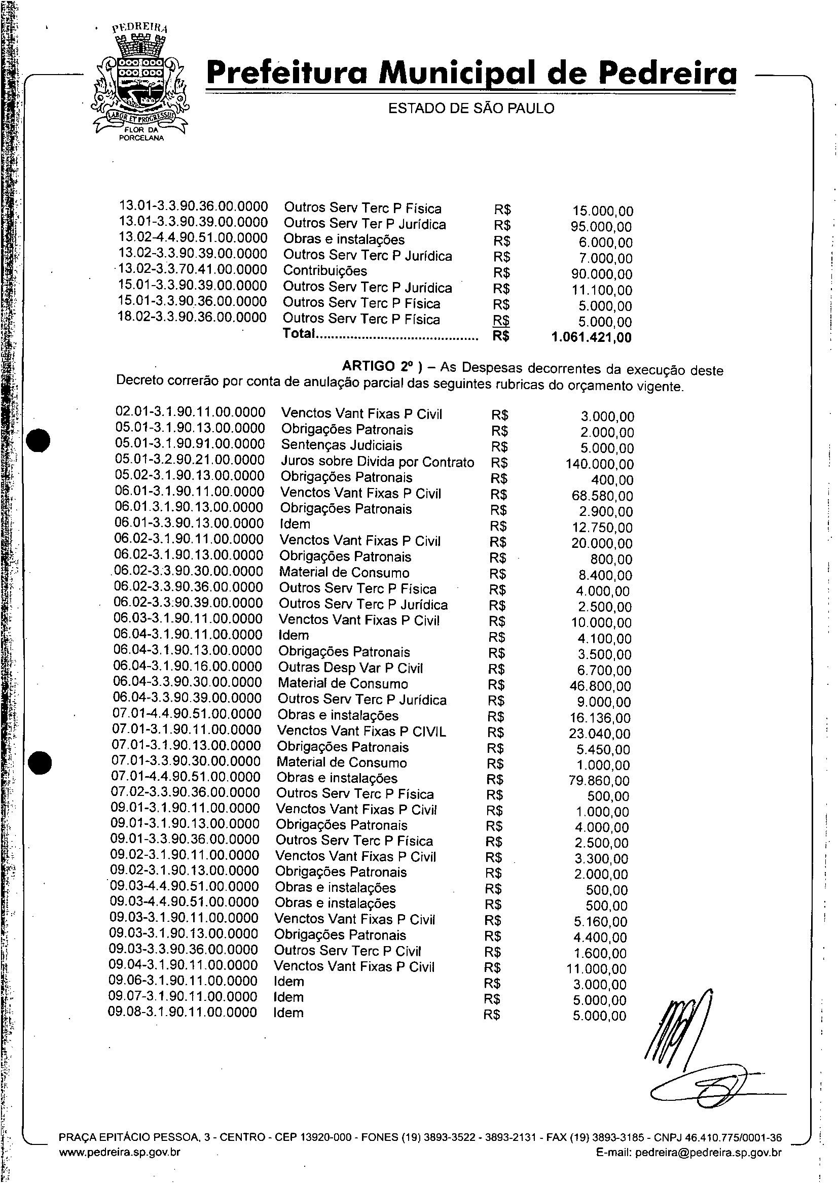 Ementa: Abre crédito suplementar no valor de R$ 1.061.421,00