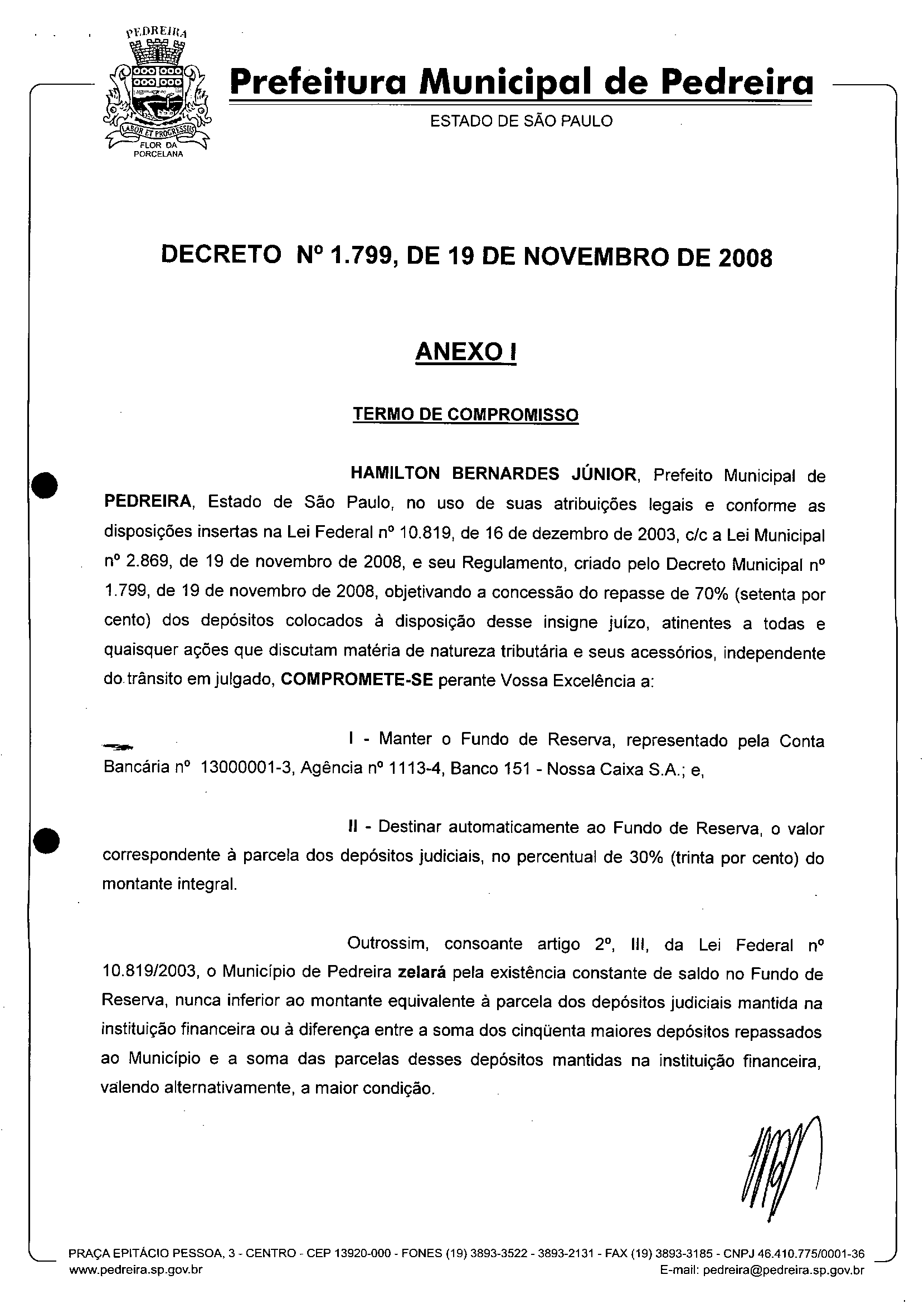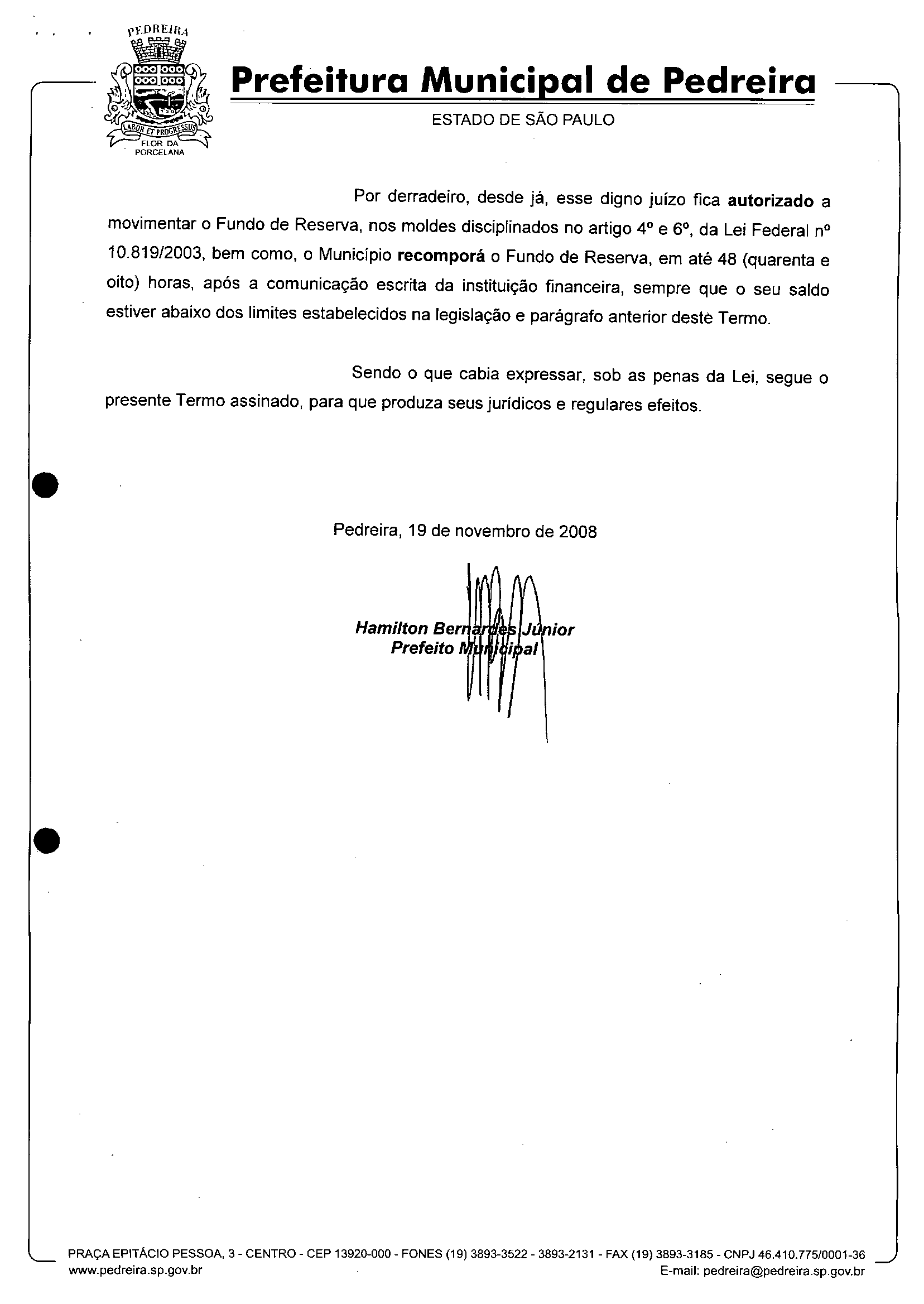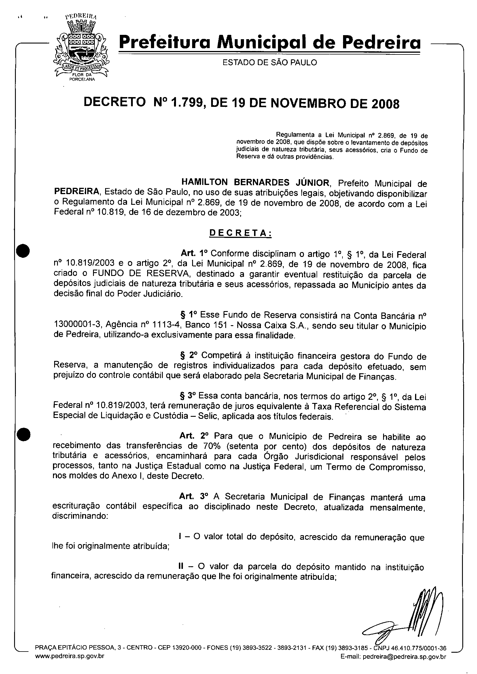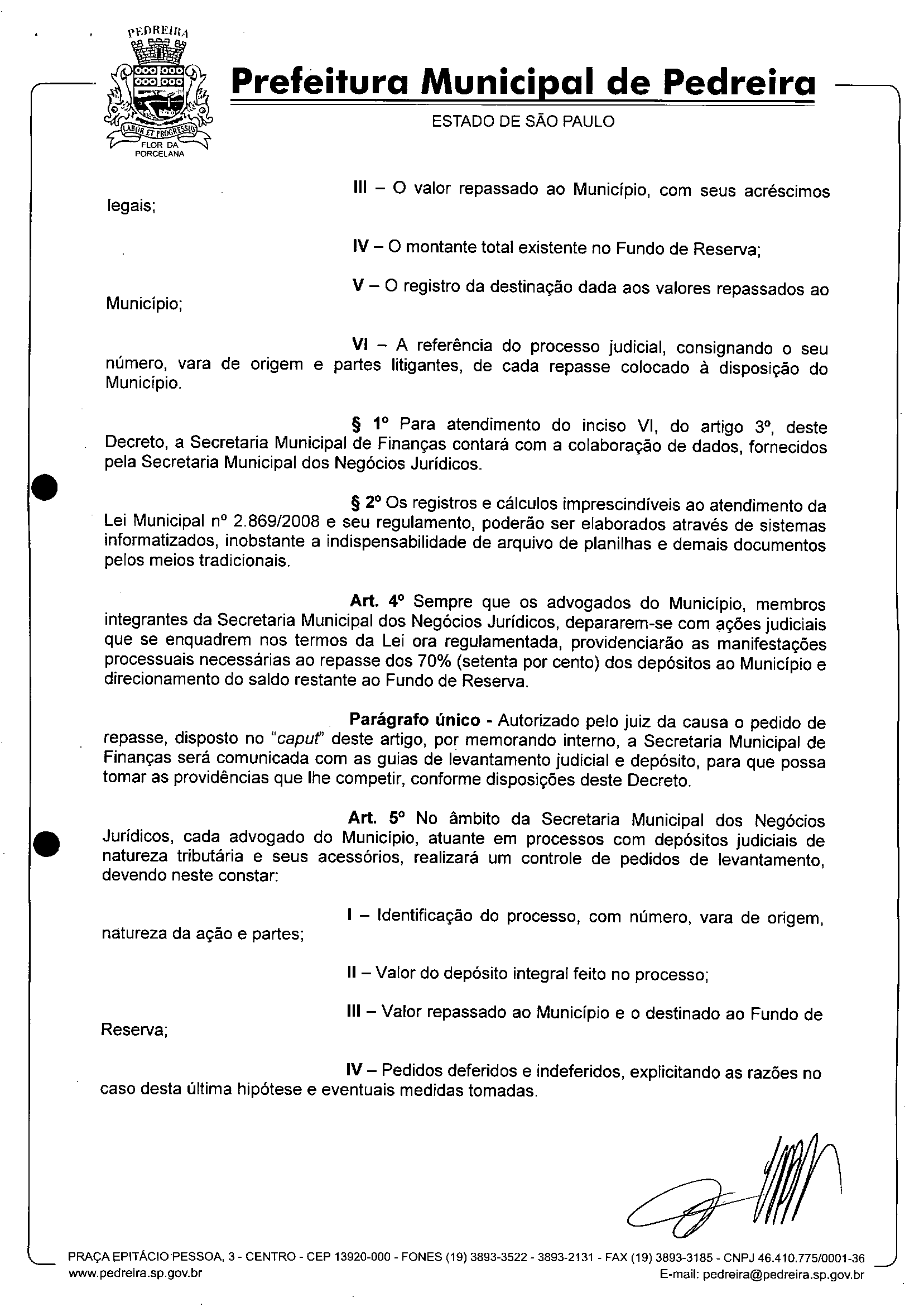 Ementa: Regulamenta a lei Municipal nº 2.869, de 19 de novembro de 2008, que dispõe sobre o levantamento de depósitos judiciais de natureza tributária, seus acessórios, cria o Fundo de Reserva e dá outras providências.
