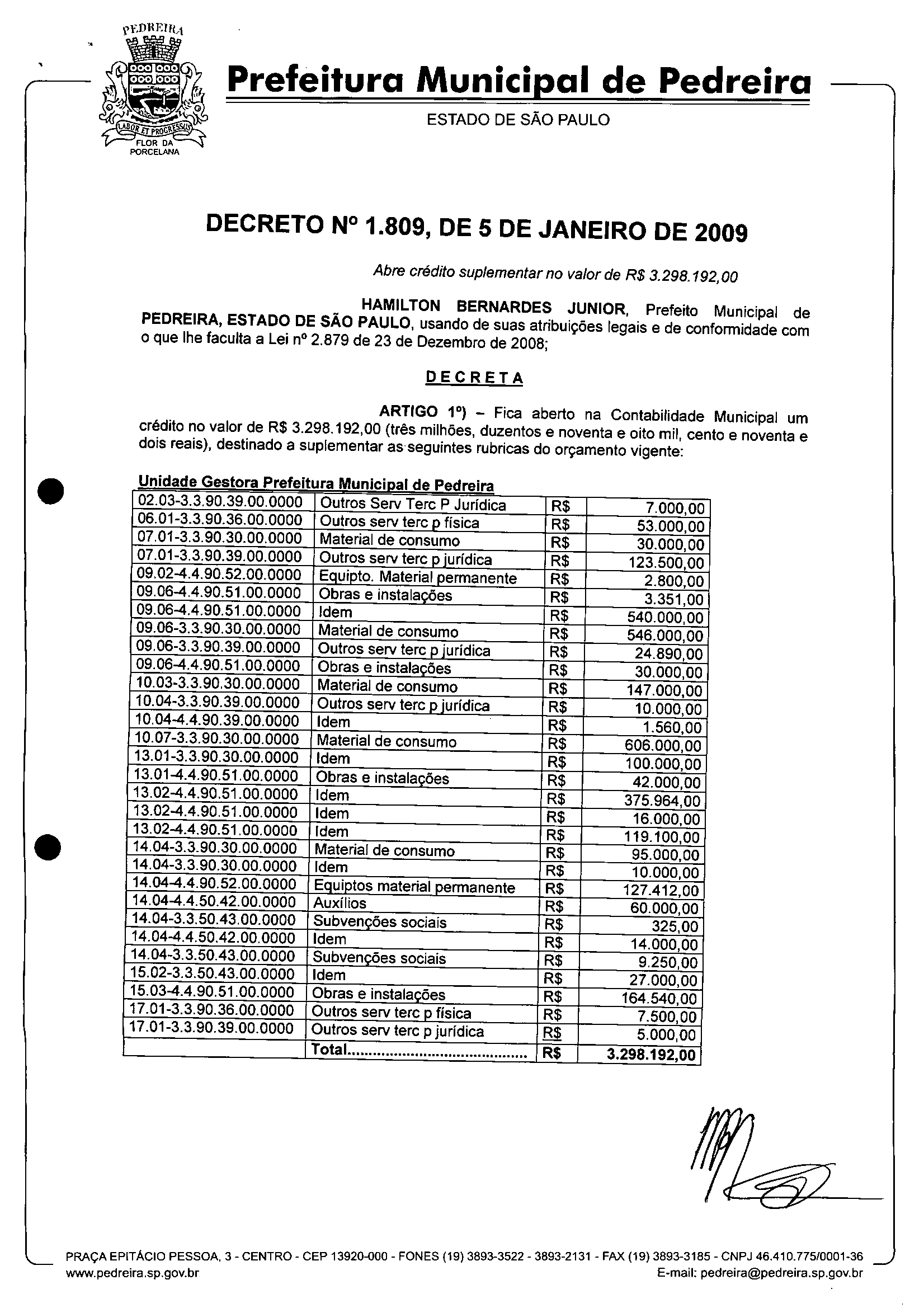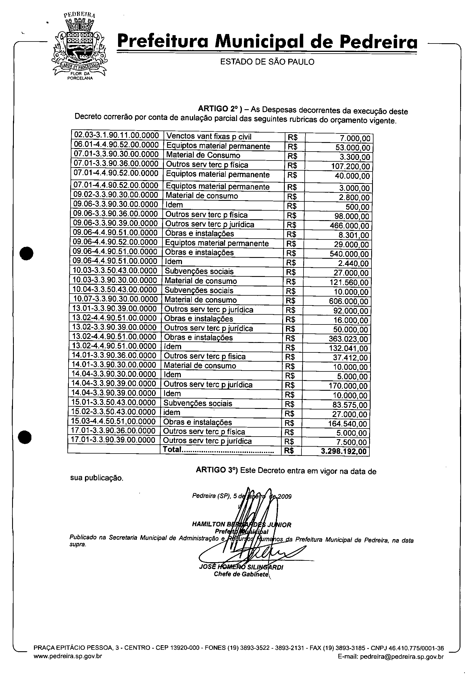 Ementa: Abre crédito suplementar no valor de R$ 3.298.192,00
