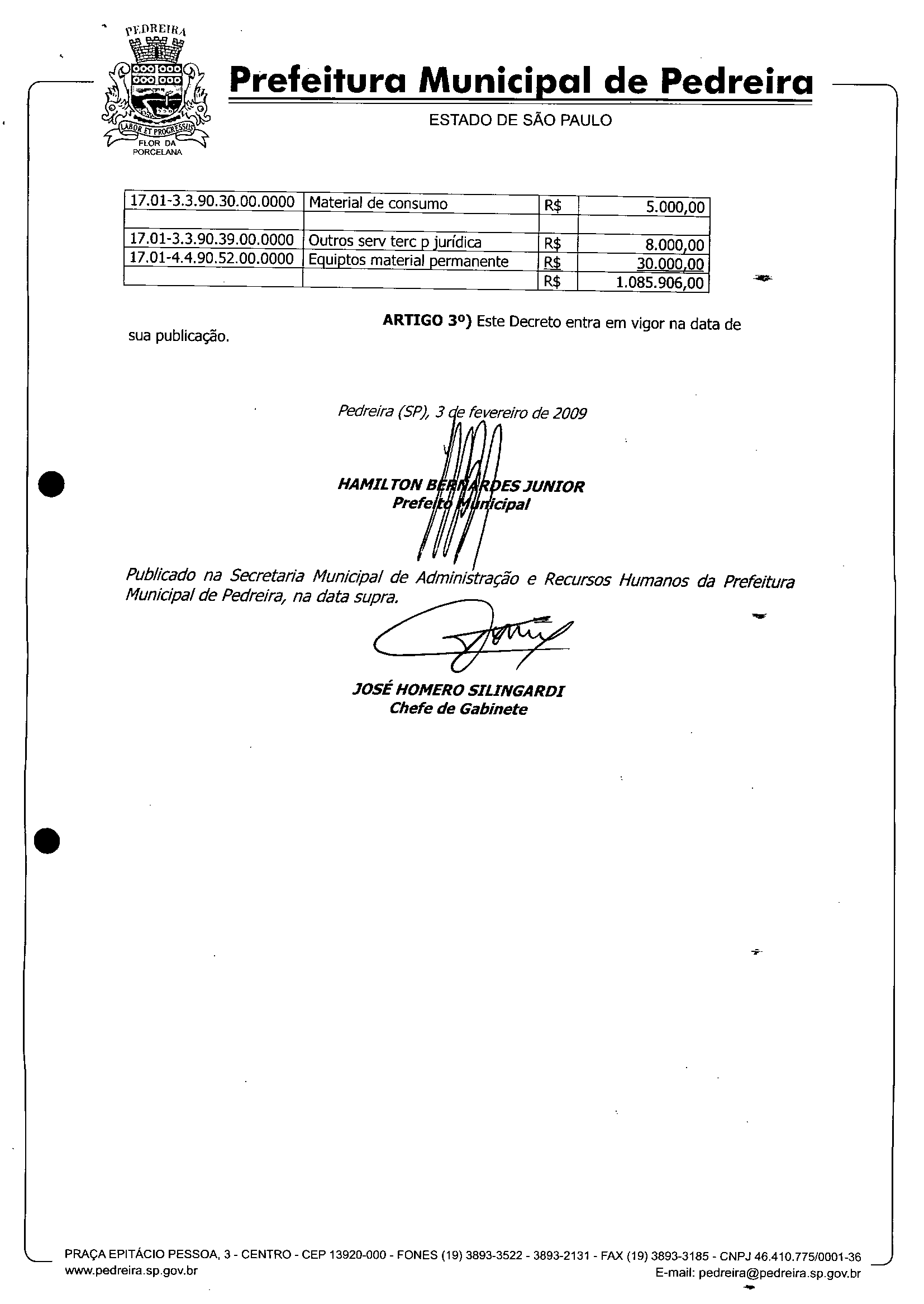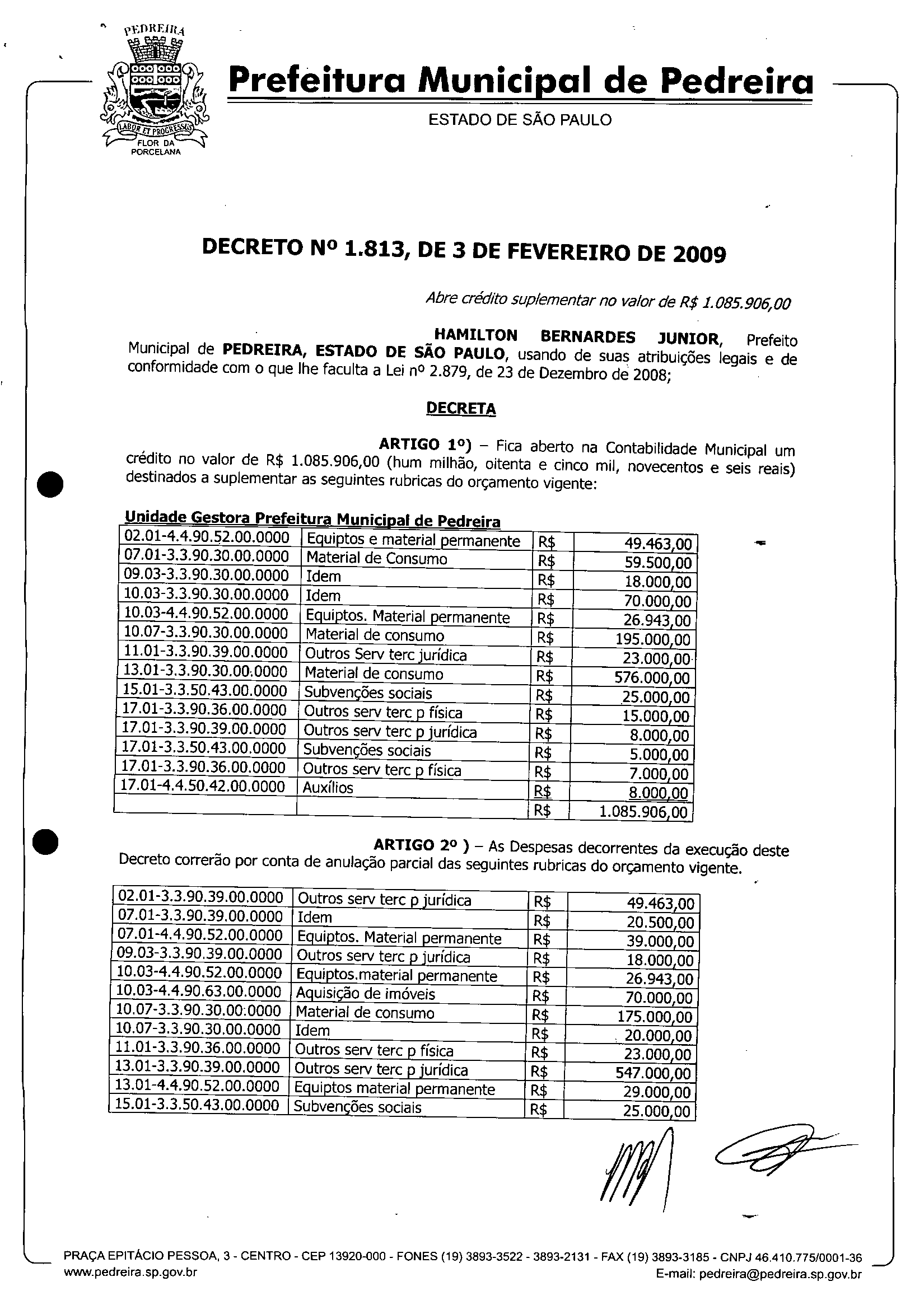 Ementa: Abre crédito suplementar no valor de R$ 1.085.906,00