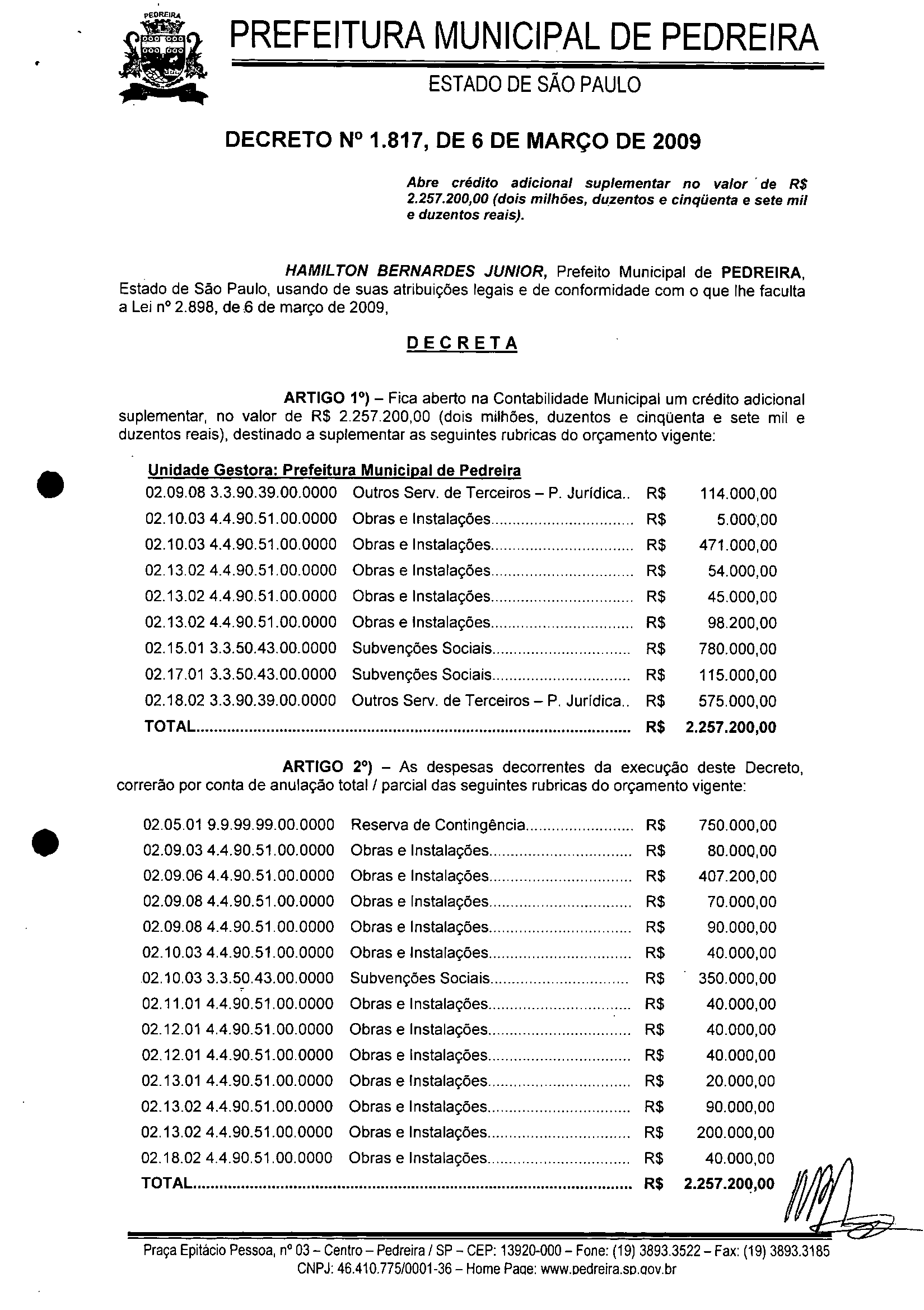 Ementa: Abre crédito adicional suplementar no valor de R$ 2.257.200,00 (dois milhões, duzentos e cinqüenta e sete mil e duzentos reais).