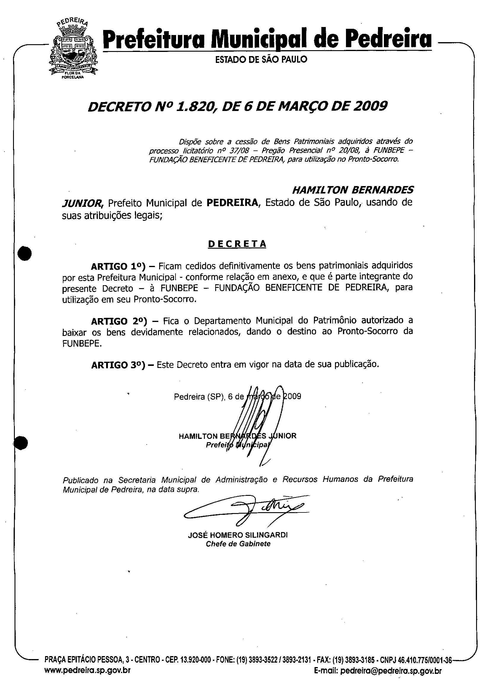 Ementa: Dispõe sobre a cessão de Bens Patrimoniais adquiridos através do processo licitatário nº 37/08 -Pregão Presencial nº 20/08, à FUNBEPE - FUNDAÇÃO BENEFICENTE DE PEDREIRA, para utilização no Pronto-Socorro.