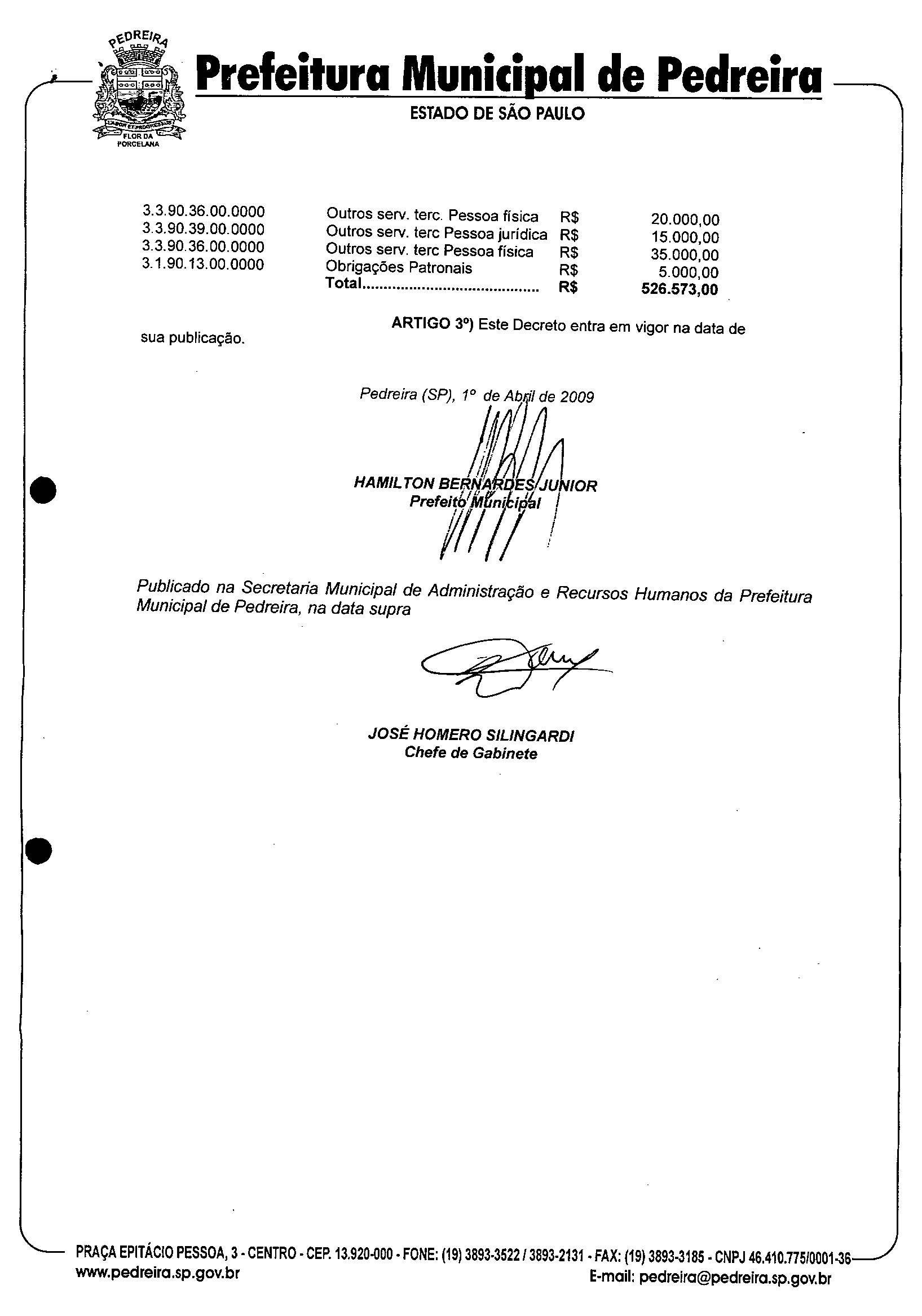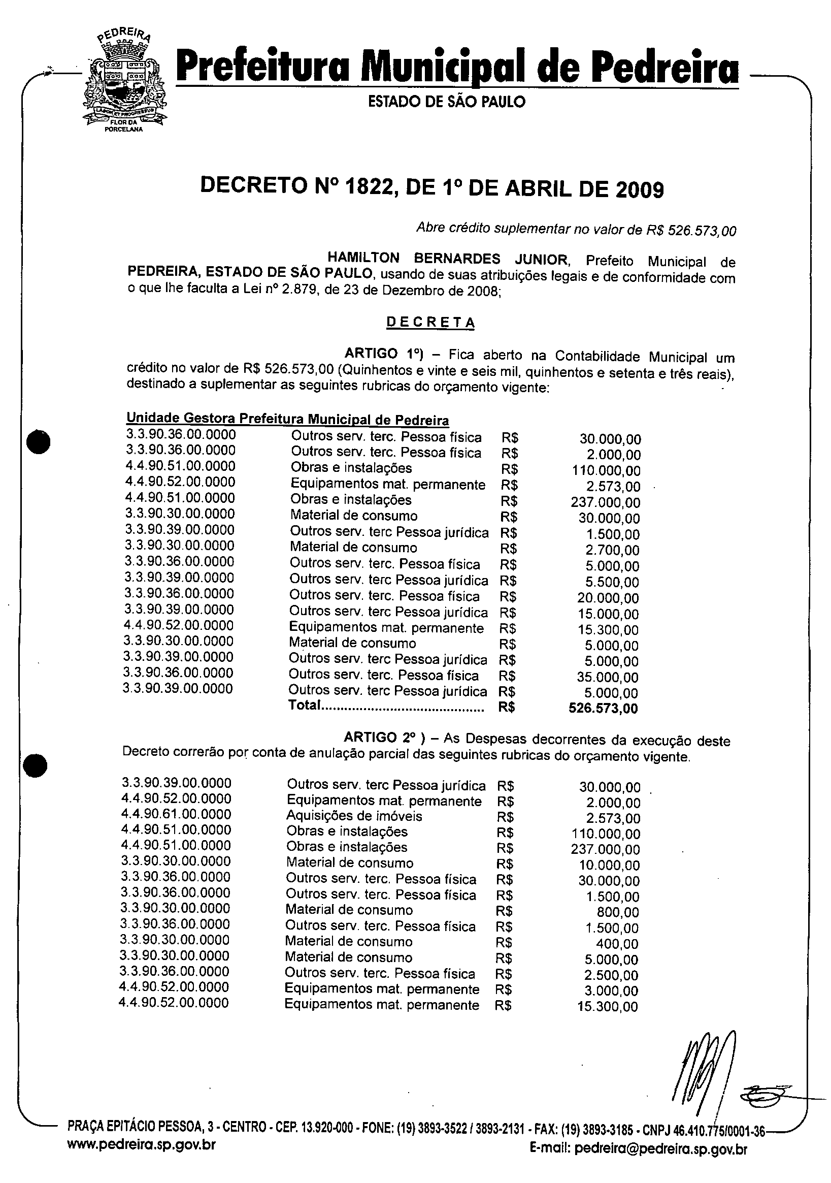 Ementa: Abre crédito suplementar no valor de R$ 526.573,00
