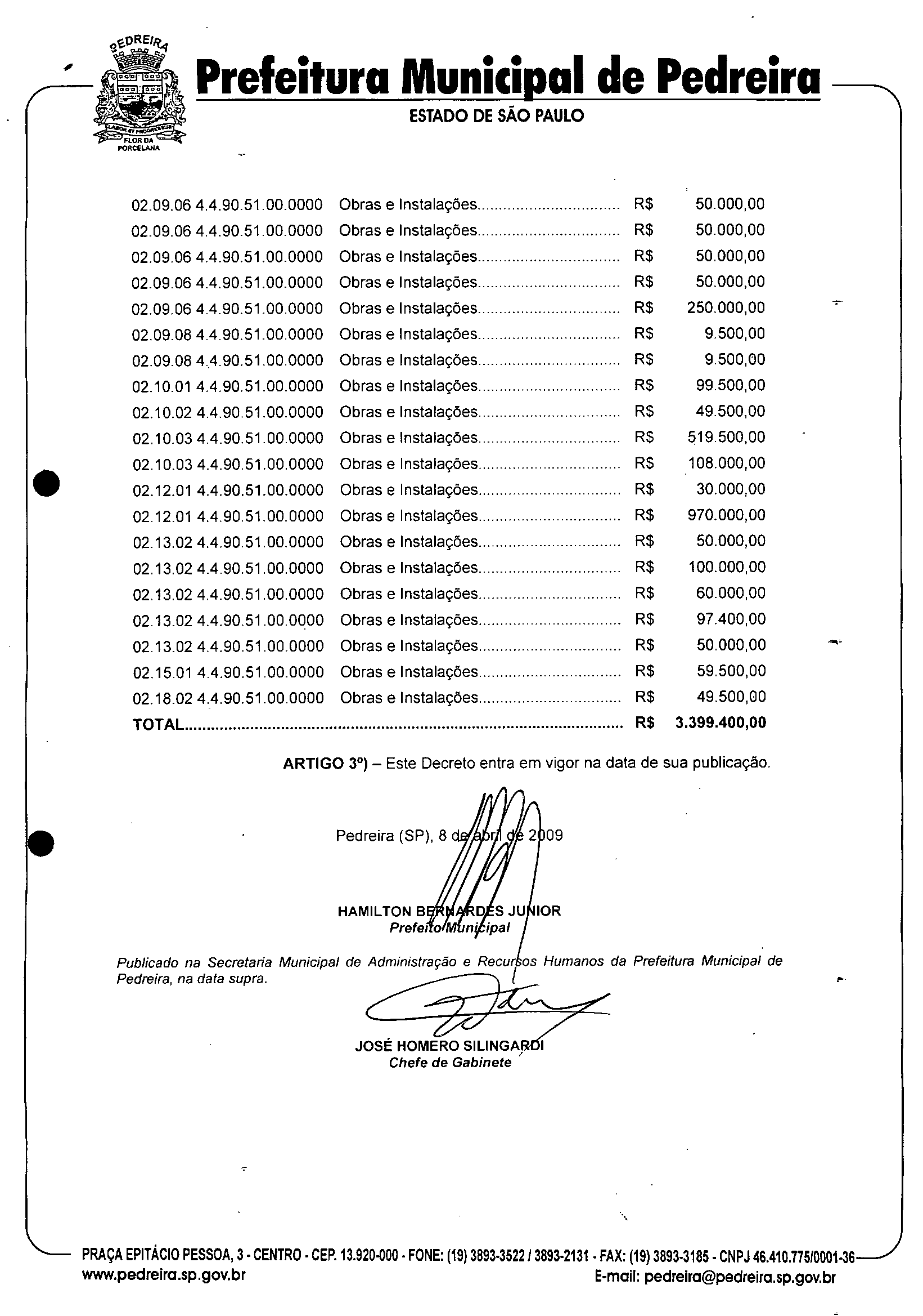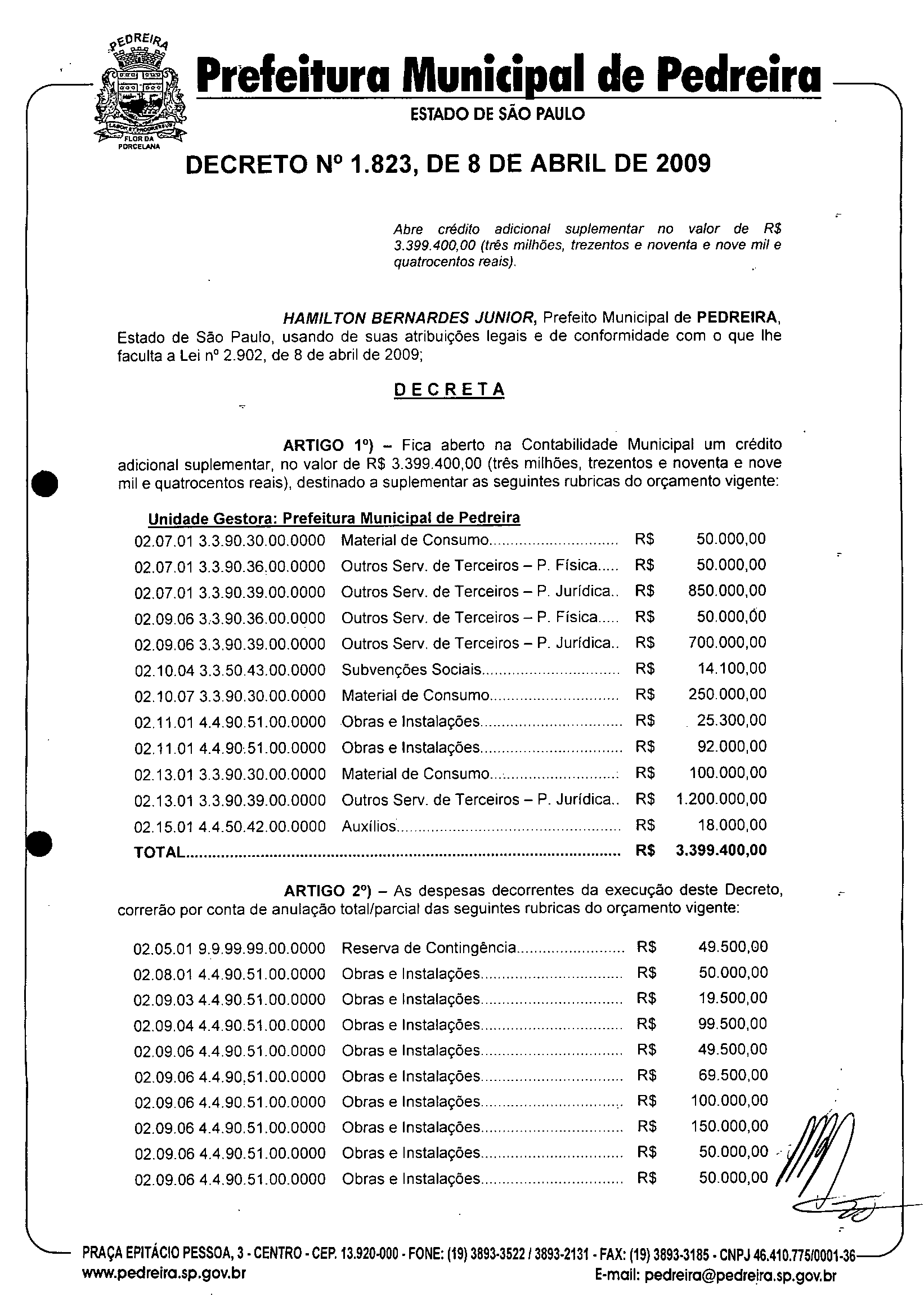Ementa: Abre crédito adicional suplementar no valor de R$ 3.399.400,00 (três milhões, trezentos e noventa e nove mil e quatrocentos reais).