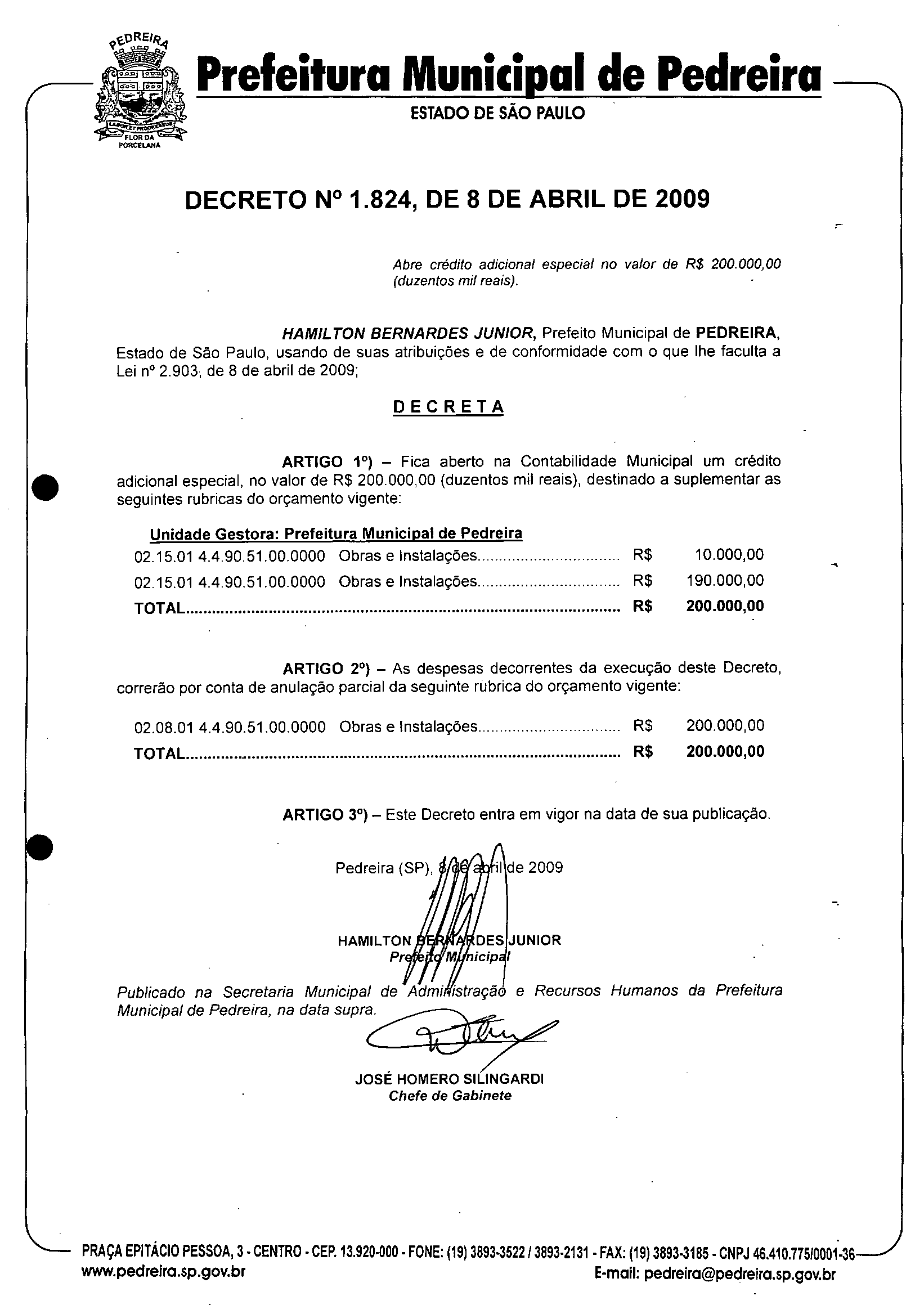 Ementa: Abre crédito adicional especial no valor de R$ 200.000,00 (duzentos mil reais).