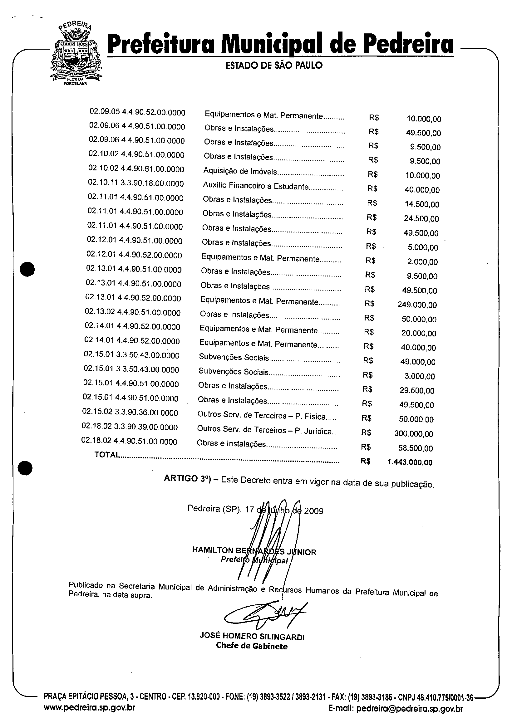 Ementa: Abre crédito adicional suplementar no valor de R$ 1.443.000,00 (um milhão, quatrocentos e quarenta e três mil reais).