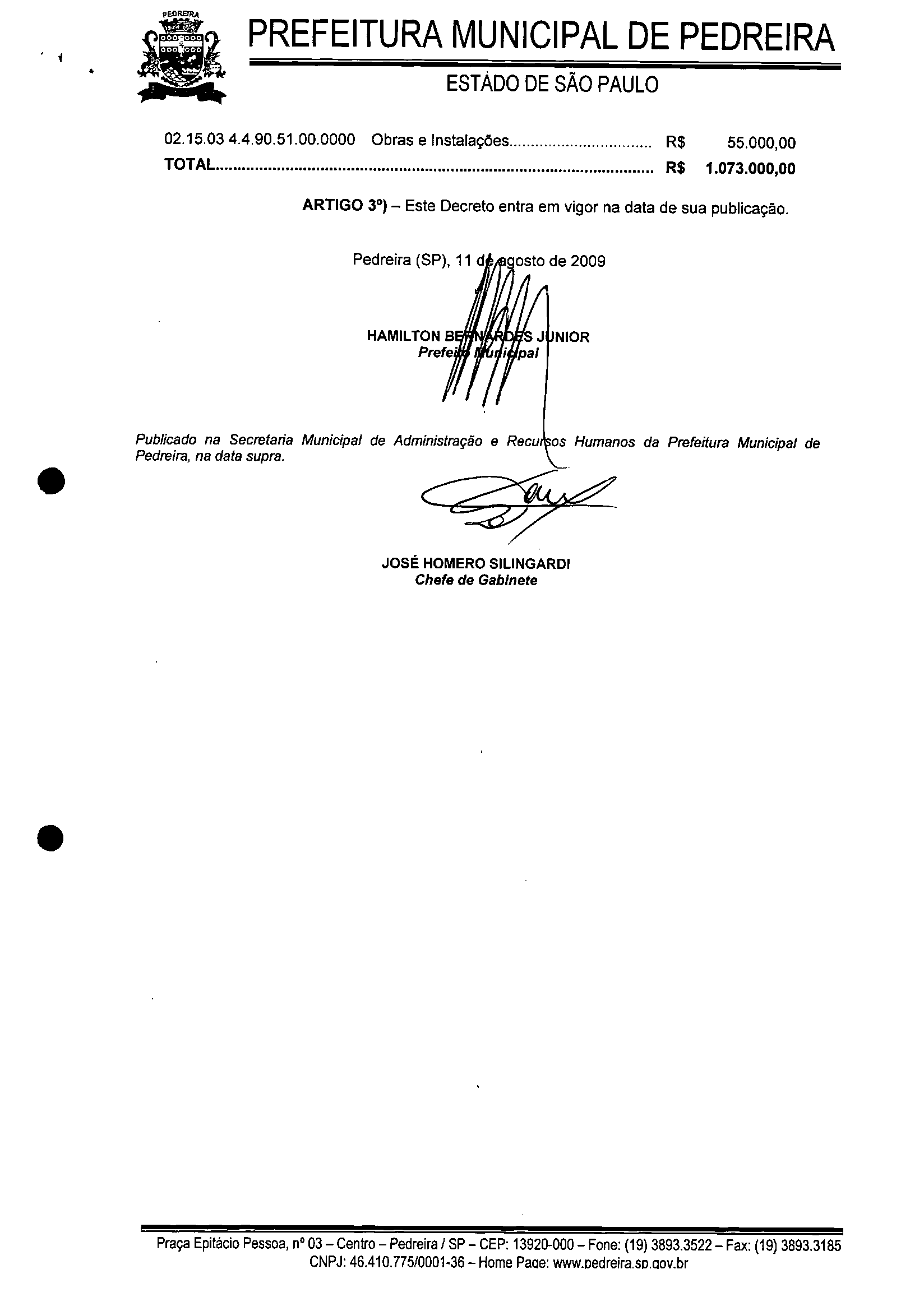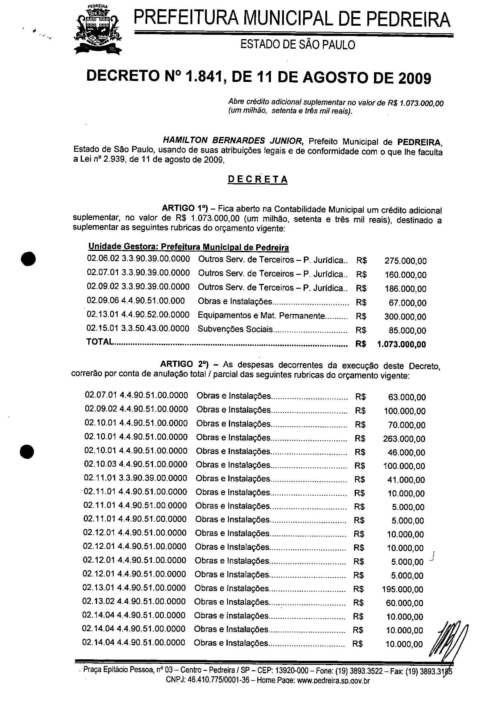 Ementa: Abre crédito adicional suplementar no valor de R$1.073.000,00 (um milhão, setenta e três mil reais).