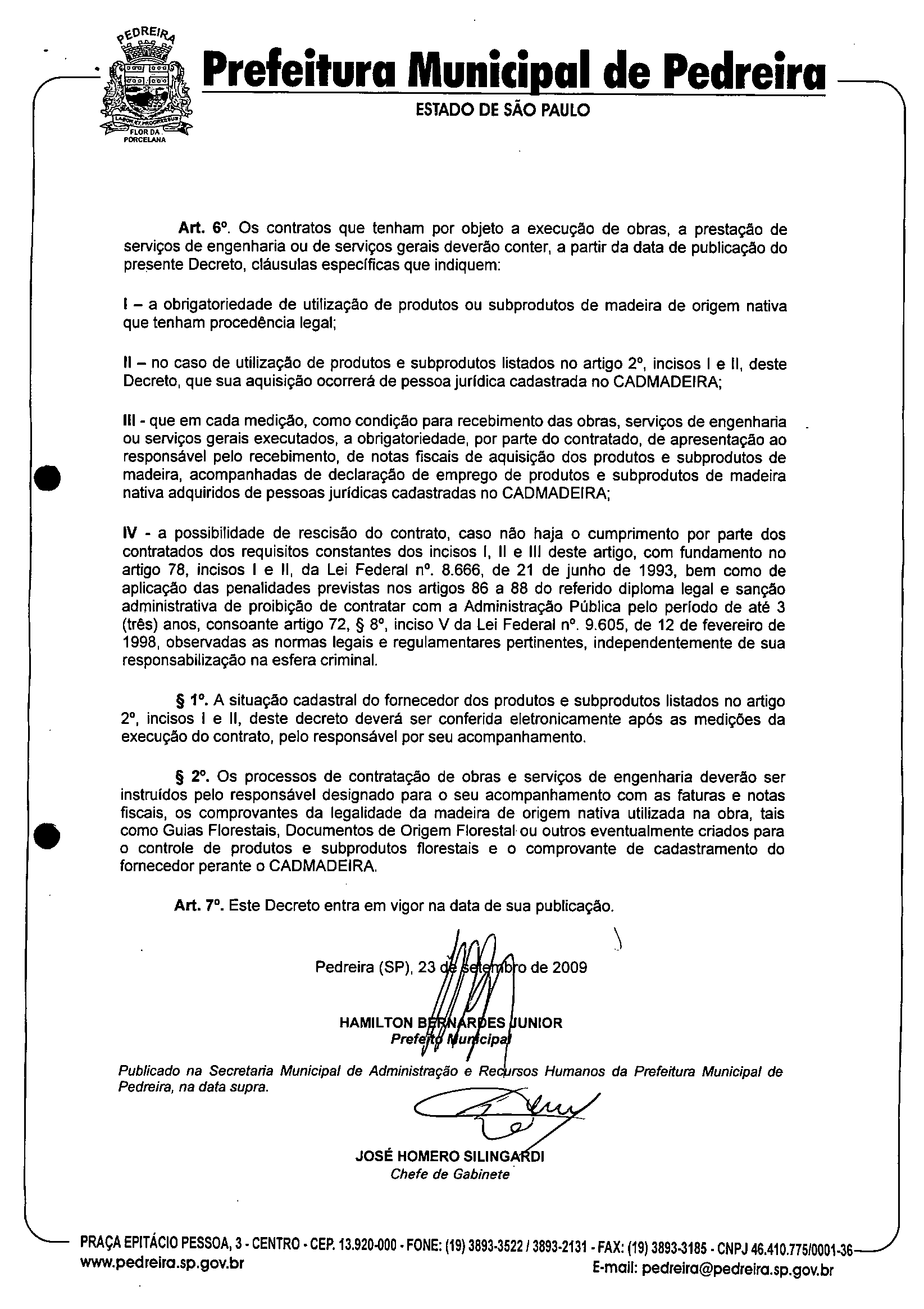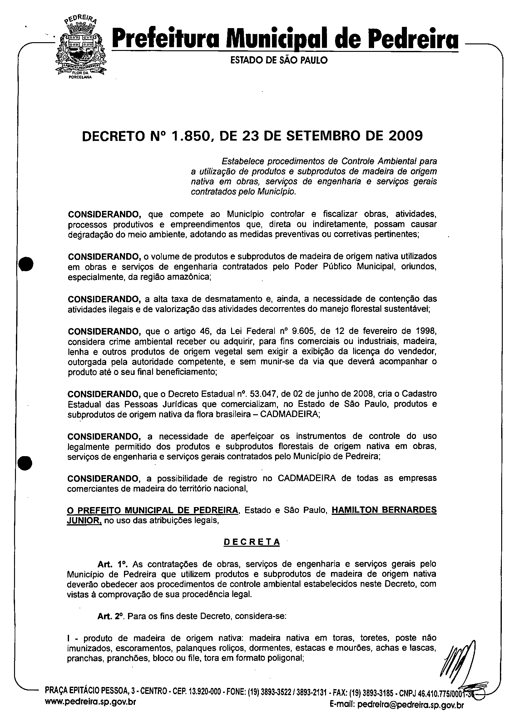 Ementa: Estabelece procedimentos de Controle Ambiental para a utilização de produtos e subprodutos de madeira de origem nativa em obras, serviços de engenharia e serviços gerais contratados pelo Municrpio.