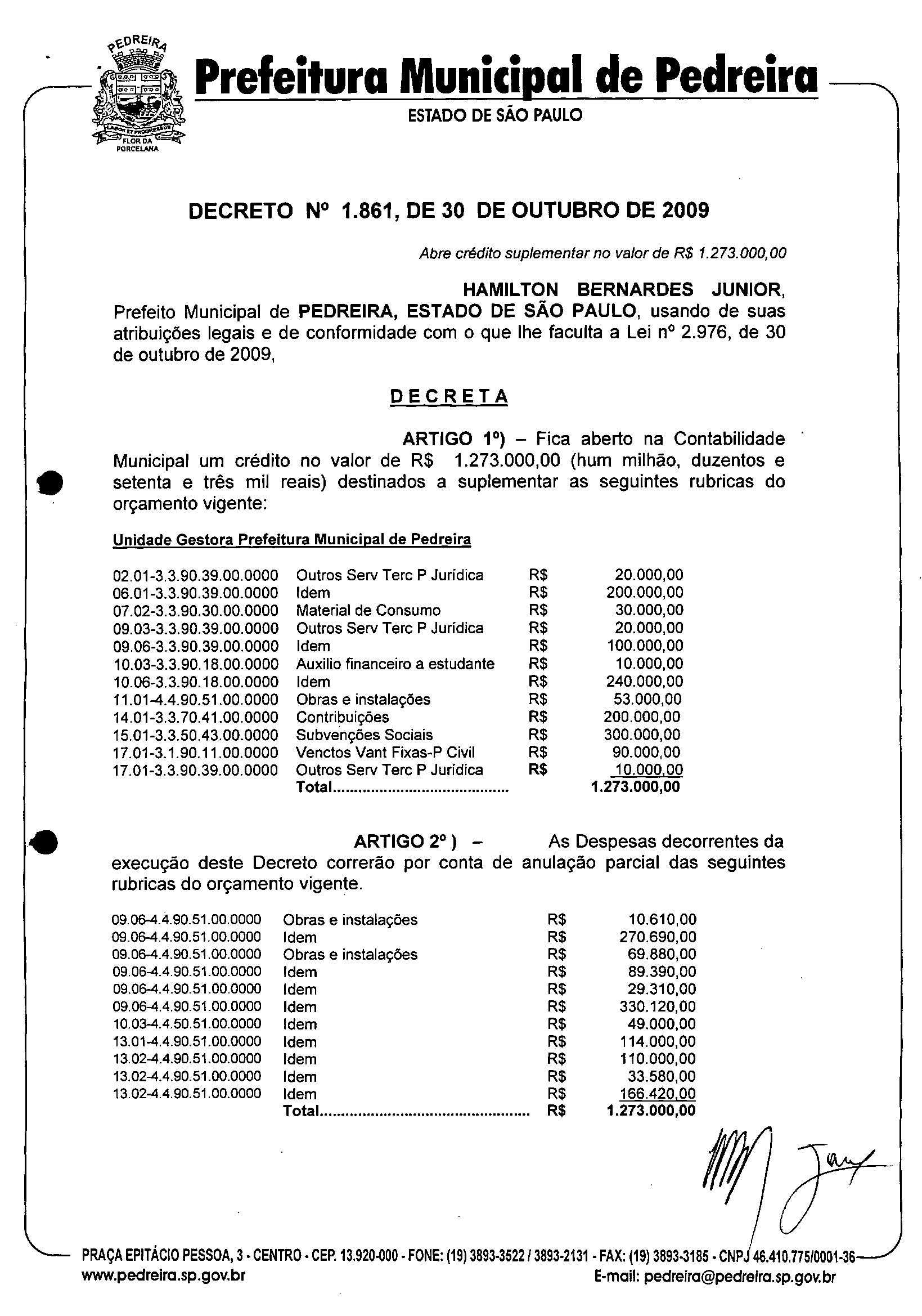 Ementa: Abre crédito suplementar no valor de R$ 1.273.000,00