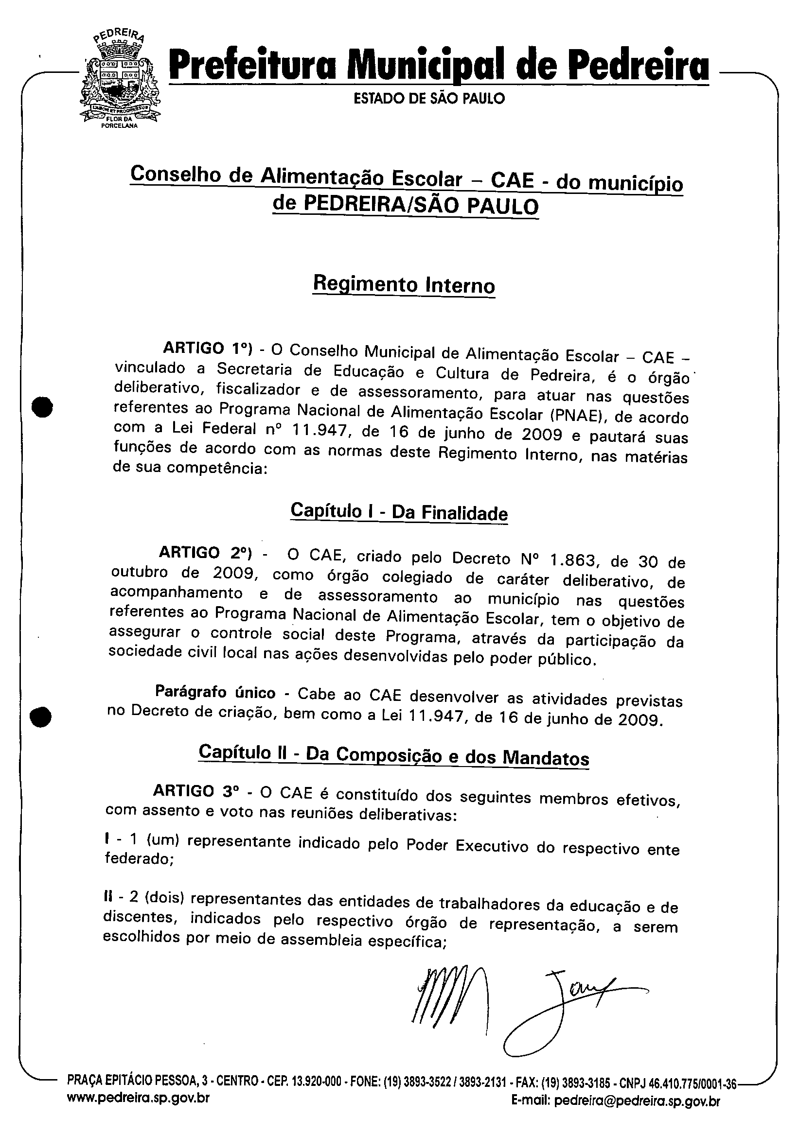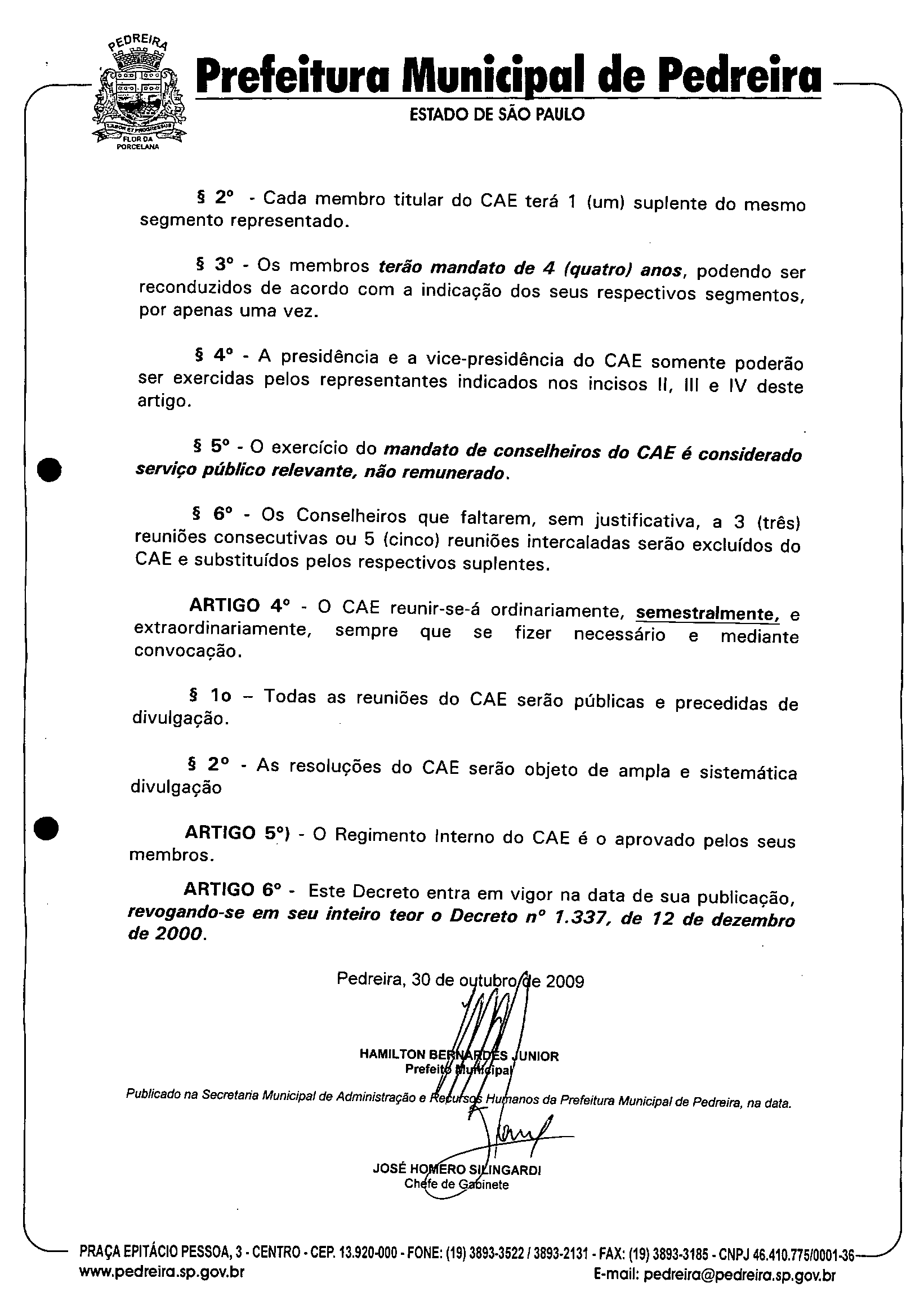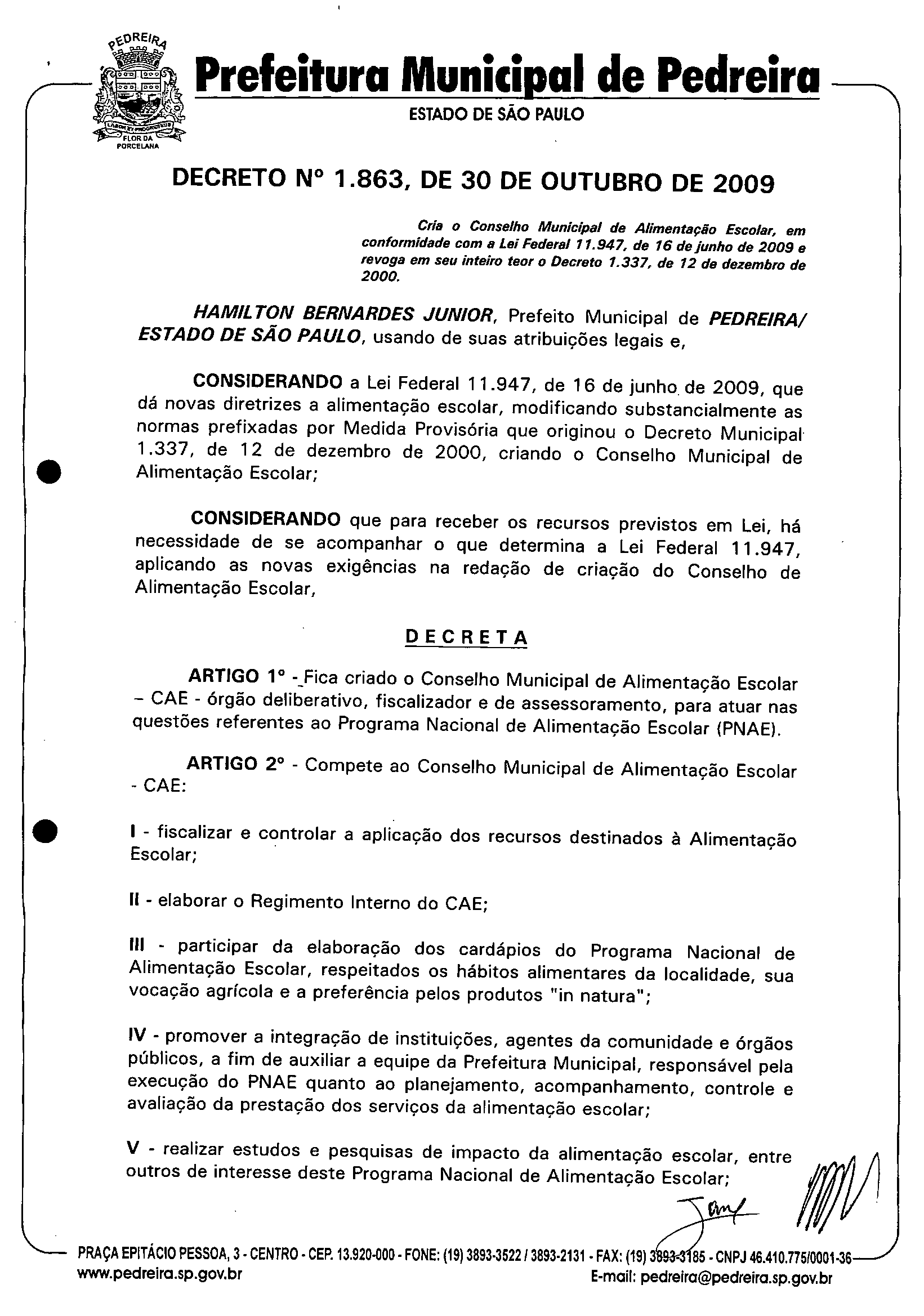 Ementa: Cria o Conselho Municipal de Alimentação Escolar, em conformidade com a Lei Federal 11.947 de 16 de junho de 2009 e revoga em seu inteiro teor o Decreto 1.337, de 12 de dezembro de 2000.
