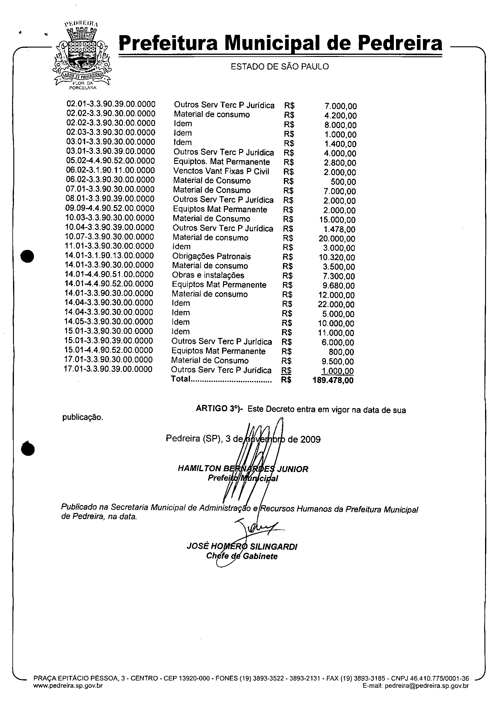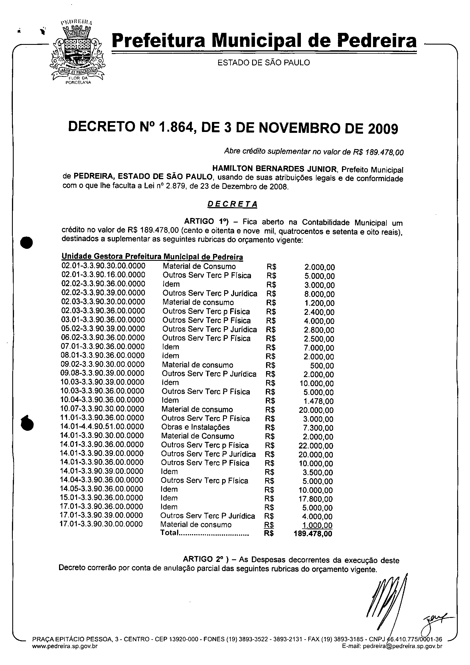 Ementa: Abre crédito suplementar no valor de R$ 189.478,00