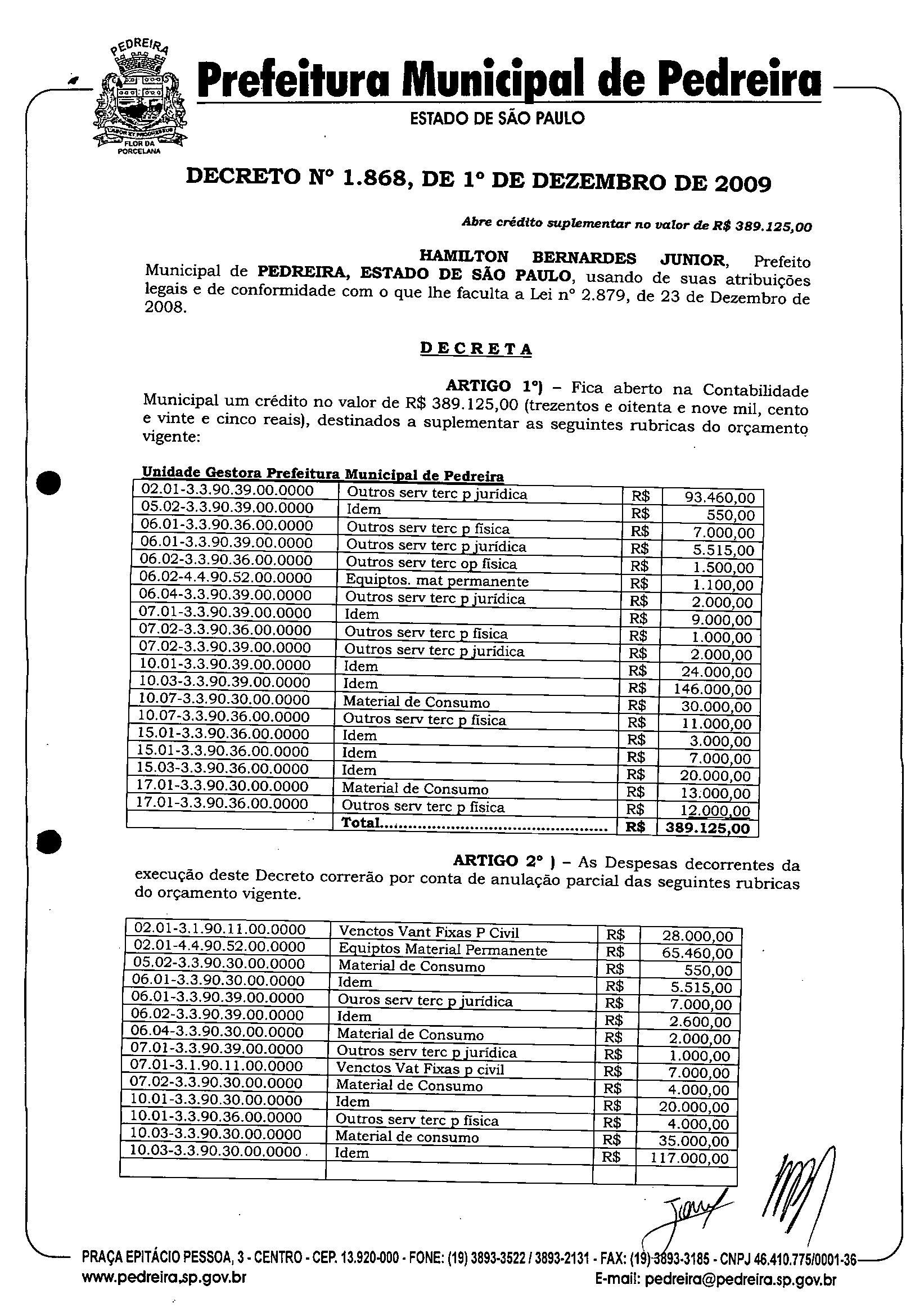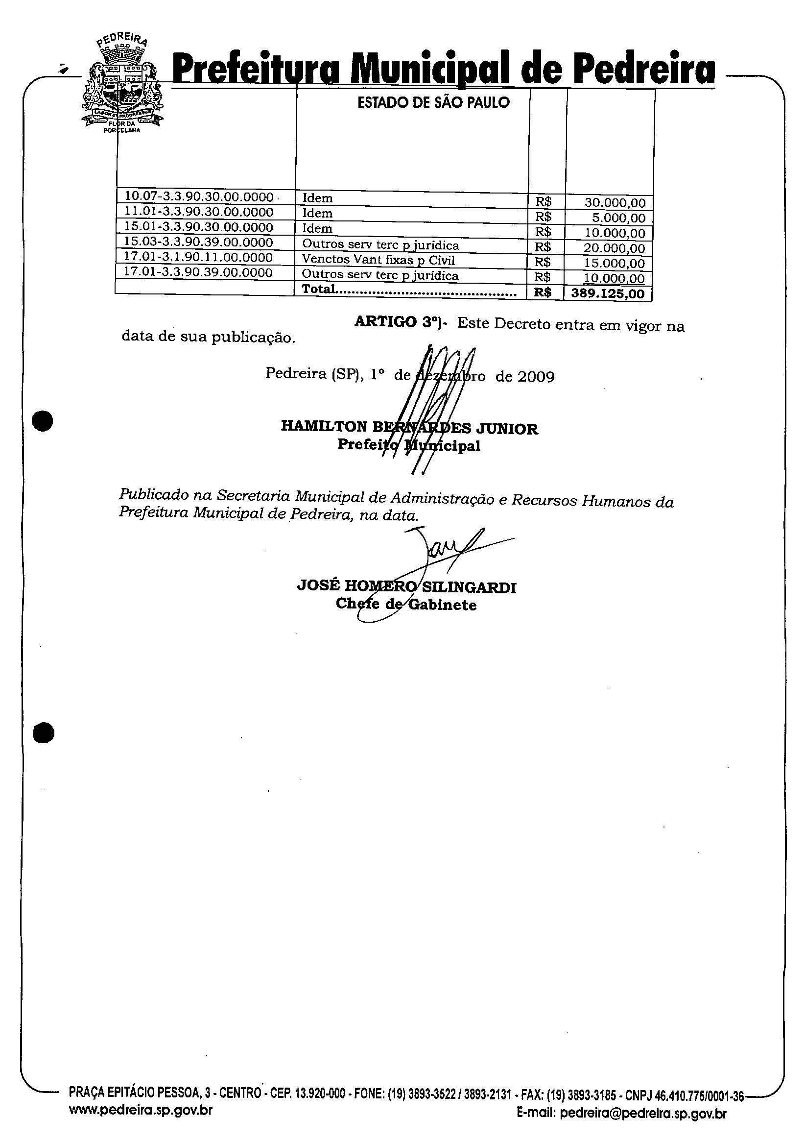 Ementa: Abre crédito suplementar no valor de R$ 389.125,00